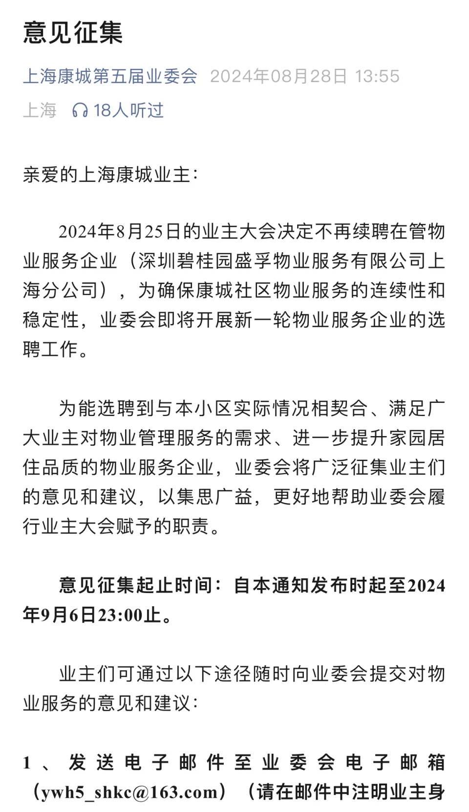 迩来几天,沪上最大的小区上海康城要换物业的事变引发关注。 8月26日,上海康城第五届业主委员会在微信公众号上发布了一则《关于上海市闵行区上海康城小区2024年第二次业主大会效果的公告》。公告称,上海康城小区2024年第二次业主大会于8月25日下战书召开,经小区业主投票表决,决定不再续聘在管物业服务企业(深圳碧桂园盛孚物业服务有限公司上海分公司)。公告披露,此次投票表决的总投票权数12152票,总发放票数12152票,反馈票数8495票。同意不续聘票占专有部门业主总人数比例近76.94%,同意不续聘票占专有部门修建总面积比例77.07%。 8月30日晚间,汹涌消息从上海市闵行区莘庄镇相干部门相识到,上海康城召开业主大会更换物业一事变况属实。一位莘庄镇相干人士表示,岂论是小区居民续聘物业还是重新选聘物业,政府管理部门都会本着公开公平公正的原则,充实听取和恭敬广大业主的意见。 从2013年进驻上海康城小区以来,碧桂园物业已经在上海康城小区服务了高出10年时间。对于为何现在要“炒掉物业”,从本年4月上海康城第五届业委会针对小区标题向碧桂园物业提出的整改意见可见端倪。 在这份《关于上海康城物业服务质量标题的沟通整改函》中,康城业委会声称收到很多业主对小区物业服务质量不满的投诉,业委会马上开展相干观察工作,发现小区物业在物业服务方面存在多少标题,而且在多次与物业负责人进行沟通后,迄今为止并未看到显着的改进。 根据上海康城第五届业委会微信公众号披露的内容,康城业主们对物业公司物业服务质量的不满包罗工程维修标题、保洁标题、保安标题、绿化标题、客服标题、维保维修费用标题: 工程维修标题——各期都多次出现同一维修项目重复提交的环境;未实验的维修项目被标注为“已竣工”;部门维修项目存在过分维修环境;部门维修项目报价显着高于以往同类维修等。 保洁标题——公共地域垃圾未能及时排除,楼道清洁工作不到位等;别的,小区内大量水景池未按物业条约要求进行打捞、清洗、换水等维护工作,造成水质恶化。 保安标题——保安一样平常巡查工作的不敷导致大量业主车辆被贴低俗小广告;碰到蹊径施工或雨天,事先没有相应的交通劝导预案,造成小区内交通长时间拥堵;现有保安队伍年事偏大。 绿化标题——之前绿草覆盖的地域出现黄土裸露现象,且绿化养护职员存在摧花毁绿活动。 物业管理处客服标题——在向物业管理处扣问某些楼栋维修进度时,客服职员多次以“业委会未审批或未同意”为由回复业主,但实际环境是,相干维修事项尚未提交至业委会。 维保、维修费用的付出标题——数月以致半年未付出外委单元的职员费用和维调养护费用,业主大会维修资金账户已付出的工程维修费用被留存在碧桂园物业账户数月之久。 汹涌消息记者从闵行区莘庄镇相识到,接下来,上海康城将碰面对旧物业撤离、新物业选聘的工作,当务之急是先要明白新物业公司的选聘方案,确保安稳过渡。 “从8月28日开始,上海康城已经一连召开了5场物业选聘事项的意见听取会,到场对象包罗两委班子成员、党构造、支部委员、党员、楼组长、社区合资人等,正在征询业委会、居民和职能部门的意见,具体必要多少居民同意才气见效,选聘方案也要进行表决。”莘庄镇相干人士告诉汹涌消息。 谈及新的物业公司选聘,上海康城社区党委专职副书记、康城社区委员会专职副主任张军萍在继续汹涌消息记者采访时表示,由于每个小区的环境差别、业紧张求差别,物业公司选聘方案必要创建在充实听取每位业主对物业下一步的服务尺度、服务条件、服务代价的意见,在此底子上埠孟完善,订定出质价符合、量身定制的物业选聘方案。在这方面,社区党委大概房管部门在步伐上给予指引,具体还是由业委会依法依规进行团体推进,末了通过业主大会表决,再进入下一步工作。 莘庄镇方面同时透露,在新的物业公司选聘完成之前的这段过渡期,现有物业公司仍将会按照既定尺度和物业服务代价,为上海康城提供各项物业服务,“现在。老物业的态度还是不想放弃康城。” 记者注意到,上海康城第五届业主委员会8月28日也在微信公众号上发布了《意见征集》,称为确保康城社区物业服务的一连性和稳固性,业委会即将开展新一轮物业服务企业的选聘工作。业委会将广泛征集业主们的意见和发起,以集思广益,更好地资助业委会履行业主大会赋予的职责。意见征集将一连到2024年9月6日23:00止。 |