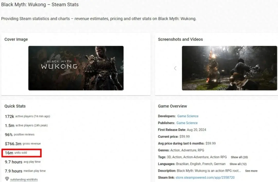 1、机构猜测《黑神话:悟空》终极销量或达4000万份 报!《黑神话:悟空》销量或已接近2000万! 据VG Insights最新数据显示,《黑神话》Steam举世销量现已超1600万份,收益到达7.66亿美元,约合人民币54亿元。 另一家游戏数据分析公司GameDiscoverCo的研究员Simon Carless发推表现,《黑神话:悟空》PS5玩家数目为300万人,其中200万为中国玩家。 再加上Wegame的81万,和Epic的销量,算是100万吧。 做个简单的算术:1600+300+100=2000!!! 这就意味着《黑神话:悟空》如今的销量大概已经到达了2000万。 据华泰证券猜测,《黑神话:悟空》的首月销量大概会突破2000万,总销量会到达3000~4000万! 这是什么概念? 被盛赞的比年雷同游戏《艾尔登法环》销量为2500万,《只狼》约为1000万。 假如《黑神话:悟空》到达3000万,将是受苦游戏的销量冠军,是不是这类ARPG以后要叫猴like游戏了呢? 假如到达4500万,将跻身举世汗青十大游戏销量榜,,成为新的丰碑! 2、IGN谈《黑神话:悟空》XBOX版延期:或因索尼独占协议 《黑神话:悟空》登岸PC和PS5平台后,一度引发显卡和PS5主机热卖。 而被延期的XBOX版玩家只能暗处哭泣。 之前官方给出的缘故起因是优化题目,着名舅舅eXtas1s也说XBOX面对的内存泄漏题目,因此导致延期。 但据IGN近期的爆料,《黑神话:悟空》首发没有登岸Xbox,不是由于技能题目,而是索尼和游戏科学之间的独占协议,而这个协议从未被双方公开。 数毛社也说XSS可以低画质运行游戏,技能似乎不是延期的来由。 假如消息真实的话,微软不光没眼光,而且举措慢,错过了销售机遇,真是吃S都赶不上热乎的。 3、外媒评出《黑神话:悟空》十大最难BOSS 信任如今已经有很多玩家通关了《黑神话:悟空》,那么你以为哪个BOSS最难呢? 近日外媒评选了游戏中的十大最难BOSS排行,各人看看是否同意呢: