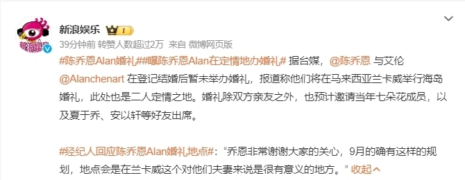 近来,频繁有陈乔恩和艾伦疑似婚纱照流出,有网友爆料两人即将补办婚礼,消息传出后引起了超多网友围观。陈乔恩作为偶像剧女王,曾经主演过《王子变田鸡》、《命中注定我爱你》等爆款偶像剧,即便是客串《新笑傲江湖》,也能依附精彩的演技碾压女主,无论是颜值还是气质、性格,都非常讨喜。 除了奇迹得意,陈乔恩也于2019年邂逅了本身的真命天子,并且于2022年领证完婚,可谓是奇迹爱情双得意。陈乔恩出道早期与霍建华因戏生情,两人各方面都备受看好,但无奈由于性格缘故原由分手收场,霍建华更是灵敏与林心如步入了婚姻殿堂,与陈乔恩复合无望。 直到《女儿们的爱情》第二季时,陈乔恩作为嘉宾加盟,在节目中与素人艾伦开始了解接触,节目收官时,两人决定进一步发展,以情侣身份正式开始来往。在外界看来,陈乔恩足足比艾伦大了9岁,不管是年事还是外交圈都相去甚远,应该是无法恒久的。 但是节目播完后,陈乔恩艾伦时长秀恩爱,并且于3年后正式领证完婚。正常说来,陈乔恩和艾伦是在节目中认识的,无论是婚前还是婚后都没有掩蔽过,应该是无惧这段感情出如今大众视野的。而今修成正果,应该有一个隆重的婚礼才对,毕竟两人都不是平凡人。 就在各人以为陈乔恩和艾伦大概率是不会举行婚礼了的时间,一则名为“陈乔恩艾伦婚礼”的词条被推上热搜,有着名媒体爆料陈乔恩和艾伦即将补办婚礼,并且会约请亲朋好友到现场举行观礼,而偏重提到了陈乔恩的圈内好友七朵金花以及安以轩等明星,观礼嘉宾非常豪华。 而随后媒体也求证了陈乔恩工作室,其经纪人明确回应到“乔恩非常谢谢各人的关心,9月简直有如许的规划,所在会是在兰卡威这个对他们夫妻来说是很故意义的地方”,非常坦然地公布了喜信。 要知道,陈乔恩出道早期与赵小侨、屈旻洁、赖薇如等人并称七朵金花,固然除了赵小侨外,别的几人并不着名,但是与陈乔恩的友谊不停延续,关系有多好不言而喻。除此之外,陈乔恩还与安以轩、辰亦儒的老婆曾之乔关系要好,应该也在约请的名单之上。 从台湾转战内地后,陈乔恩也结识了不少朋侪,此中与谢娜、奚梦瑶关系最为密切,如今谢娜、奚梦瑶已经先后升级当妈,陈乔恩终于劳绩本身的幸福,这两人大概率回到现场见证属于陈乔恩的幸福。固然,在婚礼没有举办之前,一切都还只是推测,谢娜和奚梦瑶毕竟会不会到现场还得看她们的行程。 值得留意的是,不管有多少明星会到达现场举行观礼,都注定陈乔恩和艾伦的婚礼会非常隆重且审慎。此中,陈乔恩在娱乐圈打拼多年,财力和人脉毋庸置疑,更关键的是艾伦的身份也不简单,其父亲是马来西亚著名的房地产大亨,在富豪榜都排得上号的那种,艾伦是十足的超级富二代,现场有多豪华可想而知。 末了,婚姻不光与年事无关,也与钱多钱少无关,陈乔恩和艾伦由于节目而结缘,不管是爱情期间还是婚后势必会受到更多的质疑和磨练,两人可以或许清除万难走到一起,已经非常贵重,祝福他们! #陈乔恩Alan婚礼# |