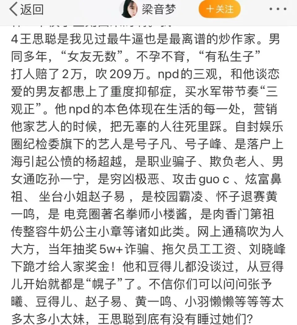 雪梨XD的瓜固然是个乌龙,却带出一系列更细思极恐的瓜。 1微博上一个名叫“梁音梦”的号,整理出了许多信息,直指王思聪是“炒作大家”,喜欢同性却女友不绝。而所谓的网红女友,只是他play中的一环,乃至是他资本版图中的一环。 王公子真正的创业项目根本不是电竞跟熊猫TV,是炒作网红(包罗网红艺人)。 迩来天天热搜的孩儿她妈黄一鸣就是王思聪炒作出的网红,另有之前的“战神”孙一宁。王思聪所谓的女友,从豆得儿之后,都是炒作。 梁音梦说本身的消息来路非常靠谱,疑似泉源于熟人大概王公子的身边人。不管这话是不是吹牛,能在网上这么正面刚王思聪,却既没被禁言也充公到状师函,只有两种可能,要么所言为真,且背后有高人;要么王公子老矣,回旋镖扎本身身上了。 假如梁音梦的信源为实,倒是合明白答了一个狐疑公众已久的题目,就是为什么王公子不爱明星爱网红。并且都是不知名网红,后期更越来越方向于太妹、低学历网红。 一任连一任,起于日本喂鹿,终于豪宅睡房打卡。连爱情曝光和竣事的流程都似乎经心计算过一样。 吃了跟王思聪爱情红利的网红,成名后灵敏开启卖货之路,之前是淘宝电商,如今是网络直播。 前任一旦开始有了流量,下一任新女友就出现了,这事儿确实非常奇怪。 王思聪历任女友里,只有张予曦是艺人,但成名之路与那些网红女友也如出一辙。 瑞丽封面女郎出道的张予曦在成为王思聪女友之前,仅演过两部剧。 2014年12月20日,张予曦跟王思聪出席万达武汉影戏乐土开业及汉秀首演发布会,自称是王思聪的女友 ,仅仅一个月之后,两人官宣分手 。似乎谈爱情主要是为了给万达的财产站个台。 不外成为“前女友”后,张予曦的影视资源肉眼可看法好起来了。之前5年只有两部剧,之后仅2016年,就上映了7部作品。 2在资本圈,流量就是钱。 爱打游戏的王公子似乎把人生也活成了一场游戏,过完一关再一关,每一关都留下一个公众叫得上名字却认不出脸的女网红。 她们中有些成绩了本身庞大的商业帝国却死于过度膨胀,比如雪梨;有些在娱乐圈不上不下,比如张予,更多的是在某音直播带货,闷声发大财。 假如梁音梦所言为实,那么在这些女孩打怪升级的路上,王思聪名为前男友,实为幕后推手。而孙一宁与黄一鸣则属于这条网红生产线上的主推产物,王思聪不吝利用伤敌一千自损八百的方式,助她们成为头部带货网红。 孙一宁的故事就不赘述了。初中毕业开始混社会,最开始当网红的时间,主打一个收钱收物不办事,暴雷退却网。厥后换到某音平台东山再起,摇身一变,成了王思聪追不到的女人,流量飞升。 天天呆在热搜上的黄一鸣更古怪。与孙一宁一样,也没有经过传统的网红考证之路,跳过所有科目,横空出世,自称生了王思聪的孩子。 这件事反反复复已经闹了几个月,不绝反转再反转,每一次出来的消息都云山雾罩,牵着网友的鼻子遛。 最新消息是王健林看到闪闪叫爷爷的视频,自动出头认了黄一鸣跟孩子。一年给300万,还送了别墅。 黄一鸣搬进新别墅做直播,但很快就被房产中介扒出来别墅是租的,而且租金不高,疑似黄一鸣自导自演。 至于王健林认亲,更是全凭黄一鸣粉丝的一张嘴,黄一鸣还亲自点了赞。 倒是对应上了梁音梦说王思聪公司养了8000个营销号。我琢磨着显着是人家的家事,这些“网友”咋就能说得跟本身的家事一样,有鼻子有眼。在纸媒期间,我交这种稿子给主编,主编都得反问:“你睡人家床底下写的?” 3这件事现在疑点越来越多。 一方面是王家的态度,关系到下一代这么大的事,上上下下保持沉默沉静,着实还蛮有数的。 别的像黄一鸣这么高调的网红,该说的不应说的话都说了,关于亲子判定这个事她却一句都没提。 网友可万万别天真地以为大家说长得像王健林,老王就冲动去认亲。编故事也要多看一下权门电视剧。越有钱的家庭,越是法大于情。真要认亲,肯定是助理跟法务出头谈,亲子判定更是必做。 第三个,也是我以为最大的一个疑点,是黄一鸣给女儿闪让开了账号,现在已经吸粉三十多万。让孩子从婴幼儿时期就负担起名利的重任,前段时间还由于接广告被罚了。 有网友质疑为什么要让闪让开账号,黄一鸣直接表现就是想让女儿做网红。 一边说王家已经认亲,一边让女儿顶着王思聪私生女的名头出道。每次看到闪闪天真天真的笑容被妈妈拍了放在网上,下面吃瓜网友各种玩梗,我都以为这件事变好残酷。 我对网红这个行业没有任何鄙视,乃至我本身也直播卖东西,但这种职业规划,是属于成年人的自主选择——你想做、能做,乐意负担结果。 假如谁让我的孩子一两岁就开始在网上接受网友的审视,进入这个不可控的染缸,我得跟他搏命。正如《楚门的天下》里的那句台词:你无权把一个生命,当作一场秀。 假如真像黄一鸣团队暗示的,私下已经认了,于情于理,万达方面都不可能让才一岁多的闪闪走上网红这条路。 究竟当年老王送小王读的是顶级名校UCL,厥后小王阴差阳错成了“王校长”,慢慢自废武功,老王可能确实管不了了,但那也是他成年后本身的选择。 孩子是孩子,成人是成人,平常人家尚且知道掩护孩子的隐私与童真,何况是王家。王健林固然已经丢掉了首富的帽子,但他上岸早,软着陆乐成,有钱人的帽子是丢不了。 老王家但凡以为这孩子有本身家一点的基因,不管认不认,都不可能放任不管。但假如