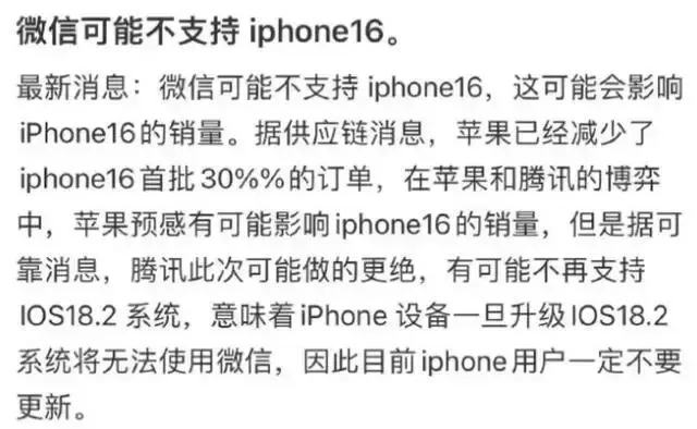 着实这个谎话早在数年前就开始流传,我记得其时公众号赞赏抽成的变乱流传过一次,微信刚推出小步伐的时间也流传过一次。 加上这一次,三次关于 iPhone 下架微信的谎话甚至许多文案细节都是差不多的,很难不让人想到一些别的的因素,究竟 iPhone16 确实就要发布了,对于销量的影响肯定有一些的。 着实稍微有一些思索本事的朋侪想想也知道,iPhone 怎么大概下架微信,微信又怎么大概会取消 iPhone 版本? 这种做法只会让苹果失去大量的中国用户,让腾讯失去大量的苹果用户,这种两败俱伤的变乱,哪怕是库克乐意干,股东们也会直接否决,究竟着实是太离谱了。 着实我对这个消息并不感到惊奇,让我感到惊奇的是居然有这么多人信赖这种谎话,这段时间我的文章和视频品评区被这种二选一的品评给占满了。 估计等 iPhone16 发布之后,又会有一堆人说不支持微信不能买吧。 |