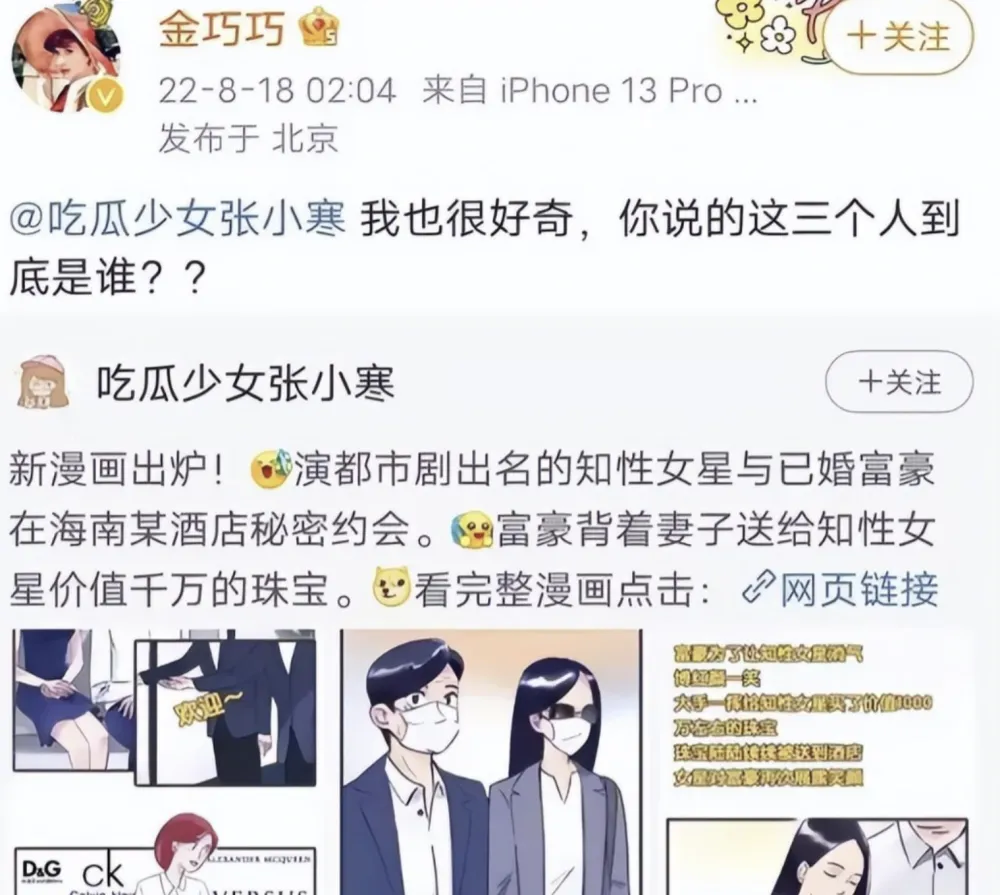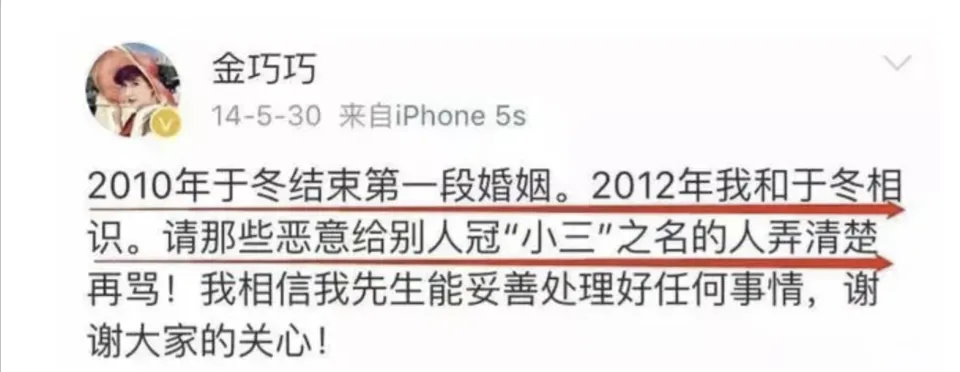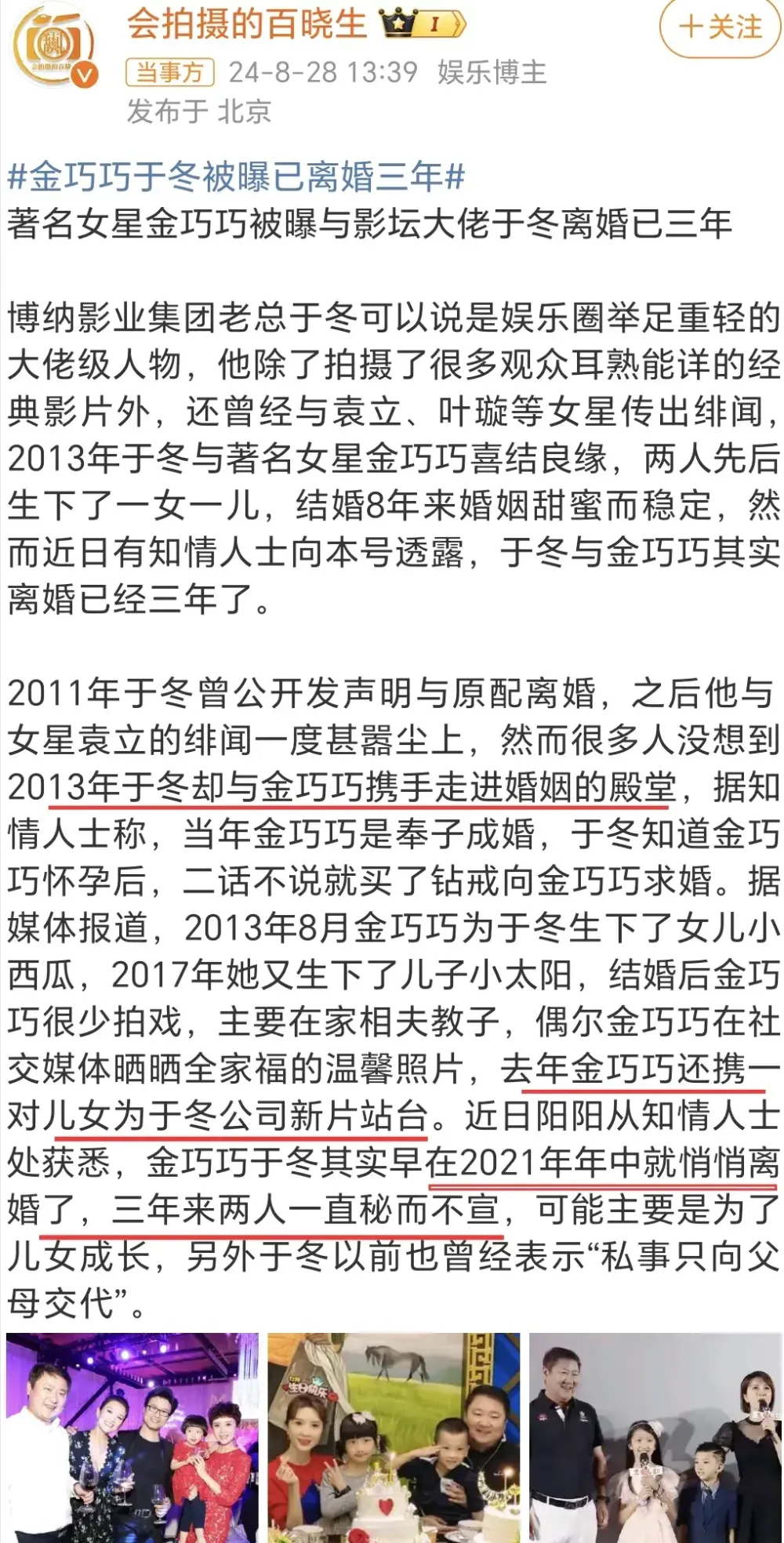 这段时间,金巧巧和于冬被传仳离了,但没有掀起什么波涛。 仳离瓜一句话总结,两人已经于2021年静静仳离,3年来秘而不宣,可能是为了孩子的发展,之后维持夫妻面子帮助站台。 一向爱回应的金巧巧这次选择了缄默沉静。 以前面对雷同的题目,金巧巧是24小时在线,熬夜都要跟网友表明和辟谣。 这一回却一反常态,大概仳离的听说是真的。 不外大众也并不不测,毕竟于冬不管是婚前还是婚后,跟女明星的绯闻都没有停歇过。 比如前两年跟江疏影的绯闻就轰动一时,厥后也是不了了之。 绯闻事后于冬和金巧巧还是继承像恩爱夫妻一样,带孩子出去玩,合体出席活动。 过年过节晒百口福,本年的元宵节金巧巧还带着百口人录了祝福视频。 如果仳离的瓜属实,那么所谓的恩爱夫妻就都是表象,演给各人看的。 实在细究也不是没有蛛丝马迹,比如于冬在公开活动的发言对金巧巧的称呼不是“太太”“妻子”之类的,而是称她为“金老师”。 金巧巧到场《浪姐》险些是一轮游,早早就下线了。 按理来说,在势利的娱乐圈,以金巧巧博纳老板娘的身份,节目组多少都会给点面子,但是她在节目中镜头很少,而且很快就被镌汰了,大概是圈里人早已知道他们仳离的变乱。 不知道他们仳离的缘故因由,不外联合于冬婚后的绯闻以及他第一任妻子臧黎璐曾经的控告大概能找到答案。 于冬跟很多资本大佬一样,在发迹之前有一个糟糠之妻。 他们的爱情故事就是白富美爱上穷小子,臧黎璐的家境要好过于冬,父亲是影戏发行从业职员。 厥后于冬创业所需的资金、人脉和资源都跟岳父家不无关系。 刚完婚时他俩住的60平方的房子是臧黎璐贷款买的,每个月要还3000块的房贷。 创业时期,臧黎璐不但要为公司随处疾驰,还要操持家务和照顾孩子。 公司步入正轨,奇迹越做越大,臧黎璐回归家庭,于冬则是享受台前风光。 接着就是很狗血套路的故事,“男子有钱就变坏”。 于冬回家的时间越来越晚,厥后就干脆不返来,传出来的绯闻也越来越多,乃至在臧黎璐怀二胎的时间还有小艺人半夜三点打电话骚扰她,这让她感到非常地痛楚。 臧黎璐没办法继承维持无爱的婚姻,选择仳离,两人算是和中分手。 仳离后不久就爆出于冬跟金巧巧奉女结婚。 实在其时跟于冬传绯闻的还有袁立,但末了是金巧巧上位乐成。 完婚的消息爆出臧黎璐坐不住了,由于仳离的时间于冬说不会再完婚,再加上之前于冬答应公司上市一年后给她2000万,但效果只给400万,臧黎璐愤而开撕,将于冬告上法庭,要求重新分割产业。 他们婚姻破裂的缘故因由才正式公之于众。 金巧巧因而被冠上“圈外人”的名头。 金巧巧很在意各人这么说她,以是经常为自己澄清和辟谣。 比如放话让各人找出她当圈外人的证据,找出来她就给100万。 再比如多次跟各人梳理她和于冬的感情线。 不知道她是记不清晰了还是编错了,时间没有同一好,出现前后矛盾的环境。 偶然候说于冬是2009年仳离,偶然候又说是2010年,但是臧黎璐的百科上写的是2011年离的婚。 不管本相怎样,臧黎璐都成为了已往式,她才是光明正大的于太太。 为啥于冬身边的莺莺燕燕这么多,最终选择了金巧巧。 大概是由于金巧巧身上的单纯、淳厚和纯粹,这是于冬自己说的。 金巧巧点像“笨蛋美人”,袁立就爆料过金巧巧人不坏就是有点笨,对朋侪还是很仗义的。 为了资助好友傅艺伟戒毒,她在国外听信一个华人医生开的偏方,效果过海关的时间被检查出偏方含有违禁药品被扣下了。 和臧黎璐打仳离官司的时间,于冬被分走了一半的身家,跟他有过厚交的女明星都阔别了他,金巧巧倒是不绝不离不弃,是有真情在的。 而且金巧巧性格温暖,身居高位但懂得适时弯腰,为人也低调,很少听到她以总裁夫人的身份压人或者耍大牌。 这些都成为击中于冬的点。 更紧张的是金巧巧能忍。 忍受于冬的绯闻,还要给他忙前忙后辟谣。 不敢想象如果换作是袁立会怎样,怕是直接在网上开撕莺莺燕燕,闹得人尽皆知了吧。 走到仳离这一步,大概是金巧巧也终于了解到了臧黎璐的感受,累了倦了,不想再委曲叱责继承忍下去了。 也大概是真的不爱了。 放眼娱乐圈,大佬的太太欠好做,能恒久坐稳这个位置的,都是狠人一个,要么能忍,要么够狠,要么二者兼具。 看大导演的太太团就知道了。 徐帆认证过往冯小刚身上贴的莺莺燕燕一大把,她也没办法不绝看着他,不外没关系,他们家是男的,人家乐意给他占自制那就占呗。 她的这套所谓的护犊子理论任谁看了不得说一句心胸真宽阔。 看似漂亮,但实在内心介意得要死。 厥后认可偶然候恨冯小刚恨得不可,以为夫妻就是正当的对头↓ 但又狠不下心分开能怎么办?忍呗。 忍凡人之所不能忍,风光背后尽是凄凉和无奈。 蒋雯丽跟徐帆有相似的履历,不外她比徐帆态度更加倔强一点。 顾长卫在拍《孔雀》和《立春》时两度和张静初传出绯闻。 第一次蒋雯丽忍了,第二次忍不了,直接把张静初的戏份险些删了个精光。 在发布会上面对记者为什么把戏删掉的提问,作为导演的顾长卫支支吾吾,不知怎样作答。 反倒是一旁的蒋雯丽轻飘飘地说,为了整部影戏的节奏。 被蒋雯丽敲打事后你以为顾长卫这就诚实了? 没过两年他又陷入“车震门”,跟秘密女子在车上密会几小时,车停在小胡同里,车窗遮挡精密,引人无穷遐想。 蒋雯丽没有像上回那样使出雷霆本事,而是选