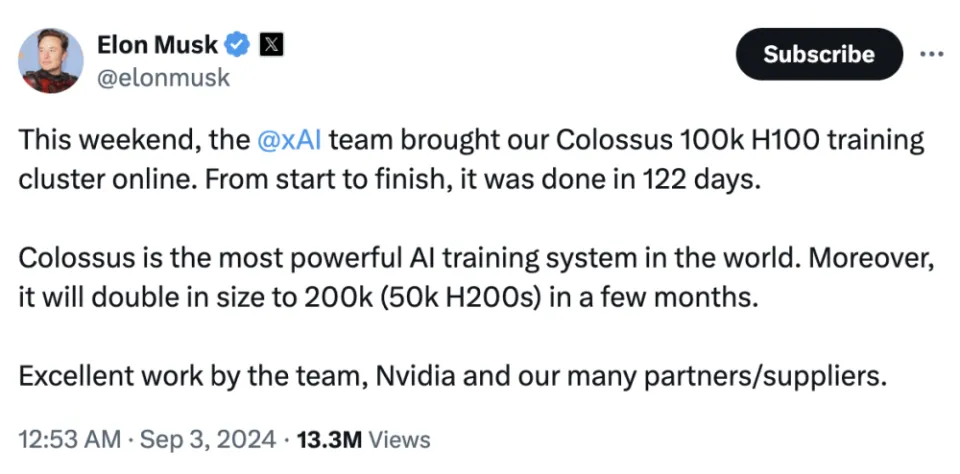 智东西(公众号:zhidxcom) 编译 | 吴浪娜 编辑 | 漠影 智东西9月4日消息,据Business Insider、《财产》杂志报道,埃隆·马斯克(Elon Musk)周二在社交平台X上公布,其AI初创公司xAI于上周末上线了名为“Colossus”的超等盘算机。 该集群拥有10万块英伟达H100处置惩罚器,是天下上最强盛的AI训练体系。若xAI可以或许获得5万块英伟达新推出的H200系列处置惩罚器,Colossus的规模将在几个月内扩大1倍。 Colossus从筹划到完成仅用了122天,将被用于训练xAI的大型语言模子Grok。马斯克还说,盼望在12月发布Grok-3。Grok与各人熟知的GPT-4是竞争对手。 ▲马斯克在X上公布Colossus已上线。(图源:Business Insider) 一、10万块H100处置惩罚器,xAI通过特斯拉间接保障芯片供应Colossus搭载了10万块英伟达标准Hopper H100处置惩罚器,这是任何其他单个AI盘算集群都无法比拟的。 高性能GPU是强盛AI模子所必须的盘算本事来源。 马斯克估计,如果xAI可以或许获得5万块英伟达新推出的、更先辈的H200系列芯片(其性能约莫是前者的两倍),Colossus的运算本事将在几个月内增长1倍。 马斯克于2023年7月创建了xAI,直到本年6月才选定美国孟菲斯作为Colossus的创建所在。Colossus仅用122天完成上线,创建速率可谓惊人。 在X上,英伟达数据中心账户回应马斯克的帖子称:“令人高兴的是,天下上最大的GPU超等盘算机Colossus,在创记载的时间内上线了。” 自2022年底ChatGPT发布以来,AI的炒作热潮让各家公司争相抢购英伟达的芯片。由于需求激增和供应受限,导致芯片短缺。 只管获取芯片并不轻易,但各家公司仍会想各种办法来确保芯片的供应,并将其投入利用,以便在竞争中领先对手。 马斯克作为英伟达的重要客户,承诺仅特斯拉一家本年就会在其硬件上泯灭30亿到40亿美元。 特斯拉将英伟达已经交付给它的AI芯片转手给了xAI,在芯片供应方面xAI获得了先发优势。 二、Grok-3或将成为最强盛AI,特斯拉大概投资xAIColossus将被用于训练xAI的大语言模子Grok-3。 “我们盼望能在12月发布Grok-3,到当时,Grok-3应该是天下上最强盛的AI。”马斯克曾在播客中说道。 许多特斯拉专家推测,它终极将为特斯拉的人形呆板人Optimus提供动力。 马斯克对此寄予厚望,以为这个具有战略意义的灯塔项目,每年大概为特斯拉带来1万亿美元的利润。 上个月,Grok-2的早期测试版已向用户推出。 它仅在约莫1.5万块英伟达H100处置惩罚器上举行了训练,但根据一些谈天呆板人排行榜的标准,它已经是功能强盛的AI大型语言模子之一。 风投公司红杉资源(Sequoia Capital)的合资人肖恩·马奎尔(Shaun Maguire)在X上写道,xAI团队如今“可以利用天下上最强盛的训练集群”来构建其Grok谈天呆板人的下一块版本。他增补说:“在过去几周里,Grok-2已经迅速跻身开始进模子之列。” 由1.5万块到10万块,GPU数目增长近7倍,这阐明,马斯克并不计划在开发通用人工智能(AGI)的竞争中向OpenAI屈服。他曾因担心谷歌主导这项技术,而在2015年底资助萨姆·阿尔特曼(Sam Altman)共同创建了OpenAI。厥后他与阿尔特曼发生辩说,如今正再次告状OpenAI。 此外,xAI在5月的B轮融资中筹集了60亿美元,得到了安德森·霍洛维茨(Andreessen Horowitz)和红杉资源等风险投资公司的支持。 特斯拉大概是下一家投资马斯克xAI的公司。 马斯克还谈道,他将向特斯拉董事会发起,就是否向xAI投资约50亿美元举行投票。这一发起受到了许多股东的欢迎。 他曾在X上写道,“我之前说过,特斯拉本年将在AI相干付出上泯灭约莫100亿美元,此中约一半是内部付出,重要是特斯拉筹划的AI推理盘算机和全部汽车中都配备的传感器,以及Dojo(特斯拉定制的AI超等盘算机)。” 三、Colossus规模逾越Meta公司集群,马斯克与扎克伯格打擂台风投公司Air Street Capital的首创人兼普通合资人纳森·贝纳什(Nathan Benaich)不绝在追踪科技公司收购的H100 GPU数目。 他统计Meta共有35万块,xAI有10万块。马斯克的另一家公司特斯拉则有3.5万块。 在7月发表的一篇研究论文中,Meta表现其Llama 3大型语言模子的最大版本是在1.6万块H100 GPU上训练的。 3月,该公司公布“对Meta的AI将来举行庞大投资”,创建了两个各有2.4万块GPU的集群,以支持Llama 3的开发。 这阐明,xAI最新的训练集群Colossus比用于训练Meta最大AI模子的集群要大得多。 这让马斯克得以与硅谷的竞争对手马克·扎克伯格一较高下。 结语:xAI产物战略待清朗,运行Colossus为都会资源增压与大多数AI公司一样,xAI技术的贸易化仍存在很大的不确定性。“xAI可以或许在马斯克的领导下筹集到云云多的资金并取得进展,这令人印象深刻,但他们的产物战略仍不清朗。”贝奈克告诉Business Insider。 Colossus的上线给孟菲斯这座都会带来了机会。市政官员以极快的速率同意了该项目。但它也将给都会的资源带来压力。据市政公用事业部门的官员估计,该体系天天必要多达100万加仑的水来冷却服务器,并且将斲丧高达150兆瓦的电力。只管云云,马斯克以为任何值得做的事变都值得快速完成,以克制落伍于竞争对手。 来源:Business Insider、《财产》 |