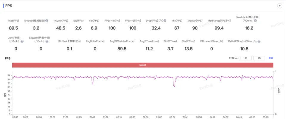 游戏测试环节选择《王者光彩》,支持超高分辨率-极致画质,最高帧率90帧。测试内容是重新到尾都在团战的梦乡大乱斗模式,从Perfdog的帧率图来看,遐想moto S50 30分钟平均帧率89.5帧,团体都比力安稳。