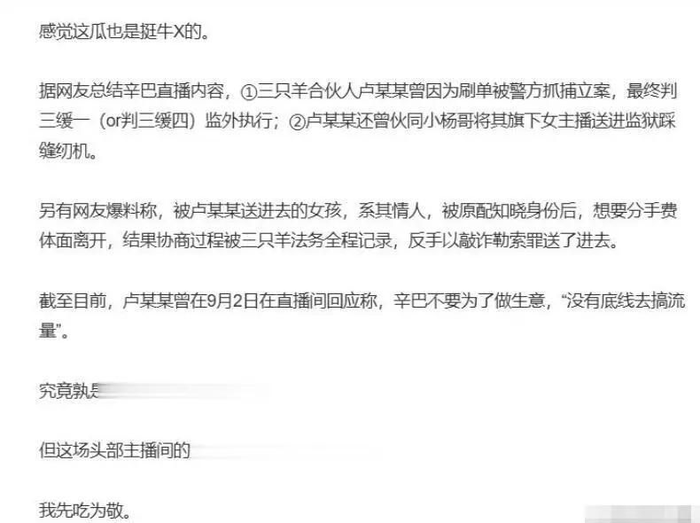 迩来关于直播行业的话题黑白常多的,信赖各人也看到不少这方面的内容了,这段时间有一件事引起了不少人的热议,那就是关于带货主播的话题。 现在带货主播人数非常多,真的是阿猫阿狗都可以直播带货,能带货到一线主播的行列,他们的实力都是很强的,这些主播之间的竞争也变得更大。 好比迩来我们看到两大直播带货的一哥发生了辩论,那就是辛巴和三只羊之间的变乱,因由是两人都卖了大闸蟹,辛巴固然自制,但是三只羊更具性价比。 三只羊直接第二件0元,而辛巴只是送一箱冰红茶而已,所以辛巴这边彻底输了,这时间辛巴就出来讽刺三只羊,而大杨哥也直接出来回应,表现这就是三只羊的实力,有本领就比本身还低。 随后三只羊的首创人卢文庆出来指责辛巴戾气太重,这件事颠末网络发酵之后,之后辛巴和三只羊抵牾升级,辛巴直接出来曝光多个秘密信息,表现首创人卢文庆曾被判刑。 辛巴表现三只羊合伙人卢某某曾因刷单被警方抓捕立案,最终判三缓一或判三缓四并监外执行,还伙同小杨哥将旗下女主播送进监狱。一时间网上掀起了巨大的舆论风暴。 对于这些爆料,现在也不知道是真是假,只是辛巴一个人说出来而已,而三只羊这边现在还没有回应,不知道变乱接下来会怎么发展,对此你们有什么想吐槽的吗? |
