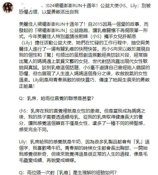 小S带着二女儿许韶恩一起加入公益慈善活动。 已经46岁的她仍旧芳华活力,穿着粉色蕾丝裙和女儿比美! 如果不说她们母女相差30岁,各人是不是以为这是姐姐和妹妹在一起的日常靓丽拍摄? 镜头之中的小S状态好,摆各种造型完全赛过二女儿许韶恩。 小S和女儿的账号对外称这是属于2024澎澎裙十周年的活动,公益大使小S,lily许韶恩,以爱的形式大胆活出自我。 该活动的主题是用一个爱的故事,2024年是以关注乳癌话题干系,以乳癌快问快答的形式举行一场公益的对白。 在公益活动的现场,小S带着16岁的二女儿聊关于一些女性的话题,此中显现了她进入妈妈这个脚色之后如何收敛锐气与显现女性的温柔。 同时女儿的芳华无敌和明快的生存节奏,为全部女性带来年轻人的时尚对话。 借着这一个难过的机遇,小S发文不是我要夸耀,我真的看起来很年轻。 网友:小S看起来根本就是姐姐。 各位,现在的小S可以说比以前明显幸福快乐了很多,尤其是女儿进入娱乐圈之后,母女属于并肩“作战”,一起在娱乐圈里发展,明显做母亲的小S比以前更快乐。 在采访之中,小S大方且全程与女儿许韶恩互动,整个活动以一种轻松愉悦的形式举行。 在聊到女儿话题的时间,小S又将机遇放给女儿,力推女儿在贵圈之中的发展。 母女一起穿着同款的蕾丝粉裙,搭配紧身上衣,女儿许韶恩长大了,固然才16岁,但在妈妈的引领下发展非常快速,感觉现场的她完全可以独当一面。 在化妆室里的许韶恩还让助理拿着手机纪录下自己美美的一刻,镜头之中的许韶恩感觉有那么一些像林志玲,也难怪小S称二女儿是林志玲的,简直很像。 咱们就是说,别看小S平时做节目浮夸又大胆,偶然也会借着酒劲耍点小酒疯,但她的人生存得比姐姐大S安闲轻松,至少在生存方面是不憋屈的。 以是在节目之中,她带着女儿更能玩得开,并且也给足了女儿出道之后加入各种活动的信心。 有台湾的网友称小S赛过姐姐大S的地方,不是在于身段与颜值,而是她对三个女儿的生存态度上面。 很明显,小S是真的超等痛爱三个女儿,尤其是对二女儿许韶恩的资助。女儿想要进入娱乐圈,OK,没有问题,跟着妈妈一起出道就好。 二女儿许韶恩的各种活动,小S给足了她底气,以致陪她一起发展。 上一次许韶恩在重庆的地推广告遭到本地的反抗,其立场问题引发质疑。 结果妈妈小S全程陪着女儿应对各种问题,也以“缓处置惩罚”的形式完善的避开了本地市场的矛盾。 该说不说,小S偶然间疯疯癫癫,但她不是傻,她是很厉害的“S精” |