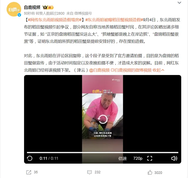 网传东北雨姐视频造假塌房 9月4日,东北雨姐发布的稻田蟹视频引起争议,部分网友自称当地养殖稻田蟹村民,在其评论区晒出诸多细节证据,如 “正宗的盘锦稻田蟹没这么大”、“抓螃蟹都是晚上在岸边抓”、“盘锦稻田蟹很黑”等,证明东北雨姐所抓的稻田蟹是提前安排好的,存在摆拍造假。 对此,东北雨姐在评论区复兴称,这个段子是受到了官方约请拍摄,目的是为盘锦的稻田蟹做宣传,由于运动时间指定以及夜晚拍摄未便,才造成大家的误解。现在,网红东北雨姐已经将该视频下架。 泉源:@白鹿视频 、津云 |