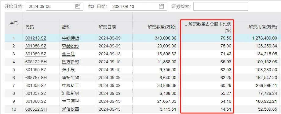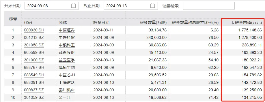 财联社9月8日讯(编辑 沈超)下周(9月9日至9月13日),A股市场将迎来月内解禁小高峰,涉及47只股票,总解禁市值到达557.05亿元。个股方面,“券商一哥”中信证券以177.51亿元的解禁市值位居榜首。另一只“百亿”解禁股为中铁特货,其解禁比例超70%。 月内解禁高峰!下周解禁规模环比增近2倍 wind数据统计表现,下周共有47家公司限售股连续解禁,合计解禁70.40亿股,按9月6日收盘价盘算,解禁总市值为557.05亿元,较本周环比增长191.33%。 详细到单日,下周一、三将是解禁高峰日,届时分别将有260.54亿元、205.79亿元市值会合解锁。 耽误六个月后,下周“券商一哥”解禁超170亿 从个股解禁规模来看,下周解禁市值超100亿的个股共有两只,分别为中信证券(177.51亿元)、中铁特货(127.84亿元)。中粮科工(23.69亿元)、菜百股份(19.34亿元)、兰卫医学(18.09亿元)等个股紧随厥后,位列下周解禁规模榜前五。 详细来看,“券商一哥”中信证券即将在9月11日解禁的9.31亿股,解禁股东为广州越秀资源控股团体有限公司(简称广州越秀资源)、广州越秀资源控股团体股份有限公司(简称越秀资源)。这些股份源自于中信证券在2020年3月完成的定向增发以及2022年的配股。此中,定向增发的发行价为16.62元/股。停止9月6日收盘,中信证券股价为19.06元/股。 泉源:中信证券公告 值得一提的是,六个月前,越秀资源及其子公司决定耽误所持中信证券股份解禁,缘故起因在于“基于对中信证券一连发展的信心和代价的承认,持有中信证券股票能给越秀资源带来稳固收益,以及为支持资源市场康健发展,维护广大公众投资者长处”。 解禁规模排名第二的中铁特货在9月9日解禁对的34亿股,解禁股东为中国铁路投资有限公司,其也是中铁特货第一大股东。Wind数据表现,停止9月6日收盘,中铁特货股价为3.76元/股,市值为167亿元。 5只个股大额、大比例解禁“双上榜” 与解禁市值相比,解禁股份在公司总股本中所占的比例对股价的影响更为直接且明显。下周将有9家公司解禁比例凌驾50%。 从详细个股解禁比例来看,中铁特货、森赫股份、金三江下周解禁比例均超70%,解禁数量占总股本的比例分别为76.5%、75%、71.41%。 必要注意的是,下周大额、大比例解禁“双上榜”的个股共有5只。分别为中铁特货、金三江、博拓生物、中粮科工、兰卫医学。此中,中铁特货解禁比例超70%的同时,解禁规模超100亿。 固然大规模股份解禁未必直接导致股价下跌,但投资者在面临大量且占比明显的股份解禁时,仍应保持警觉。这种解禁大概会使市场上流畅的股票数量急剧增长,从而在短期内对股价造成肯定影响。 |