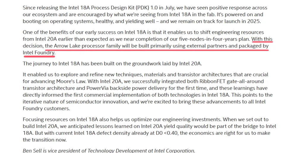 9月3日,英特尔已经正式发布了Lunar Lake Core Ultra 200V系列处置惩罚器,不外,这一代处置惩罚器是面向条记本电脑的,许多朋侪照旧更加关注即将于10月中旬发布的、面向台式机的下一代Arrow Lake系列处置惩罚器。 本文将分享有关Arrow Lake系列处置惩罚器的最新爆料,在进入正题之前,先要夸大两点: 一、本文爆料既不是有关Arrow Lake系列处置惩罚器的参数,也不是性能跑分,而是该系列处置惩罚器将由谁制造?二、本文消息泉源并非第三方坊间听说大概小道消息,而是来自于英特尔官方的声明,以是内容绝对正确可靠。 9月4日,英特尔官网发布了一篇标题为《英特尔18A工艺前瞻》的文章(上文),为了方便读者更加深入地明白后文,小编先简单地介绍一下英特尔的芯片工艺。 在英特尔芯片制造工艺代号中,字母“A”指的是埃(Angstroms),“18A”就是18埃,而1埃即是0.1纳米,因此,18埃相当于1.8纳米,也就是说,英特尔的18A工艺就是1.8纳米工艺。 毫无疑问,这篇文章的重点是介绍英特尔18A工艺的现状和商用规划,对此,英特尔表现“(由18A工艺制造的芯片样片)现在已经乐成点亮呆板并启动操纵体系,运行状态精良,制造良率体现很好,我们仍然操持在2025年正式发布(商用)。” 除此之外,在这篇文章中英特尔还透露了更多有关Arrow Lake系列处置惩罚器的消息,虽然只有非常简短的、一笔带过的话,但这才是更加值得关注的重点。 英特尔表现,为了能更快地将制造工艺从20A迁移、切换至18A,顺遂完成将来四年五节点的提升操持,Arrow Lake系列处置惩罚器将交由“外部同伴”制造,终极由英特尔自家的芯片工厂封装,请参阅图二。 ——英特尔方面未明确阐明所谓的“外部同伴”到底是谁,但是坊间广泛预期是台积电。 关于Arrow Lake系列处置惩罚器将由谁制造,接纳什么制造工艺,不绝空中楼阁,坊间传播着各种说法,而且有些还相互抵牾。 2023年9月,英特尔在Innovation 2023运动中演示了由自家20A工艺所制造的Arrow Lake系列处置惩罚器,由此来看,Arrow Lake系列处置惩罚器应该会接纳自家的20A工艺制造。 但是,厥后又传播别的一种说法,称英特尔自家的20A工艺将仅用于制造Arrow Lake系列处置惩罚器的一个子小芯片,别的部门将由台积电制造,没有明确指明制程,但大概率是指的台积电3纳米。 而英特尔9月3日发布的这篇文章相当于一锤定音,彻底澄清了各种听说,也就是说,Arrow Lake系列处置惩罚器将交由台积电制造全部子部件,末了由英特尔自家的工厂将这些部件终极封装成处置惩罚器制品。 对于如许做的原因,英特尔给出的理由是节省本钱和时间,以尽快完成在四年内提升五个工艺节点的操持,更快、更早地从现有的20A工艺迁移至18A工艺,让18A工艺能更早商用。 对于广大消耗者来说,Arrow Lake系列处置惩罚器交由台积电制造将非常风趣,也非常值得期待,小编将在第一时间分享更多相关动态和爆料,敬请关注。 |