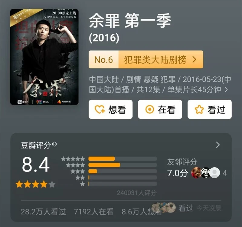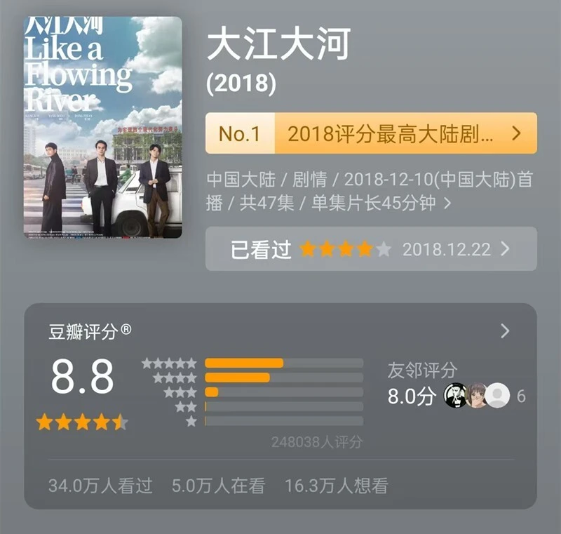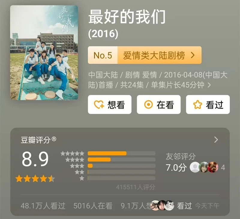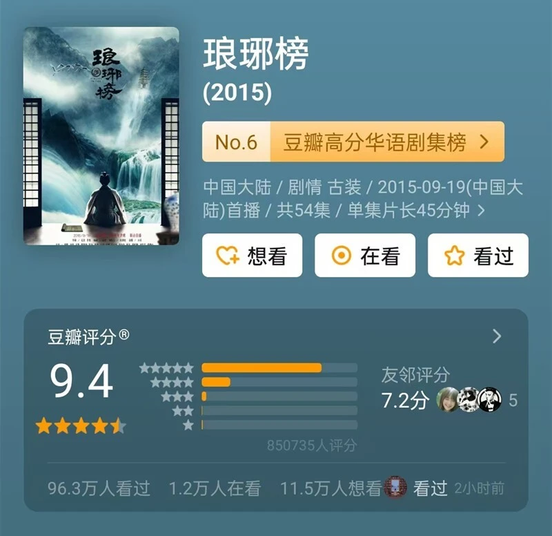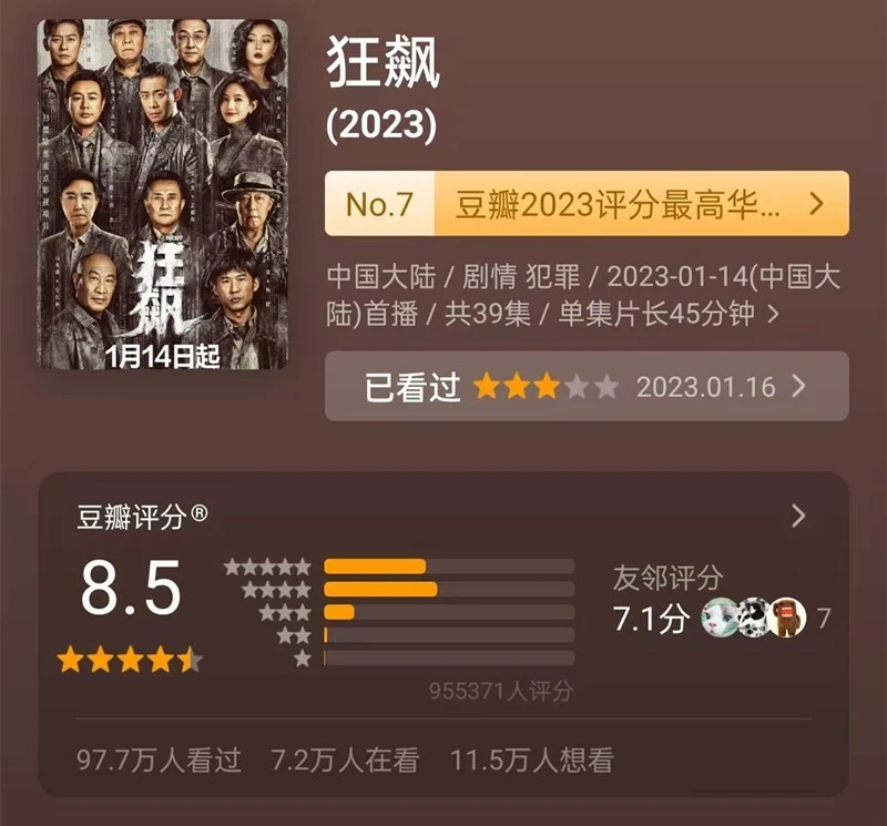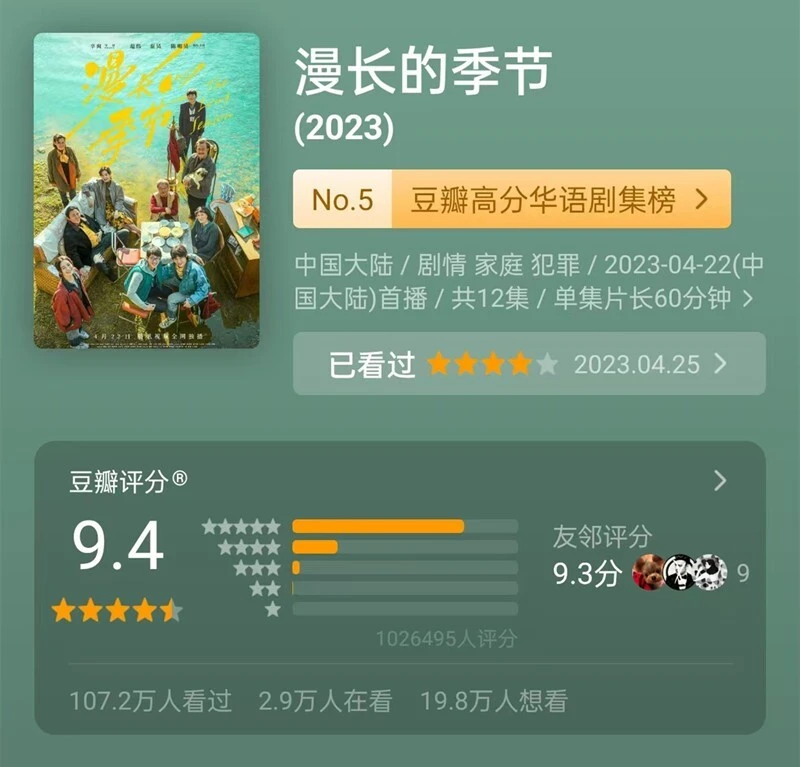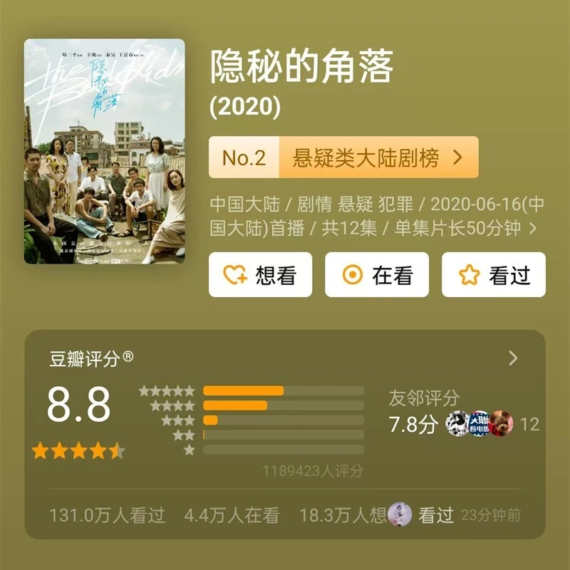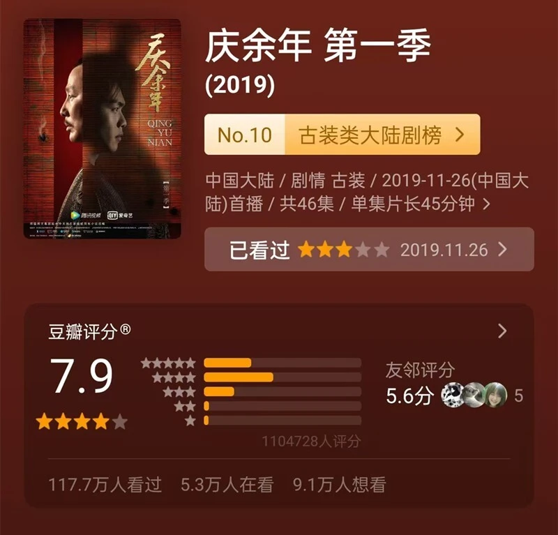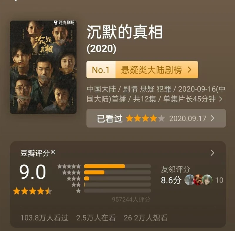 才过去8个月,2024年已经有多部分数8+的国产剧集佳作。 这此中,由马伊琍、于适主演的《我的阿勒泰》更是个中翘楚,演员灵、场景美,叙事手法、剧情细节也都亮点频现,被赞是“仙品”。 若偶然外的话,大概率会是本年最佳。 固然本年的“剧王”尚无法确定,但过往却已经尘土落定。我们综合评分和热度,来看下“近10年最好的国产剧”。 2014年:《父母爱情》 这部改编自同名小说的年代剧,播出时高居当年双网收视第一,单集最高收视率为3.12%,甚至让不少网友“基因觉醒”,忽然就到了“爱看中央台的年龄”。 终极评分,高达9.4。 剧中主要角色,可谓个个出彩。 江德福成了好男子模板,梅婷、张延美到让人难忘,而饰演江德华的刘琳更被赞“绝了”。 而同一年的《北平无战事》,固然评分、热度略输,但依然是国产剧中的经典佳作,9.0的高分近乎“封神”。 2015年:《琅琊榜》 2015年的“剧王”依然是孔笙作品。 改编自网络小说的《琅琊榜》刚开播,其制作之专心便已经过细节展露无遗,被观众提前预定为当年“三甲之一”,称把别的同类剧“秒成渣渣”,品格出彩到“五星不敷打”。 收官评分与《父母爱情》持平,都是9.4分。 而这年也堪称国产剧“胡歌年”。 由他主演的谍战剧《伪装者》也是“出乎意料的不错”,故事精彩节奏好,从正直到反派都各有各的精彩。 2016年: 评分最高的,人气稍输;人气最高的,评分略逊。 但这一年虽没有“剧王”,却是百花齐放。 9.1分的《一起同过窗》,热评榜首是“甩别的各种影戏电视网络校园剧一万条街”;悬疑犯罪剧《余罪》以路子够野、画风够爽够邪,在争议声中拿下8.4分;清新浪漫,既有程度又有格调的《遇见王沥川》,以8.9的高分成为当年言情剧冠军。 而由刘昊然和谭松韵主演的《最好的我们》,更是由于选角炸、男女主CP感爆棚,而被超48万人给出8.9分的高度肯定。 2017年:《白夜追凶》 紧扣主题,推理布局沉稳。 潘粤明主演的《白夜追凶》叙事精彩、配乐精彩、动作戏好评,从而以约65万人气、8.9的评分成为当年最佳。 他本人在剧中的表现,也是惊艳级别。由于一人分饰两角,还被讥讽是“潘粤明VS潘粤暗”。不少网友追剧后化身“自来水”,险些将“你看《白夜追凶》了吗”酿成一样平常问候。 而当年3月份开播的反腐正剧《人民的名义》,也因剧情紧凑、标准大、全员演技在线引发追剧热潮。 2018年:《知否》、《大江大河》 一个评分8.8,一个评分7.9。 但后者,有超62万人打分。 《知否》虽是古偶言情剧,但由于是正午阳光出品,制作细节上先就赢了同类剧许多。而关心剧情、人物的观众,也都没有失望。主角的糖能磕,副角的演技可赏,光是“红狼”和大娘子这对儿,就贡献了不少笑点。 而年代剧《大江大河》也自带观众群,年代感浓厚、人物设定丰富,被赞是“等了一年才终于比及”的好剧。 2019年:《庆余年》 7.9的评分并不算高,但打分人数却高达117万。 根据同名网络小说改编的《庆余年》之以是云云火爆,既是由于书粉根本大,更是由于改编出彩。开头的穿越设定被赞“过审鬼才”,一连登场的人物和后续剧情也都没有掉链子,连本来不计划看的人也被圈了粉。 饰演范闲的张若昀,也气力证实长得不像没关系,演得好更紧张! 2020年:《秘密的角落》、《沉默沉静的本相》 本年国产剧的巅峰风光,由迷雾剧场独享。 先是《秘密的角落》凭口碑赚热度,碾压同档期剧集。秦昊、张颂文和王景春等一众“影戏咖”的演技,更是降维打击程度的出彩。 小白船、爬山等剧情相关衍生的热梗,至今还被很多人拿来用。 之后于9月份播出的《沉默沉静的本相》,大概观赏效果不如“秘密”,但感情通报、感染力却更强。上百万人给出的9.0分,足以证实其品格之精良。 2021年:《觉醒年代》 本年最佳,是由张永新执导的《觉醒年代》。 一部可以给同类题材做模板、当标杆的汗青主旋律正剧,好到让很多人“直接五星”。 而导演的功力,也在人物细节中尽显。 有的人进场就是一道光,有人的一生在几分钟内畅快淋漓,有的人用一个回眸把自己刻在了观众心底。 9.3的评分,足以说明统统。 2022年:《人凡间》 这一年,是年代剧和古偶剧之间的对决。 8.4分的《人凡间》和8.2分的《苍兰诀》,在各自的受众群中大火。 但前者的观众,还是会嫌它节奏不敷快,对女性形象的塑造也很老旧;而后者的粉丝,却喜好到甘愿自贬身价,承认自己稚子到就爱土味剧。 2023年:《漫长的季节》 “秘密”之后,辛爽再创经典。 由范伟、秦昊等主演的《漫长的季节》,让“剧王”评分时隔数年后再回9.4,12集之内讲透了“运气”。 不止是剧中人,更是那片黑土、谁人期间。 在被短视频“碎”掉的现在,这部从剧名到叙事都逆向而行的剧,为“国产剧该怎么拍”给出了最佳答案。 别的,分别于当年1月份播出的《狂飙》和12月开播的《繁花》,固然评分和人气不如《漫长的季节》,却也都是国产剧中不多见的佳作,堪称征象级精品。 以上“10年好剧”,评分9.4的占了3部。 题材,则包罗年代剧、权术剧和悬疑罪案剧。 由此可见,真正的好剧果然是会出圈儿的,只要专心制作自会得到观众肯定。 盼望以后的国剧圈继承“回春”,好作品任何时间都不嫌多。 |