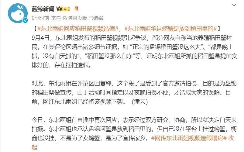 立秋之后,螃蟹黄满膏肥,正是最佳的品尝机遇。 然而,由于这只螃蟹,互联网正式进入了多事之秋。 先是辛巴和小杨哥这两大顶流主播,借着大闸蟹的“低价”生意业务生意业务上演了一场撕逼大战;后是“东北雨姐”栽倒在其宣传的盘锦稻田蟹上,视频存在造假疑似“塌房”了。 关于前者之间的恩怨情仇,上周不少同行都扒了一个底朝天,本日咱们将C位让给后者“东北雨姐”。 9月4日,在抖音平台坐拥2400多万粉丝的“东北雨姐”,因一则宣传盘锦稻田蟹的视频被网友“打假”了。 在原视频中,“东北雨姐”带着搭档们在稻田抓盘锦螃蟹,局面相称热闹。 不外,基于专业知识,品评区出现了不少质疑声。 网友们化身为赛博福尔摩斯,从抓螃蟹时间、盘锦稻田蟹的品格特性到蟹的数目、拖鞋的干净水同等细节,印证“东北雨姐”所抓的稻田蟹是提前安排好的,视频存在摆拍造假问题。 此中,有来自“官方”的切身了局打假——自称是本地养殖稻田蟹村民的网友表现,“盘锦稻田蟹很黑”“抓螃蟹都是晚上在岸边抓”“正宗的盘锦稻田蟹没这么大”等。 面对该网友的贴脸开大,“东北雨姐”说出了本相,在品评区复兴称,“这个段子是受到官方平台丰收节活动约请、为故乡盘锦河蟹做宣传,由于活动时间指定,以及夜晚拍摄未便,才造成大家的误解。” 在9月7日的直播中,“东北雨姐”再次举行回应,也认可了盘锦河蟹是放到稻田里的,但自己没在平台上挂过螃蟹,橱窗也没挂,不是为了卖螃蟹,是为了宣传故乡。 ▲图源:微博@蓝鲸消息 特殊值得一提的是,在当天的两场直播中,“东北雨姐”累计贩卖额到达了约1000-1500万元。期间以致一度居于带货总榜榜首的位置,其小黄车里并没有挂螃蟹类产品。 在她最新发布视频的品评区,仍有部门网友声讨盘锦稻田蟹事故。 干系话题的走向非常风趣,从9月7日#网传东北雨姐视频造假塌房#到本日的#东北雨姐算塌房了吗#。 归根到底,是网红博主流传内容的真假界限越发含糊了,或者说着实这种“真”在很大水平上已颠末渡到了“假”。 如同影视作品,大家都知道是依据脚本拍摄的,差别之处就是这个故事是由真实事故改编还是纯属假造的呢? 假如将“东北雨姐”这个视频当做是一段抓螃蟹的表演/广告宣传片,那么所谓的造假就等同于影视剧里的穿帮镜头/虚伪宣传。 以是,对于“东北雨姐”塌房这个说法,有网友表现“顶多算不严谨”。 显然,这是基于默认全部的短视频都是脚本摆拍的条件下,做出的品评。 而另一部门持质疑态度的网友,则以为“将摆拍当成真实事故且不注明是摆拍”便是错的,轻易误导观众,更让人可气的是他们这么做无非都是指向优点。 究竟,天下熙熙,皆为利来,天下攘攘,皆为利往。 不管出于何种目标,作为拥有庞大粉丝底子且有巨大影响力的网红,对自己发布的内容应该践行最根本的实事求是准则,且必须承担相应的社会责任。 险些全部的网红博主都是靠包装走到大众跟前的产物,他们借助粉丝底子举行定向营销,着实将网红行业视作一种商业模式,便很好明白了。 就以本文主人公“东北雨姐”为例。 《互联网品牌官》相识到,“东北雨姐”是一位来自东北辽宁的农村女性博主,身高178cm,身材魁梧,扎着小辫,农活干得利落,形象干练、彪悍。 在她的镜头里,会出现以下画面:一个扛起一只羊、抄起电钻装门、一脚踹倒猪圈旧墙、放倒几百斤的年猪……主打一个狂野豪放,网友将其奉为“战狼版李子柒”。 从这个称呼可以得知,“东北雨姐”跟李子柒、“张同砚”一样深耕的是三农赛道。 在“张同砚”爆红后的第4个月(2022年2月),农夫出身的“东北雨姐”在抖音发布了个人第一条短视频内容。 在账号前期,并没有掀起太多的水花。直到2022年11月后,“东北雨姐”凭借多条农村一样寻常视频开始走红抖音,粉丝数快速增长。 颠末两年半的时间,“东北雨姐”已经收获了将近2500万粉丝,近期作品的点赞量险些都维持在百万级别,账号累计获赞高达2.3亿。 作为对比,热度退却的“张同砚”,近期抖音点赞量极其不稳固,低的只有数千,高的数十万,均匀在10万左右的水平。 同样都是东北人,展现的都是东北乡村生活,为什么“张同砚”逐渐熄火,而“东北雨姐”能青出于蓝呢? 我以为重要原因是:人设凶猛,形成猛烈的反差,增加了叙事的意见意义性。 作为女性的雨姐,外表粗犷,家里的粗细活都一把手给包圆了,用真实验动演绎了什么叫做“妇女能顶半边天”。 而视频的别的一个主角,雨姐的丈夫老蒯,出现的则是截然相反的形象。 他通常游手好闲,整日无所事事,是一位倍受雨姐宠溺的小鸟依人的中年男子,因此经常被网友调侃“老蒯这丫头嫁得真好”。 除此之外,另有多位形象鲜明的脚色。 在他们的共同作用下,雨姐的人物形象变得更加立体,也让短视频内容更加有看头。 是不是人设包装? 不消质疑,百分百是的。 雨姐也没藏着掖着,之前就曾表明确实有团队,有脚本。 幕后的总筹谋不是别人,正是网友眼中的“闲人”老蒯。 编导专业出身的老蒯,是雨姐系列视频背后的操盘手,一手包办了团队的视频筹谋、运营、招商、剪辑等工作,就连“小娇夫”的人设都是他自己给自己安排的。 既然“演”的因素这么高,为什么人们还愿意看,以致是追着看。 跟追剧的生理是一样的,但雨姐的视频更具生活气味,更接地气。 虽说