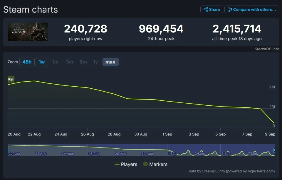 根据SteamDB的最新数据,《黑神话》系列的在线玩家数量虽呈现稳步回落态势,但其24小时内的玩家峰值依然逼近百万大关,这对于一款仅上市三周的新游戏而言,能够一连保持云云高的生动度和吸引力,实属难能难得。 另据权势巨子分析机构VG Insights发布的陈诉指出,《黑神话:悟空》在Steam平台上的预估贩卖量已惊人地到达1830万份,这一数字不但彰显了其巨大的市场影响力,还预示着该作品将来的长期贩卖潜力极为可观。陈诉中更进一步预测,《黑神话》系列的终身总销量极有大概逾越业界标杆《艾尔登法环》所到达的2500万份大关,这无疑是对其游戏品格及市场承认度的极高肯定。 值得注意的是,先前的研究陈诉还显现了《黑神话》系列销量构成的一个告急特点,即其总销量的76%源自中国市场,这一比例虽高,但同时也预示着该系列在西方市场尚存广阔的拓展空间与增长潜力。别的,关于将来大概推出的DLC(下载内容)的传言不绝于耳,业界普遍以为,这些额外内容的发布将成为推动《黑神话》系列销量再攀高峰的强大动力,进一步巩固其在全球玩家心中的地位。 (8985456) |
