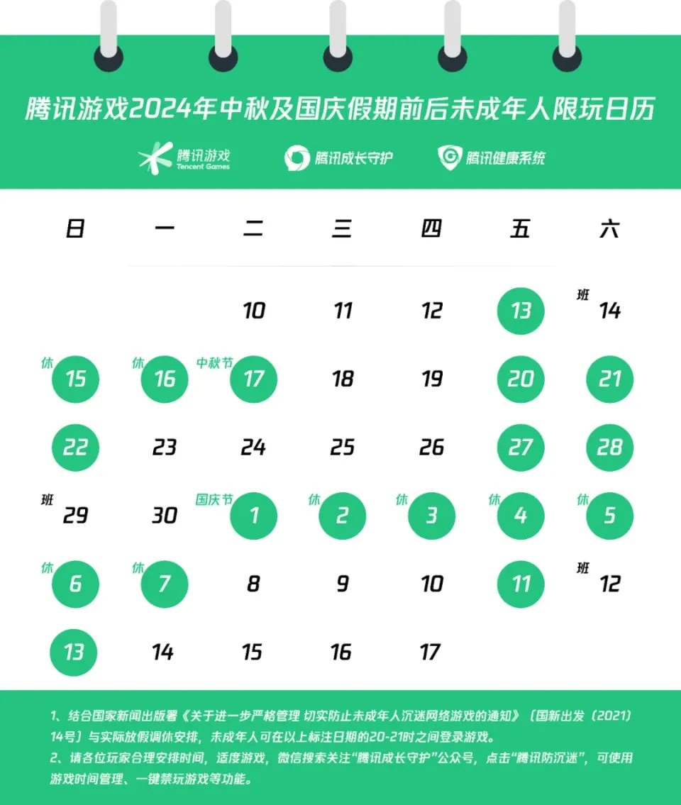9月10日据腾讯游戏,针对本年9月复杂的放假调休安排,腾讯发布中秋国庆游戏限玩日历,9月10日至10月17日共计38天,未成年人游戏时间不高出18个小时,形成“限3玩1限1玩3限2玩3限4玩2限2玩7限3玩1限1玩1限4”的节奏。此中,9月14日、9月29日、10月12日因调休上班也“禁玩”。 在“解禁日”,未成年玩家可在当天晚上的20:00至21:00玩游戏。从9月10日到10月17日的38天内总计18小时。 (泉源:潇湘晨报) 更多出色资讯请在应用市场下载“极目新闻”客户端,未经授权请勿转载,欢迎提供新闻线索,一经采取即付报酬。24小时报料热线027-86777777。 |
