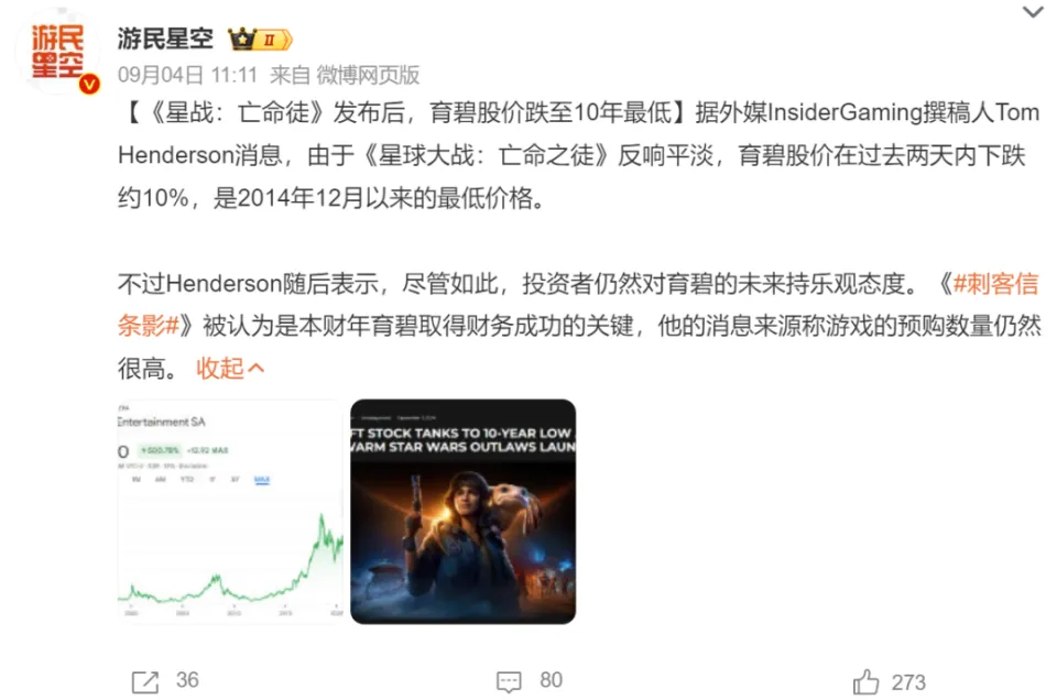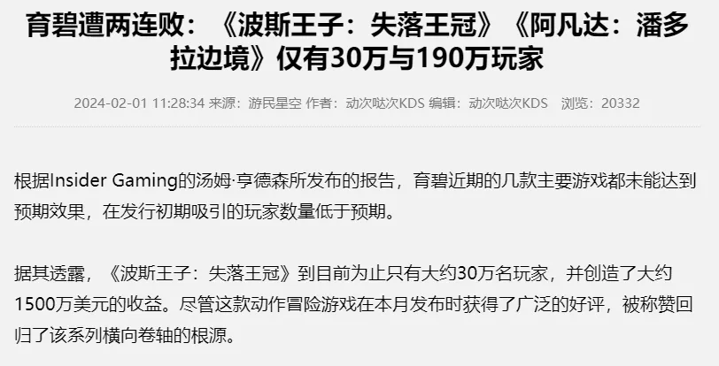 提起育碧,你第一时间会想起什么? 是罐头,土豆服务器,祖传 BUG,信仰之跃,彩六直播,照旧《 病愈呀 》? 几年前,小发还会略带调侃地开一开育碧打趣,然后眼睛都不眨就预购最新一作的刺客信条和 Far Cry。 而如今提起育碧,好像只会摇摇头,留下一声叹息。 前两天,刚聊完索尼花 8 年 20 亿打造的《 星鸣特工 》,开服 12 天就幽默关停。然后,同样有力气的育碧《 星战:流亡徒 》就紧随厥后,宣布扑街。 连育碧的股价,都因此跌至 10 年史低,维旺迪看了直接长吁一口吻。 看到报道,说投资人还在押注未来的《 刺客信条:影 》,则更让人绷不住。 不提影这茬还好,如今更是难说如今的史低股价,会不会依然有降落空间。 实在细数一下近两年的作品,不难看出,在走下坡路这件事上,它不停都在走上坡路。 在客岁公认是游戏大年的 2023,国际大厂育碧都推出了哪些游戏? 两部小中体量作品,加上飙酷车神出新作、预告很久的次世代开放世界阿凡达、刺客信条系列 15 周年吊唁作品幻景。 别说,这个阵容,还挺豪华的。 尤其是阿凡达、幻景、飙酷车神,都是有 IP 加持下的 3A 级资笔破作。 但如今的 MC 均分表现,这仨里还没有一个凌驾 7.0 的。 曾经的育碧工业化流水线游戏,固然爱好有限,复制粘贴严重,不外最少能包管一个合格分以及不错的销量,如今却程度不如从前。 像客岁的阿凡达,就开了倒车。 除了画面程度,探索、战斗、发展、剧情几乎没有一个值得歌颂的地方。 宣称回归老刺客信条的幻景,也并非大伙想象中那般原汁原味。 流程短、潜行暗杀玩法过于肤浅、白开水般的剧情睁开。 如果说神话三部曲,至少还能维持 15 小时左右的新鲜感,那这部作品 15 小时根本已经通关,而且包罗中心玩睡着了的半个小时。 固然游戏质量不敷出彩,幸亏销量还能看。 幻景这边销量没多久就破了 500 万销量,只管后劲不敷,移植到移动端后还无人问津,但毕竟不是正作,结果委曲算是差能人意。 飙酷车神同样破了系列贩卖记载,给客岁的育碧带来了一波增长。 但这也是创建在它整个 2022 加 2023 上半年,产能极其低下的底子上。 所以,反面发生的事,显然就没这么乐观了。 阿凡达潘多拉边境,因为跳票错过电影上映档口,结果电影一样平常,游戏也不可。 发售仅 4 天就打 7 折,三个月子女价更是靠近腰斩。 而且就这么卖,终极销量估摸着也就堪堪 200 万。其开辟资本 6000 万美元左右,算上宣发等费用,应该搭进去不少。 然后,再看一眼发售表,接下来的真就个顶个都是重量级。 波斯王子失落的王冠,喝采不叫座。 这个曾经育碧的顶梁柱 IP,在 2024 年强势回归。 横版动作玩法上,既有雷曼味,又有类银河兵士恶魔城的探索设计,动作和手感等都有着育碧以往作品的一直质量。 结果,不知道是不是宣发上出了题目,照旧波斯王子这个老朋侪,已经淡出各人视野太久,终极的商业结果堪称昏暗,乃至不配跟阿凡达坐一桌。 然后就是勇敢的心,落叶归根。 这游戏 2023 是网飞订阅的会员独占,直到 2024 才全平台上线。 前作堪称大名鼎鼎,剧情封神,还出了手机版。 但这部新作,却收货了驳倒不一的评价,玩法剧情和优化都全面倒退。 销量更不消提了,自己就是小众游戏,只能说网飞财大气粗。 实在到这里,只能说育碧挺失去初心的,游戏质量下滑,大不如前。 可再以后看看,你会发现本年的育碧完全就是抽象。 碧海黑帆这游戏,属于是正式打响了育碧口碑大幅下滑的第一枪。 开辟 9 年,投入 1.2 亿的碧海黑帆,跳票次数差不多能和 2077 掰掰手腕。 即便游戏不发售,就看这个工期和项目完成度,根本已经可以预见了局。 末了固然是不出所料,游戏质量远不如预期,刺客信条黑旗玩家都不美意思认可其存在,发售后立即贬价也是通例利用。 乃至,一度有谎话说这游戏就是为了骗法国当局经费的。。。 再下一个也依然是重量级,不羁同盟。 这部作品在宣发和测试阶段,真是把大伙等候拉满,免费多人无脑突突突,简直把不思进取的垃圾 COD 吊起来锤,不少人都纷纷表现要到场育碧度量。 谁成想正式版一上线,直接 BUG 各处,土豆服务器稳定发挥,枪械手感反向优化,各种弊端全找上门来了。 时至本日,固然题目改了不少,隔三差五就优化,奈何人已经走光,沦落到了必须背水一战的地步,未来也不容乐观。 不久前推出 EA 版的波斯王子:ROGUE,则是部独立游戏级别的肉鸽。 固然是授权给了死亡细胞制作组的 IP 授权游戏,但二者质量相差甚远,热度上也是知道的人寥若晨星。 随后,也不知道咋想的,又炒了个逾越善恶的冷饭。 实在出个 HD 重置版如今已经是通例利用,本来没多大题目。 但玩家真正想要的,是逾越善恶 2,等了这么多年,末了等来个系列续作操持彻底取消。 取消就取消吧,也算断了念想。 结果 20 周年又把 1 代端上来圈一波,于是又挨了一顿骂。 末了,包容小发把真正的重量级:星球大战,放在末端。 因为这个游戏真是压垮育碧的末了一根稻草,聚集了各种 DEBUFF 于一身。 从游戏内容上来说,它玩法空洞无物,BUG 奇多,剧情无聊,战斗和潜行做得一言难尽,太空对战乃至不如星空,仇人 AI 堪称弱智。 除了画面,各方面表现都非常稚嫩,仿佛丢掉了育碧这么多年积聚的开辟履历。 只要搜索干系词条,所有人只会告诉你俩字:快跑。 千万别买。 这部“ 星战 IP 作品 ”,没有光剑,没有原力。 有的只是一个不知道从哪冒出来的女主,和