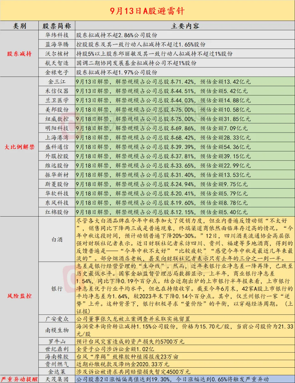 导读:财联社9月13日投资避雷针,克日,A股及外洋市场潜伏风险事件如下。国内经济信息方面包括:1)白酒中秋动销不及预期,业内反馈同比降20%-30%;2)住宅代价四到五折,深圳大量商办公寓低价促销;公司方面重点关注包括:1)广安爱众公司董事张久龙被立案观察并接纳实行留置;2)南模生物股东海润荣丰询价转让减持1.15%公司股份,代价为15.70元/股,当前公司股价为21.33元/股;外洋市场重点关注包括:1)热门中概股多数下跌,蔚来跌超5%;2)日本央行审议委员放话,大概要加速加息。 经济信息 1、尽管各明白酒品牌在本年中秋季加大了促销力度,但业内广泛反馈动销“不太好”,贩卖同比降落两三成是广泛征象,终端渠道商依然面对库存过高的环境。“本年中秋这段时间,预计动销广泛降落20%-30%。”12日,四川酒类流畅协会高层张强对财联社记者体现。克日财联社记者采访四川、贵州、福建等多地酒商,得到的反馈广泛是——“本年中秋不太好”“比较疲软”“感觉本年中秋是迩来几年来最淡的”。部分烟旅店老板,以致向财联社记者体现只有客岁的三分之一到一半。 2、记者在深圳市场实探发现,越来越多的商办公寓正以“低价”抢占市场。有业内人士体现,如许的征象背后折射出房企的资金压力,或在肯定程度上打击市场感情。“同片区的住宅最低也要每平方米5万元,现在这里的商办公寓均价才两万元出头,由于户型小,每平方米的单位租金以致还凌驾住宅,租金年回报率绝对凌驾3%,而住宅的年租金回报率不到1.5%。”在罗湖布心,有商办公寓的营销职员举行倾销。在靠近前海片区的一处商办公寓,营销职员提供的代价为每平方米4.2万元左右,这个代价险些是周边住宅的四折到五折。 (证券时报) 3、息差是银行策划管理的“生命线”。然而,比年来银行业净息差一降再降,已跌至历史最低程度。国家金融监督管理总局数据体现,上半年,商业银行净息差1.54%,同比降落0.19个百分点。团结近期出炉的上市银行半年报来看,上市银行净息差优于行业均匀程度,但也在连续收窄。克制本年6月末,42家A股上市银行的均匀净息差为1.64%,较2023年末降落0.14个百分点。此中,仅兰州银行一家“逆势”上升。这种配景下,银行积极寻求“量价险”的平衡,以穿越经济周期。 (上证报) 公司预警 1、广安爱众:公司董事张久龙被立案观察并接纳实行留置。 2、南模生物:海润荣丰询价转让减持1.15%公司股份,代价为15.70元/股,当前公司股价为21.33元/股。 3、华纬科技:股东拟减持不超2.86%公司股份。 5、沃尔核材:持股5%以上股东邱丽敏及其一致办法人拟减持不凌驾1%股份。 7、金禄电子:股东拟减持不超1.97%公司股份。 8、罗牛山:预计台风劫难造成的资产丧失信5700万元。 9、世纪鼎利:全资子公司涉诉讼金额1.02亿。 10、海南橡胶:台风“摩羯”致橡胶种植园报废23万亩。 外洋预警 1、热门中概股多数下跌,纳斯达克中国金龙指数跌0.79%。蔚来、小鹏汽车跌超5%,富途控股跌超4%,抱负汽车跌超3%,满帮、哔哩哔哩、网易跌超1%。拼多多涨超2%,阿里巴巴、京东、微博、百度、唯品会小幅上涨。 2、本周四,日本央行审议委员田村直树对外界发出了强势鹰派信号:日本央行将来提高利率的幅度大概会比许多经济学家预期的更大。他指出,日本的中性政策利率为1%或更高。而且,日本央行大概将不得不快速加息。 3、美国8月PPI同比上升1.7%,预估为上升1.7%,前值为上升2.2%;美国8月PPI环比上升0.2%,预估为上升0.1%,前值由上升0.1%修正为0。 3、Adobe美股盘后一度跌超10%。公司预计第四财季营收55-55.5亿美元,分析师预期56亿美元。 |