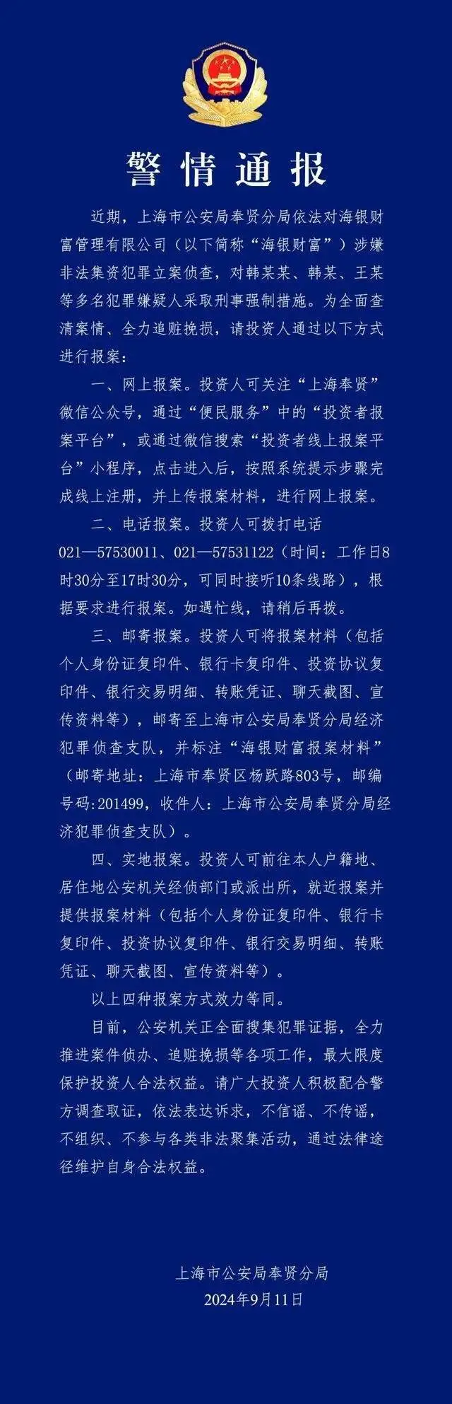突发! 备案侦查,700亿理财团体实控人及20名高管被抓; 造假18年,数万人血本无归,这家上海的财产公司把投资者们给害惨了! 曾经见过不少暴雷的案例,但最“狠”的雷就属海银财产这个了。 因为海银的底层资产全都是虚伪的,根本没有实际代价,总规模超716亿,460余只产物、子公司满是假的,这就是一个巨大的骗局! 这家建立于2005年的财产管理公司,在短短几年内发展成为行业巨头,却因为一场经心筹谋的庞氏骗局而轰然坍毁。 一骗就是18年,从财产管理新星到金融骗局,海银财产的崩塌过程令人震动。 你眼馋别人的利钱,殊不知别人早已盯上你的本金。 不管买任何理产业品,只要年化收益率,高出了10年期的国债收益率(2.5%),那你就要做好亏钱的预备; 要是高出5%,就要做好本金全部亏完的预备。 因为,全部运气奉送的礼品,早已在暗中标好了代价! 01 又暴大雷! 天下第三大财产公司被备案侦查,多人被抓,700亿资金多数去处不明,4.6万名投资者或将血本无归...... 据警方最新转达,依法对海银财产管理有限公司(下称海银财产)涉嫌非法集资犯罪备案侦查,对韩某某、韩某、王某等多名犯罪怀疑人接纳刑事逼迫措施。 据多家媒体报道,海银财产老板韩宏伟及高管20多人被警方带走查察。 现场图片可以发现海银财产的logo近期已经拆除,人去楼空,没人办公。 时隔九个月,海银财产终于备案了,实在控人韩宏伟及多名高管被上海警方带走观察,这也意味着海银财产自救失败,下一步将启动刑事追责,“海银系”涉案公司干系职员需退缴违法所得。 据其官网介绍,2006年,海银财产建立于上海陆家嘴地区,在国内80余座重要都会先后设立170余家财产中央,拥有员工超2500人。 过去几年,海银财产和五牛控股通过注册投资公司、伪金交所公司,编造虚伪投资项目,设计包装了大量应收账款类、城投债类等投资理财项目,随后由海银财产在天下各地下设的170多家分公司举行贩卖,诱导了上万名投资人购买,合计募资金额上百亿元。 资金用途都是用于放贷,底层资产都是“应收账款”等债权资产,海银财产太“狠”了,一开始玩的就是庞氏骗局那一套! 那海银是怎样玩这套把戏的呢? 和全部的坑一样——“高息勾引”:海银的全部产物年化收益在7%-10%之间,半年付息一次,封闭期6-48个月,只要另有人买,这套募新还旧的庞氏骗局,就可以玩下去。 汇总信息显示,海银财产依赖分布于91个都会的185个线下财产中央1700余名理财师,聚集了4.66万余名高净值人群,涉及的发行人共计22家,发行的产物数目共计465只,总规模716.9亿元。 02 天眼查App显示,海银财产管理有限公司由海银控股团体有限公司持股85%,王滇持股15%。海银控股团体有限公司法定代表人为韩宏伟,其持股比例为99%,韩玉持股1%。 据中国消息周刊,作为河南永城首富,韩宏伟的白手起家,具有一定秘密色彩。 2005年,海银财产建立之初,韩宏伟利用秘密的履历,拉拢了不少人脉,并将其转化为公司发展的资源,为海银财产的启航铺设了金光大道。 不得不说,韩宏伟可谓是个营销高手,前期的包装非常“上心”: 公司方面,坐落于繁华的陆家嘴金融区,海银财产占据了地理上的制高点,在浩繁金融机构的中独领风骚; 而高达5亿的注册资金,展现出了海银财产的雄厚财力,韩宏伟把海银财产的硬件包装得非常“高大上”,让人对公司气力“信以为真”。 再加上,积极参与各类金融盛会与展会,这一系罗列措使得海银财产迅速在业界内外进步其着名度,让海银财产的名字以后响彻云霄。 业务方面,海银财产通过一系列经心筹谋的大规模宣传运动,融合线上线下渠道,全方位、多角度地投放广告,营造出公司妥当运营、值得信托的信号,从而让选择海银财产的小搭档安心。 之后跟全部的爆雷故事一样,便是扩张扩张再扩张......就这样,海银财产在短短几年内迅速膨胀,从一家名不见经传的小公司发展成为拥有数千名员工、业务遍布天下的财产管理巨头。 海银控股自称是国内头部第三方财产管理公司,于2021年3月在美股上市,成为继诺亚财产后第二家赴美上市的第三方理财公司。 海银财产的半年报显示,停止2023年6月末,海银财产在天下91个都会拥有185个财产管理中央,1749名理财师,客户总数达15.3万人,活跃客户46627名。 03 海银控股韩宏伟、韩啸父子其所掌管的“海银系”旗下席卷巨大的金融版图,控股或参股公司包罗海银资产管理有限公司 、海银财产管理有限公司、 西安海银网络小额贷款有限公司等,涉足私募、基金贩卖、小贷、期货、包管、保理等非焦点金融牌照类的业务。 在2023年《胡润百富榜》上,韩宏伟、韩啸父子仍以60亿元身家上榜。 2023年12月中旬,在险些没有任何征兆的情况下,驰骋市场高出18年,仅次于中植、诺亚的海银财产,一夜之间轰然崩盘——制止兑付全部理产业品。 纵然在暴雷后,海银系还在玩“二次收割”的套路。 其推出的资产抵债方案,不光以写字楼、住宅、物流园及贵酒酒水资产+现金抵债,而且还推出了其大康健板块资产的抵债方案,不外这些方案都必要投资人再投入一笔资金才气参与; 这样的办理方案对投资人来说,显然是缺乏诚意的,以致还想着再收割一波,不外幸亏海银的快意算盘终极未能打响。 2024年5月,据媒体报道,海银财产所贩卖的理产业品全数违规,并操控数十家空壳公司构筑了规模高出700亿元的“嵌套资金池”。 观察进一步