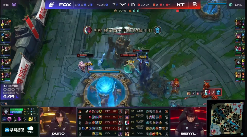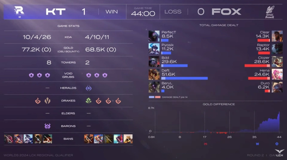 LCK夏日赛冒泡赛KT和FOX的BO5,双方大战3局之后,KT以3-0的战绩横扫FOX,晋级下一轮,将和T1夺取LCK四号种子的席位。 第一局KT上单贾克斯,打野猪妹,中单小炮,下路炸弹人加牛头;FOX上单奎桑提,打野大树,中单飞机,下路萨勒芬妮加波比。8分钟Pyosik猪妹抓下,但是萨勒芬妮借助防御塔反杀pyosik猪妹,FOX拿下了一血。前期双方经济根本持平。中期双方相互发育,经济差距不停没有拉开。后期37分钟双方夺取小龙,FOX拿下火龙魂,随后双方混战,Clozer飞机被击杀。43分钟双方中路混战,PerfecT贾克斯TP绕后,Deft炸弹人大招完美伤害,KT击杀FOX四人后,在高地打出团灭,拿下第一局的胜利。首局伤害最高的是Deft炸弹人。 第二局FOX上单纳尔,打野蝎子,中单飞机,下路炸弹人加牛头;KT上单奎桑提,打野莉莉娅,中单永恩,下路烬加芮尔。4分钟KT众人在中路击杀clozer飞机,Deft烬拿下了一血。12分钟Deft烬中路单杀Clear纳尔。前期双方经济根本持平。中期23分钟双方野区混战,BDD永恩R三人,Deft烬收割,KT团灭FOX后,拿下听牌龙。25分钟双方野区混战,PerfecT奎桑提一马当先,FOX单和AD被击杀,KT拿下第一条大龙。29分钟双方野区混战,装备差距过大,KT再次团灭FOX,拿下第二局的胜利。 第三局FOX上单鳄鱼,打野蝎子,中单飞机,下路炸弹人加女坦;KT上单奎桑提,打野莉莉娅,中单永恩,下路烬加波比。7分钟FOX辅助抓中,越塔击杀BDD永恩,Clozer飞机拿下了一血,随后KT野辅赶来换掉Clozer飞机。11分钟FOX推掉了中路一血塔。前期FOX经济领先1K。中期23分钟双方夺取小龙,Clear鳄鱼绕后,但是KT拿下听牌龙,而且打出1换2。26分钟FOX选择打大龙,效果pyosik莉莉娅赶来抢下第一条大龙,随后KT击杀FOX两人。27分钟双方野区混战,BDD永恩疯狂输出,KT打出3换5团灭FOX,随后拿下炼金龙魂。后期31分钟双方中路混战,pyosik莉莉娅R两人。BDD永恩出场收割,KT再次团灭FOX后,拿下角逐的胜利。 那么,对于这场角逐,你们有什么想说的吗?欢迎在评论区留言探讨。 |