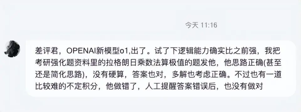 说真话,有点受不了这些公司,总是半夜丢个大的了。。。 尤其点名 OpenAI ,这回又毫无预告地发布了那个各人惦记了很久的新模型。 之前说什么草莓不草莓的,一张草莓的照片遛了各人好几天 效果,这回新模型根本跟草莓毛关系没有,而是起了一个全新的名字Oepn AI o1 模型。 而且这玩意已经号称 openAI 的天顶星科技,奥特曼直接发帖明说了,这就是他们到如今为止最强、最同等的模型。 跟往次不同的是,这玩意到底多牛 OpenAI 现实也没多吹,但是轻飘飘甩出了几张图,就有点让人头皮微麻。 像下面的图里,三个测试项目的效果就能分析了,分别是国际数学奥林匹克比赛、编程比赛尚有博士级别的科学标题。 这内里最左边为 GPT-4o ,中心是如今已经开放了的预览版 o1 ,最右边高高的赤色柱子为满血 o1 。你瞅瞅,根本每一项, o1 比起本身的先辈来说,都是靠近 8 倍的提升。。。 要是把这些测试效果拆开来,这新 o1 也几乎是在各种学科、各种范畴,都全量、全面、全方位地超越 4o 。 而真正让差评君以为可骇的是, OpenAI 说本身专门请了博士专家一起答题。 效果在博士级别的测试效果上,我们看到 o1 答题分数均凌驾了博士专家。o1 得分 78 ,人类得分 69.7 。。。 连博士都输了,那我和它比算什么? 敏感的网友们,直接就炸了呀。又开始喊着,新的神已经出现。 随便一翻,都是带着【 最 】字的超高评价,什么 “ 简直太棒了! ” 、 “ 最靠近人类推理的东西 ” 。 以致有不少差友跑到咱们被页粳感慨 o1 你小子确实有点东西啊。 听起来是不是很牛逼?OpenAI 他们本身很显然也是这么觉着的。 详细 OpenAI 在它上面花了多少钱还没公布,但从用户使用上,就能明显看到这玩意多耗钱了。 o1 预览版每百万输入 15 美元,每百万输出 60 美元 这次对用户开放的以致不是满血版本,就是一个早期的预览版和一个小型阉割版。 哪怕只是争先尝鲜,不但难免费,哪怕你掏钱开了会员,也卡你问答次数。预览版每周只有 30 条, mini 每周只有 50 条。。。 固然有点贵,但我们肯定不可能让 OpenAI 吹什么就是什么。 他们不是说凌驾博士了吗?差评君就冲了几个账号,去找了几个博士来亲测了一下。 为了保证专业性和客观性,我们专门约请了理综三科的博士参与测评,有生物学、固体物理学、质料化学等等。 此中,南京大学在读的固体物理学崔博士给出的评价,算是几个人里最高的。他以为 o1 已经到达了 60 - 80 分( 满分 100 )的水平。 以致,部门答复也可以给到 90 分。 崔博士给的第一个标题:远隔断胶葛光子分发,有什么降服白噪声的办法? 大概 9 秒钟左右, o1 就给出了 10 点可行的措施。 固然了,没一个点是我看得明白的。不外,崔博士的评价还可以:答案罗列全面,符合现有的最新研究希望,属于科普级别的答案。 此中,提到的自顺应光学的方向以致是本年最新的 science 成果。 和老版 4o 一比,立刻高下立判了。 就别说新方向提没提到,光是给出的措施数量上,就差了不少。 于是背面,我们就专门对自顺应光学这个船新方向举行了追问:使用了量子胶葛的什么原理来进步信噪比?能否拓展到量子自顺应光学? 几轮答案之后,崔博士给出了 80 - 90 分的高分,还大方地和我认可,部门思索是他的薄缺点,对他的方向有提示作用。 不外,后续我们再深入追问之后,它标题就袒露出来了。当追问到更难的实验细节部门, o1 的答复效果就会低落。 但总体来说,在物理方面, o1 的体现算是不错的。和老版比下来,提升根本在 20 分左右。 不外,在 OpenAI 的测试里,物理原来就是分数最高的。以是我们又拉来一位北大在读质料化学的 K 博士,想对它评分最低的化学,来几个狠标题。 K 博士围绕Fe-N4 问了一系列的标题, o1 给了很长的一串答复,为了精简篇幅我们这里只展示了部门标题和效果。 整体测试之后, K 博士给出的评价也差不多:可能有研究生水平,但是深入的认知和给方案的本领,比力虚,主要照旧针对已知内容作答。 比如问到怎样调治 Fe-N4 , o1 可以说出基于电子态调治,但你要是问它那该咋调治,它就有点卡壳了。 固然相比 gpt4o 没那么乱说八道,但详细的标题上他俩都给不了太多发起,老版是丧失细节乱说,新版本领有限就会词穷。 除了这俩,理综三科那肯定也少不了生物。 我们还咨询了来自清华,在读生物学的信博士,他的标题是: “ 怎样从质谱数据集中区分赖氨酸残基的乳酰化和羧乙基修饰? ” 固然我听不懂,但是 o1 也给了一段非常长的答复,跟论文综述似的,背面还贴了参考文献。 但出乎意料的是,当我们把这个答复交给信博士,人家看完就发现不对路了,而且是一眼丁真的标题。 倒不是这 AI 答复的全错,而是 AI 在参考文献里乱编,这论文压根不存在! 固然编了,但也没完全编,总体来说人家清华博士照旧以为比之前的 AI 能强不少,最少明白本领是肉眼可见了,编也编的很像。。。 不外,不同方向的博士评价有所区别,这大概也跟 o1 本身善于的范畴有关。 拿官方给出的理综分数来看,固然 gpt4o 在生物学上的评分要比化学和物理高,但这回的 o1 就完全不一样。 o1 在物理上的分数到达了 92.8 ,已经远超其他两门学科,这大概就是崔博士对它比力看好的缘故原由。 总体而言,真要说到超越专业博士水平,博士们以为还得缓缓。 崔博士直言,在现实科研工作中,多数环境学者们都还得本身动手, AI 只能提供大抵方向,因此费钱要如许
