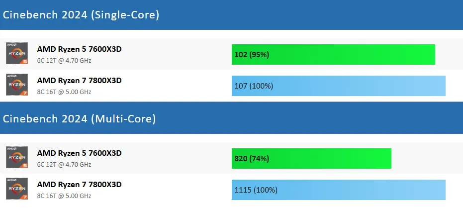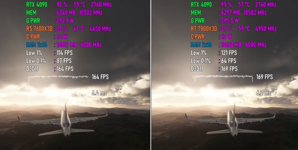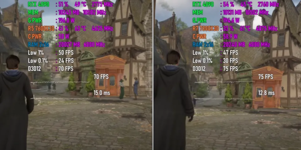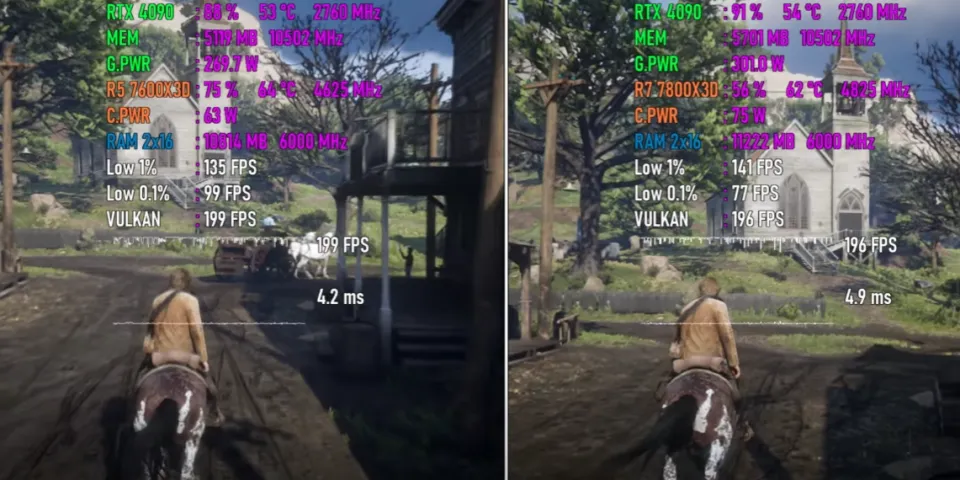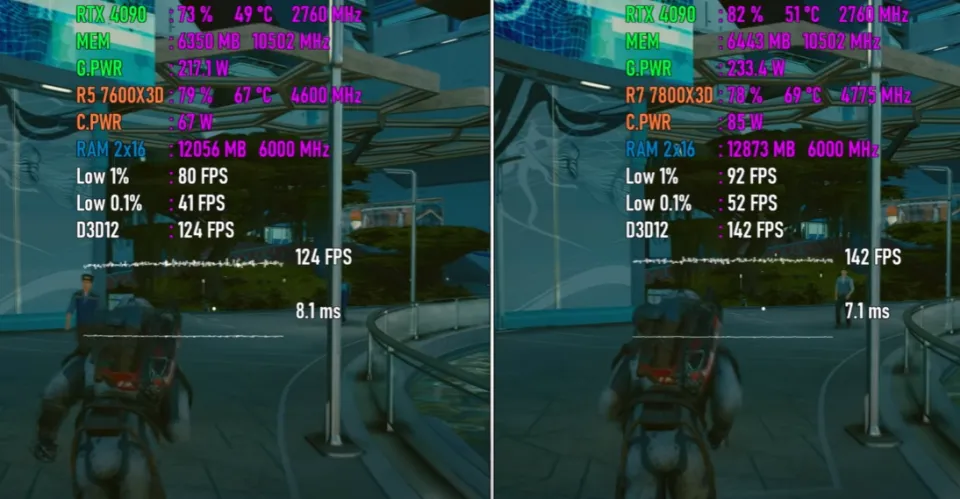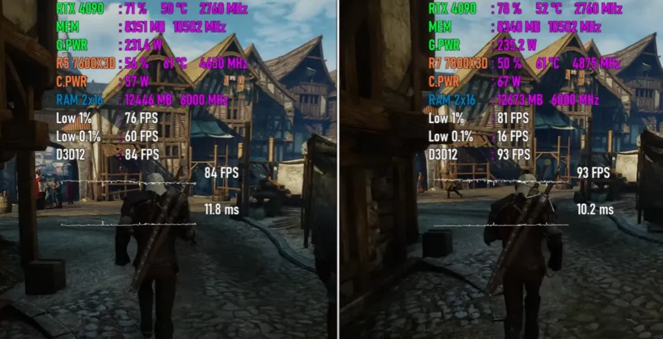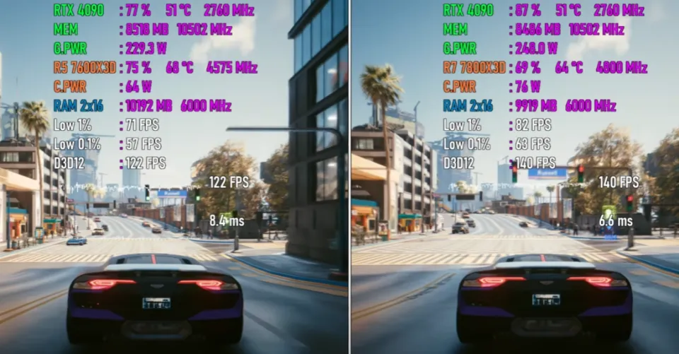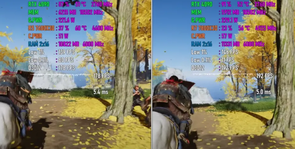 一、前言 近来,AMD低调地发布了一款Ryzen 7000系列处置惩罚器新品Ryzen 5 7600X3D,许多朋侪都非常等待,由于这款处置惩罚器非常有可能会成为新一代“游戏神U”。 对于Ryzen 5 7600X3D,部分小白朋侪可能会以为它是AMD专门推出的一款Ryzen 5 7600X鸡血加强版,但是资深老鸟都明白,它更有可能是由Ryzen 7 7800X3D的残次品颠末屏蔽、降级而来的。 AMD新品的首发价一直都未自制,只管云云,其官方发起零售价也只有299美元,相称于2000元人民币左右,而如今Ryzen 7 7800X3D的现实市场代价在3000元人民币左右,代价自制许多,因此纵然性能被阉割降级也是可以担当的。 题目的关键在于Ryzen 5 7600X3D的现实游戏性能相比Ryzen 7 7800X3D,差距有多大?这是决定它是否称得上是“游戏神U”,是否值得入手的最关键因素。假如性能差距很大,那么不如直接入手Ryzen 7 7800X3D,相反,假如性能差距不大,那Ryzen 5 7600X3D就很香。 因此,Ryzen 5 7600X3D VS Ryzen 7 7800X3D这一场比力非常紧张、关键,Ryzen 5 7600X3D想得到市场和消耗者的承认,必须用力气语言。 二、参数对比 Ryzen 5 7600X3D发布于2024年8月30日,采取台积电5纳米工艺,拥有6核12线程,L1级缓存为384KB,L2级缓存为6MB,L3级 缓存为96MB。 标准运行频率为4.1GHz,最高运行频率为4.7GHz(Ryzen 5 7600X标准运行频率为4.7GHz,最高运行频率为5.3GHz),标准功耗为65W,发起零售价为299美元。 Ryzen 7 7800X3D发布于2023年1月4日,采取台积电5纳米工艺,拥有8核16线程,L1级缓存为512KB,L2级缓存为8MB,L3级缓存为96MB。标准运行频率为4.2 GHz,最高运行频率为5.0 GHz,功耗为105W,集成两个表现内核,运行频率为2200MHz,发起零售价为449美元。 三、跑分对比 相比Ryzen 7 7800X3D,Ryzen 5 7600X3D少2个内核和4个线程,L2级缓存更小,运行频率也更低,以是,论处置惩罚器的单核性能和多核性能,它肯定是不敌Ryzen 7 7800X3D的,分别约有5%和26%的差距。 只管云云,在现实的游戏性能测试中Ryzen 5 7600X3D未必肯定相差悬殊,由于在处置惩罚器性能有富余的情况下,它有可能可以通过使用更多的处置惩罚器资源(性能),开释出相同的显卡性能,从而在终极的游戏性能方面赶超大概委曲追平Ryzen 7 7800X3D。 生死看淡,不平就干,下面就正式进入游戏对比环节,还是用数据语言最客观、最靠谱。 四、测试平台设置 紧张设置如下: 处置惩罚器分别为Ryzen 5 7600X3D和Ryzen 7 7800X3D,主板为微星MPG X670E CARBON,内存为32GB DDR5 6000MHz,显卡为GeForce RTX 4090,硬盘为两块三星970 EVO 1TB,利用体系为Windows 11。 五、游戏测试 以下将分别测试七款游戏,均采取1080P最高画质模式,以下系列图片中左边代表Ryzen 5 7600X3D平台,右边代表Ryzen 7 7800X3D平台。 第一款游戏是《巫师3》。 Ryzen 5 7600X3D平台的匀称帧速为84 FPS,最低瞬时帧速为76 FPS,帧时间为11.8ms,CPU使用率为56%,功耗为57W,温度为61度,内存使用量为12.4GB,GPU使用率为71%,显存使用量为8.4GB,功耗为231W,温度为50度。 Ryzen 7 7800X3D平台的匀称帧速为93 FPS,最低瞬时帧速为81 FPS,帧时间为10.2ms,CPU使用率为50%,功耗为67W,温度为61度,内存使用量为12.7GB,GPU使用率为78%,显存使用量为8.3GB,功耗为235W,温度为52度。 在这款游戏中,Ryzen 5 7600X3D平台的CPU使用率比对手高6%,内存使用量低0.3GB,GPU使用率低7%,显存使用量根本相等。 在匀称帧速方面,Ryzen 5 7600X3D平台比Ryzen 7 7800X3D平台低9 FPS,最低瞬时帧速低5 FPS,帧时间高2ms左右,根本相等,团体差距较小。 第二款游戏是《荒野大镖客救赎2》。 Ryzen 5 7600X3D平台的匀称帧速为199 FPS,最低瞬时帧速为135 FPS,帧时间为4.2ms,CPU使用率为75%,功耗为63W,温度为64度,内存使用量为10.8GB,GPU使用率为88%,显存使用量为5.1GB,功耗为270W,温度为53度。 Ryzen 7 7800X3D平台的匀称帧速为196 FPS,最低瞬时帧速为141 FPS,帧时间为4.9ms,CPU使用率为56%,功耗为75W,温度为62度,内存使用量为11.2GB,GPU使用率为91%,显存使用量为5.7GB,功耗为301W,温度为54度。 在这款游戏中,Ryzen 5 7600X3D平台的CPU使用率比对手高19%,内存使用量低0.4GB,GPU使用率低3%,显存使用量低0.6GB。 在匀称帧速方面,Ryzen 5 7600X3D平台比Ryzen 7 7800X3D平台高3 FPS,最低瞬时帧速低6 FPS,帧时间根本相等,团体根本是平手。 第三款游戏是《赛博朋克2077》。 Ryzen 5 7600X3D平台的匀称帧速为122 FPS,最低瞬时帧速为71 FPS,帧时间为8.4ms,CPU使用率为75%,功耗为64W,温度为68度,内存使用量为10.2GB,GPU使用率为77%,显存使用量为8.5GB,功耗为229W,温度为51度。 Ryzen 7 7800X3D平台的匀称帧速为140 FPS,最低瞬时帧速为82 FPS,帧时间为6.6ms,CPU使用率为69%,功耗为76W,温度为64度,内存使用量为9.9GB,GPU使用率为87%,显存使用量为8.5GB,功耗为248W,温度为51度。 在这款游戏中,Ryzen 5 7600X3D平台的CPU使用率比对手高6%,内存使用量高0.3GB,GPU使用率低10%,显存使用量相等。 在匀称帧速方面,Ryzen 5 7600X3D平台比Ryzen 7 7800X3D平台低18 FPS,最低瞬时帧速低11 FPS,帧时间低2ms左右,小幅落伍。 第四款游戏是《幽灵线东京》。 Ryzen 5 7600X3D平台的匀称帧速为178 FPS,最低瞬时帧速为139 FPS,帧时间为5.4ms,CPU使用率为37%,功耗为51W,温度为60度,内存使用量为10.8GB,GPU使用率为87%,显存使用量为6.2GB,功耗为222W,温度为51度。 Ryzen 7 7800X3D平台的匀称帧速为192 FPS,最低瞬时帧速为146 FPS,帧时间为5.0ms,CPU使用率为23%,功耗为57W,温度为56度,内存使用量为11.3GB,GPU使用率为91%,显存使用量为5.9GB,功耗为229W,温度为52度。 在这款游戏中,Ryzen 5 7600X3D平台的CPU使用率比对手高14%,内存使用量低0.5GB,GPU使用率
