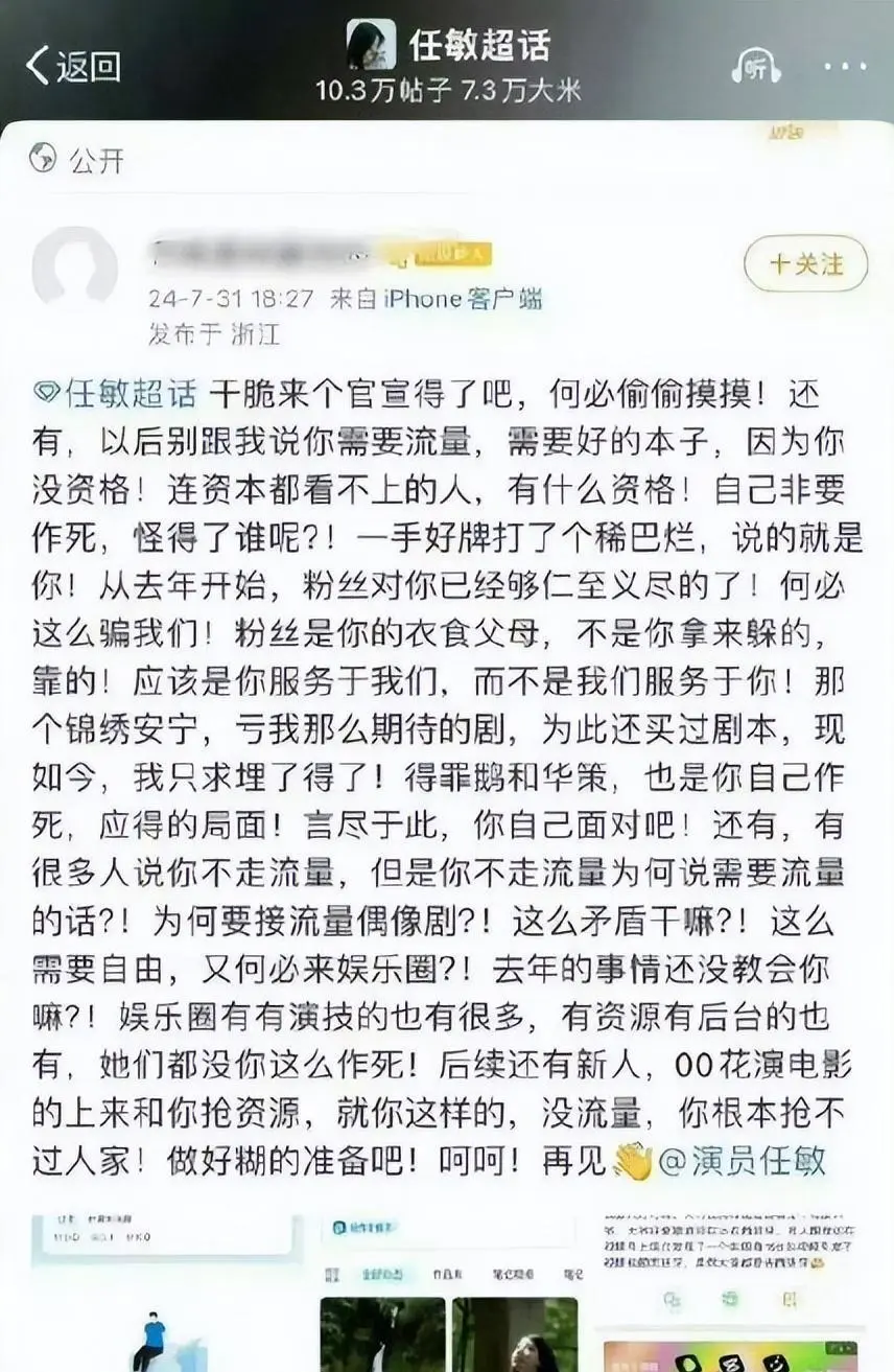 足见,张钧甯依然是早年对峙的“大女主”个性,而她选择夫君时,天然不会只注意外表。 2.马思纯而上一个被网友吐槽“垃圾堆里挑夫君”的马思纯,如今也在低调地享受着甜蜜的恋爱韶光。 男友张哲轩于2022年在交际平台官宣了恋情,这之后两人频仍传出功德快要、未婚先孕等小道消息,但女方始终没有做出回应。 作为圈中“星二代”,马思纯一出道便资源丰富,常和姨妈蒋雯丽搭戏。 2015年,因出演影戏《左耳》她爱上了剧中男主的扮演者欧豪,两人非常甜蜜。 恋爱顺风顺水的同时,马思纯又接连依附《他来了,请闭眼》和《七月与安生》在巨细荧幕上大放异彩。 但以“痞帅”著称的欧豪却好像并不想为她停顿,两人于2018年官宣分手。 据悉恋爱期间,马思纯为捧男友大费苦心,因此被贴上“恋爱脑”的标签,分手后她也确实曾在综艺中感情瓦解,看得出非常痛楚。 这之后她又自曝烦闷症复发,演艺奇迹也因此大受影响。 直至2021年,马思纯被拍到和盘尼西林乐队主唱张哲轩牵手过马路,恋情曝光。 但仅几个小时后,男方便被扒出“黑料”无数: 包括私生存紊乱、学历造假等,同时他的长相也不被大众喜欢,使得马思纯备受群嘲。 不过鲜少有人知道,张哲轩虽在业内口碑不好,却才华横溢。 他曾在19年便登上过福布斯中国30岁以下精英榜音乐行业的榜单,和梁博、汪苏泷等人齐名。 担当采访时,他也曾自负地体现,自己的乐队是90后所有乐队中的“第一名”。 而马思纯眼中的张哲轩则像“太阳一样照进生存”,当时自己陷入烦闷,被家人陪着在英国调治,男方也放下齐备工作陪着她。 当两人的恋情曝光,面对外界的质疑和爆料,她也特别肯定地体现:不会去说,人们只乐意信赖自己信赖的,那我就不说了。 足见在马思纯心中,男友就是最符合自己的。 3.任敏此外,本年才25岁、处于奇迹上升期的“99花”任敏,也在客岁10月曝光了恋情,厥后网友发现,男方是个导演。 只管出道后,任敏奇迹不绝处于高点,搭档的男主角不是肖战就是李现,但她却选择了其貌不扬的万里杨,令人匪夷所思。 厥后粉丝扒出,男方出生于1994年,毕业于北影导演系,两人因互助《群星闪耀时》而相识,但详细什么时间在一起的不得而知。 只管事情发酵后,任敏曾出头否认,直言自己只身,却仍被网友偶遇在西班牙约会,导致大批粉丝出走,另有人直接喊话: