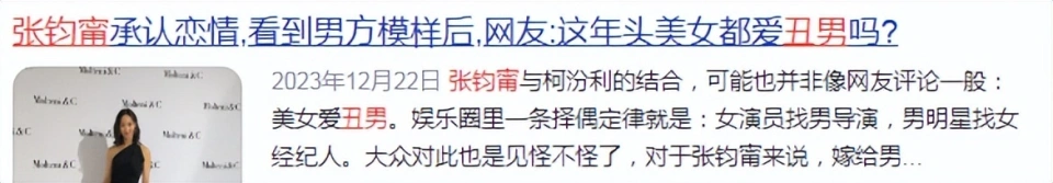 克日,张钧甯担当采访又被问到是否有完婚规划,她直言自己没有太多想法,“齐备顺其天然”。 而在这之前,她常因感情事上热搜,尤其是自客岁12月开始,与导演柯汶利官宣恋情后,男方总因颜值被嘲,令其备受困扰。 只管网友都高呼:“不明白这么美丽的女明星为何找了一个‘丑男’?” 但现实上,娱乐圈中雷同的组合不在少数: 马思纯、任敏、孟美岐等人都曾遇到这样的困扰。 而深扒这些“天之骄女”选择背后,不是被男方的才情吸引,就是爱上了对方给的感情代价…… 1.张钧甯张钧甯曾被称为第三代“台湾第一玉人”,和萧蔷、林志玲齐名。 虽然她的美艳不如以上两位,却胜在气质出众——她出生于台湾王谢望族,自小就是学霸,厥后因长相出众入行,还遭父母反对。 但张钧甯天赋极好,很快就在娱乐圈闯出了自己的一片天地,同时也并未延伸学业。 由于拍摄《痞子豪杰》,彼时27岁的她与男演员赵又廷擦出火花,机密恋爱。 但这段恋情只对峙了三年便不了了之,厥后她自曝因在感情中非常强势: