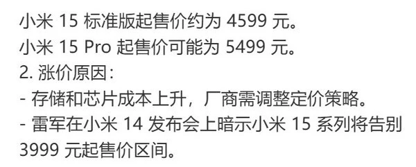 【CNMO科技消息】小米15系列预计将于10月正式发布,并首发高通骁龙8Gen 4移动平台。随着发布日期的日益邻近,关于小米15系列讨论也愈发热烈,尤其是涨价听说不绝于耳。而克日,CNMO注意到,有博主猜测小米15标准版的起售价为4599元,而小米15 Pro的起售价则为5499元。 针对涨价缘故起因,该博主分析指出,存储和芯片资本的上升迫使厂商调整定价计谋。别的,雷军在小米14发布会上的暗示也进一步印证了小米15系列将告别3999元起售价的时代。 着名分析师郭明錤此前也透露,骁龙8 Gen4采取了台积电最新的N3E制程,工艺资本显着增加,其代价较骁龙8 Gen3高出约25%-30%,到达190-200美元之间。这一高昂的芯片资本无疑将对小米15系列的终极定价产生影响。 综合现有爆料信息,小米15系列将全面升级,全系配备超大底主摄、长焦微距、超声波屏幕指纹、玻璃机身、硅负极电池、无线闪充以及高规格防尘防水等高端设置。小米15标准版将采取1.5K分辨率的直屏计划,主打小巧便携;而小米15 Pro则将继续相沿2K分辨率的新基材全等深微曲屏,边框计划更加窄。 影像体系方面,小米15标准版将搭载5000万像素主摄和竖立式长焦镜头;而小米15 Pro的影像体系则更为出色,配备5000万像素超大底主摄、5000万像素超广角以及5000万像素潜望长焦镜头。 值得注意的是,有消息称,天玑9400芯片的代价也将上涨,这将进一步推高搭载该芯片的终端产物代价,对厂商的定价本领提出了更高要求。 |
