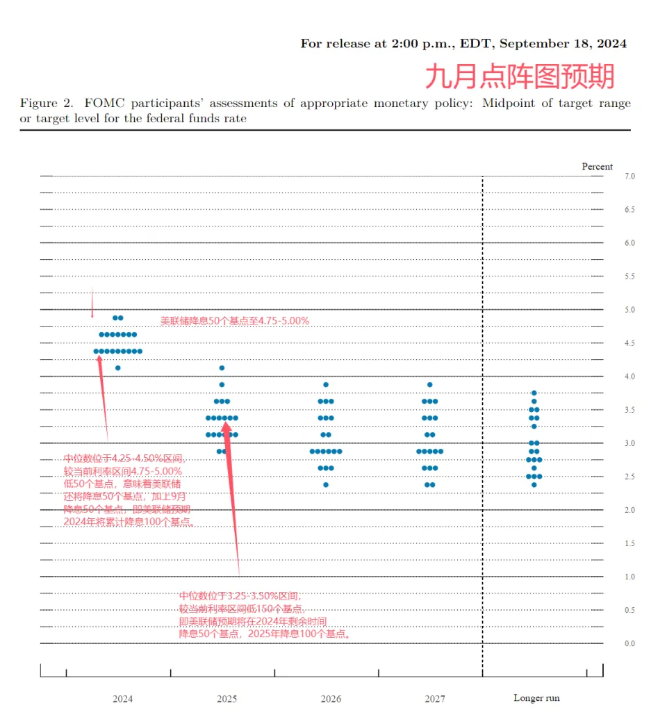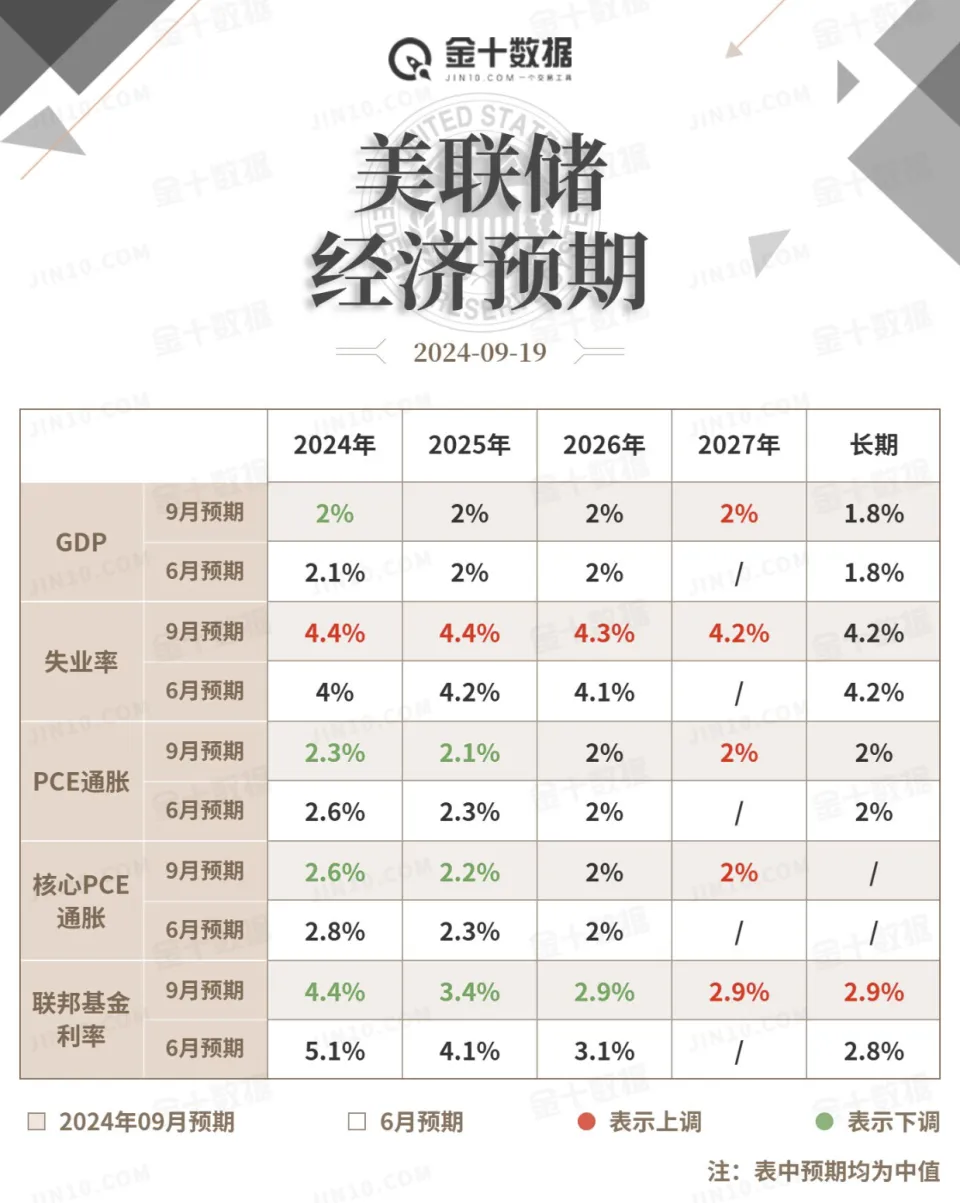 在羁系题目上,鲍曼常常公开与美联储理事会的多数成员意见相左,她多次号令减轻对银行的羁系力度。 过去一年里,鲍曼还成为美联储在货币政策上最鹰派的声音之一,她比其他大多数央行官员更支持美联储在更长时间内进步政策利率,以确保完全遏制通胀。鲍曼周三的反对意见是近30年来美联储理事中第一个持鹰派态度的人——也就是说,同意收紧货币政策,而不是放松货币政策。 点阵图传递年内降息信号 美联储官员们认为,随着通胀接近2%的目标和赋闲率上升,他们必要在年底前将利率降至4.25%-4.50%的区间,高于他们在6月份的预期。 九月点阵图预期 美联储当前的联邦基金利率区间为4.75%-5.00%,点阵图预测意味着,政策订定者预计在本年11月和12月的末了两次聚会会议上都会降息25个基点。 根据政策订定者的预测中位数,到2025年底,政策利率预计为3.4%,这意味着来岁将再降息100个基点。2026年底和2027年底的政策利率均为2.9%,反映出美联储政策订定者如今认为的中性利率即将到来。 与此同时,现在的赋闲率为4.2%,比美联储在2022年3月开始为期一年半的加息运动时高出半个百分点以上。 这些预测代表了个别政策订定者的观点,而不是告竣的共识。美联储点阵图显示,在19位官员中,有2位官员认为2024年剩余聚会会议不应再继续降息,有7位官员认为2024年应再降息25个基点,有9位官员认为2024年应再降息50个基点,有7位官员认为2024年应再降息75个基点。 美联储九月经济预期 |