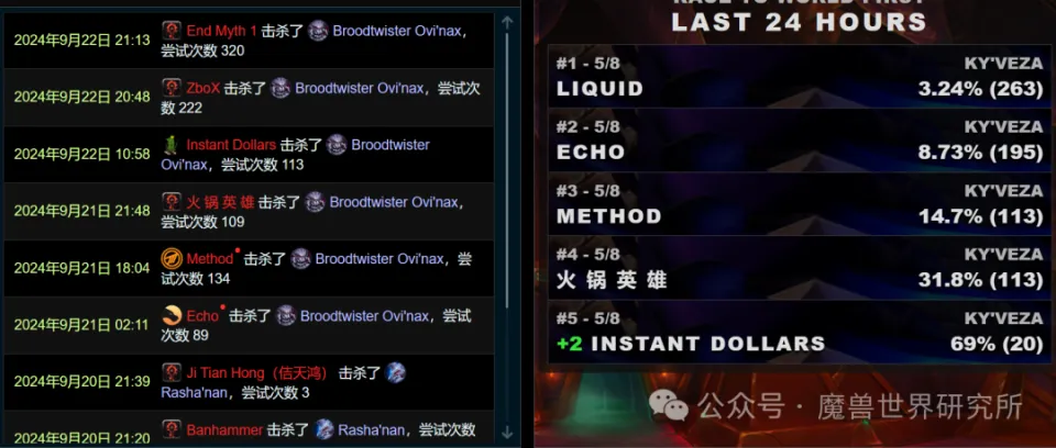 21点13分,End Myth以320次尝试击杀了虫巢扭曲者欧维纳克斯,得到了天下第七、亚洲第三的成绩。End Myth在战斗过程中多次打出低血量,甚至包罗多次1%以下的灭团,只管过程困难,但他们终极对峙到了末了,乐成击杀Boss。他们的对峙与韧性值得称道,尤其是在云云高难度的战斗中。