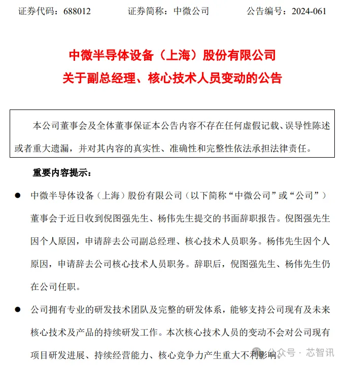 9月21日,国产半导体装备厂商中微公司发布公告称,公司董事会于克日收到倪图强、杨伟提交的书面辞职陈诉。倪图强因个人缘故原由,申请辞去公司副总司理、焦点技能职员职务。杨伟因个人缘故原由,申请辞去公司焦点技能职员职务。辞职后,倪图强、杨伟仍在公司任职。 公告表现,倪图强,1962年生,美国国籍,中国科学技能大学学士、硕士,美国德州大学博士、博士后。2004年8月到场中微公司,现任中微公司副总司理、焦点技能职员。制止本公告披露日,倪图强直接持股764,358股,所持股份合计占公司总股本0.123%。 杨伟,1966年生,美国国籍,西安交通大学学士、硕士。2004年8月到场中微公司,现任中微公司焦点技能职员。制止本公告披露日,杨伟直接持股454,017股,所持股份合计占公司总股本0.073%。 中微公司表示,公司紧张从事高端半导体装备的研发、生产和贩卖,涉足半导体集成电路制 造、先辈封装、LED 生产、MEMS 制造以及其他微观工艺的高端装备范畴。公司通过长期技能积累和发展,已创建了完备的研发体系,培养了有奋斗精神和协 同创新本领的研发团队。本次焦点技能职员的变更不存在涉及职务发明等纠纷,不会对公司的技能上风和焦点竞争力产生庞大倒霉影响,亦不影响产物研发和市场拓展进度。 制止 2024 年 6 月底,公司共有研发职员 967 名,占公 司总人数比例为 46.38%,涵盖了等离子体物理、射频及微波学、布局化学、微观 分子动力学、光谱及能谱学、真空呆板传输等干系学科的专业职员。 公开资料表现,中微半导体装备(上海)股份有限公司的主业务务是高端半导体装备及泛半导体装备的研发、生产和贩卖。公司的紧张产物有电容性等离子体刻蚀装备,电感性等离子体刻蚀装备,MOCVD装备,VOC装备。 财报表现,中微公司2024年上半年,公司业务收入为34.48亿元,同比增长36.46%;归属于上市公司股东的净利润为5.17亿元,同比降落48.48%。 编辑:芯智讯-林子 |