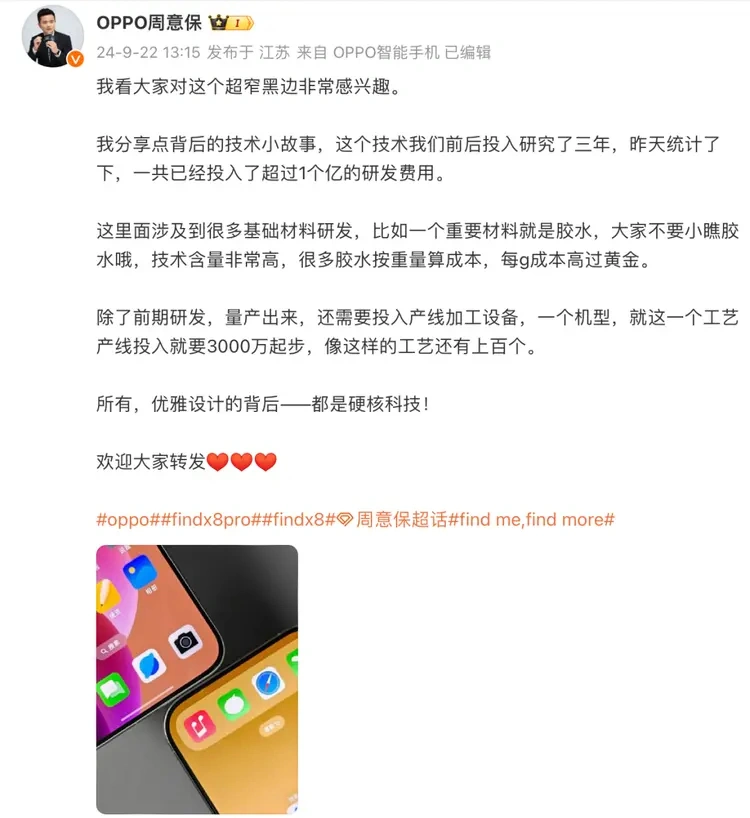 继OPPO首席产物官 一加首创人 @刘作虎 和OPPO Find 系列产物负责人 @OPPO周意保 曝光了一张疑似 @OPPO Find X8系列与iphone新机的边框对比照之后,很快成为了网友关注和热议的焦点,对此,日前, @OPPO周意保 再次透露了窄边框研发费用过亿,并且该技能有大概在一段时间内将会由绿厂独占。其还暗示,Find X8系列在轻薄方面进步非常大、Ultra版更惊艳。同时,日前还有网友曝光了疑似ColorOS15的流体云类“灵动岛”筹划演示。 日前,@OPPO周意保 再次透露了关于绿厂研发超窄边框的更多消息,据其称,“我看各人对这个超窄黑边非常感爱好。 我分享点背后的技能小故事,这个技能我们前后投入研究了三年,昨天统计了下,一共已经投入了凌驾1个亿的研发费用。 这内里涉及到很多底子质料研发,比如一个紧张质料就是胶水,各人不要小瞧胶水哦,特制胶水技能含量非常高,很多特制胶水按重量算本钱,每g本钱高过黄金。 除了前期研发,量产出来,还必要投入产线加工装备,一个机型,就这一个工艺产线投入就要3000万起步,像如许的工艺还有很多。 全部,优雅筹划的背后——都是硬核科技!” 在该条微博下,@OPPO周意保 在与网友互动时更是透露了关于OPPO Find X8系列的更多消息。比如,针对网友提出的“听说轻薄方面也有改进”的题目, @OPPO周意保 表示,“进步非常大”。而对于“x8u也是如许的窄边框吗”的题目,其透露,“更加惊艳,不然怎么加ultra”。别的,其还暗示,该项技能并非供应链技能,以是将会在肯定时间内只有绿厂能做到。这看起来就更加值得等待了。 根据如今曝光的信息看,年内将发布的OPPO Find X8系列新机将包罗尺度版、Pro版和Pro卫星通信版,如今这三款机型疑似都已经得到了国家质量3C认证。据爆料,这三款机型有望都搭载联发科天玑9400处理器,而OPPO Find X8 Ultra版则有大概搭载高通骁龙8Gen4处理器,将有望于来岁一季度(Q1)发布。续航方面,理论上四款机型都有望内置超6000mAh的冰川电池,支持OPPO的100W长命闪充。 在表面方面,根据曝光的谍照来看,该系列新机后置相机模组或将采取方形筹划,但四个角都有肯定的弧度处理,使团体看上去较为圆润。别的,该机采取了直角中框筹划,与以往的Find X系列的风格都有所差异。而除了固态影像按键之外,在该机侧边框上,还将有音量键、电源键和三段式物理静音键。 OPPO Find X8真机反面谍照 屏幕方面,尺度版采取的是6.5英寸1.5K分辨坦率屏,Pro版和Pro卫通版采取的是6.78英寸1.5K分辨率等深微曲屏,支持120Hz刷新率,4500nit峰值亮度,2160Hz PWM高频调光,Ultra版采取6.78英寸2K分辨率等深微曲屏,支持144Hz刷新率,4500nit峰值亮度,2160Hz PWM高频调光。 影像方面,尺度版仍旧采取后置三摄方案,将配备索尼IMX882中底潜望长焦镜头,主摄为5000万像素1/1.4英寸传感器;Pro版和Pro卫星通信版或将采取后置四摄方案,此中包罗索尼IMX882传感器双潜望镜,主摄同为5000万像素1/1.4英寸传感器;Ultra版预计将配备5000万像素后置四摄组合,此中超长焦镜头或将不再使用之前的IMX858小底传感器。从如今曝光的信息来看,OPPO Find X8系列在影像、续航和性能等方面都会有不小的提拔。 别的,继近日OPPO官宣了2024年OPPO开发者大会(ODC24)将于10月17日举行的消息后,有爆料称,在大会上,官方有望带来听说已久的ColorOS15新一代体系。日前,一位注册信息为一加员工的博主 @蔡祖轩 在微博上还公开了疑似ColorOS15流体云的视频演示。 在视频中可以看到,流体云位置改为居中,类似苹果的“灵动岛”,演示中出现了录屏、音乐播放以及打车软件的界面。别的,数码博主 @数码闲聊站 此前也透露,ColorOS15居中“灵动岛”有两套快捷操纵逻辑,支持更多信息体现和点按操纵逻辑,同时兼容第三方 App。同时,新体系还有望新增分层景深壁纸、分离式控制中心(支持实时高斯模糊)等。 |