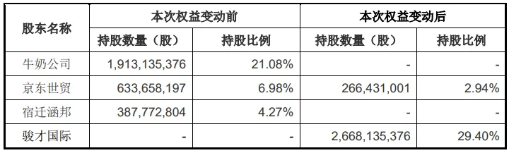 【大河财立方消息】9月23日晚间,永辉超市发布公告称,三名股东拟向广东骏才国际商贸有限公司(以下简称“骏才国际”)转让公司股份,转让完成后,永辉超市第一大股东将变动为骏才国际,骏才国际及其实控方名创优品将与永辉超市携手向品格零售模式转型。 永辉超市公告提到,永辉超市股东牛奶有限公司、北京京东世纪商业有限公司和宿迁涵邦投资管理有限公司(系京东世贸的同等举措人)拟通过协议转让的方式向广东骏才国际商贸有限公司分别转让其所持有的永辉超市股份有限公司约19.13亿股股份、3.67亿股股份和3.88亿股股份,分别占公司总股本的21.08%、4.05%和4.27%。 转让前后股权布局如下: 责编:李文玉 | 考核:李震 | 监审:万军伟 泉源:大河财立方 |
