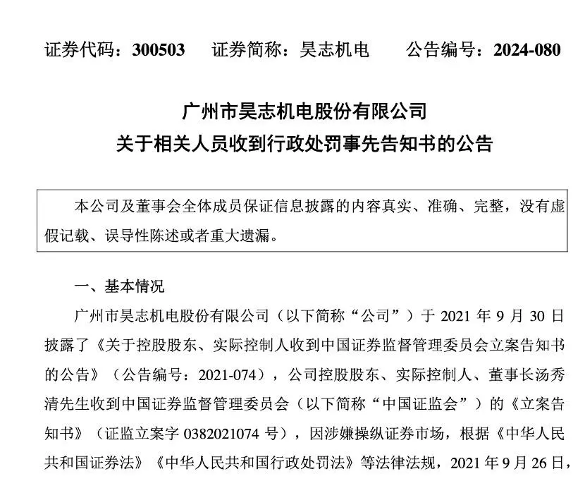 因涉嫌使用证券市场,证监会拟对昊志机电控股股东、现实控制人、董事长汤秀清处以1.09亿元罚款,对董事、董秘、副总司理、财政总监肖泳林处以200万元罚款。 这一变乱源于三年前微博大V叶飞的举报,当时他曝光了昊志机电等十多家上市公司与私募基金等金融机构同谋举行“伪市值管理”,使用资金上风和信息上风使用股票代价,以此到达非法赢利的目的。 2021年9月30日,昊志机电披露了《关于控股股东、现实控制人收到证监会备案告知书的公告》,公司控股股东、现实控制人汤秀清收到证监会的《备案告知书》,因涉嫌使用证券市场,根据《证券法》《行政处罚法》等法律法规,2021年9月26日,证监会决定对其备案。 2023年9月19日,昊志机电披露了《关于公司董事收到证监会备案告知书的公告》,公司董事、董事会秘书、副总司理、财政总监肖泳林收到证监会的《备案告知书》,因涉嫌使用证券市场,根据《证券法》《行政处罚法》等法律法规,2023年8月25日,证监会决定对其备案。 9月23日晚,昊志机电公告,公司收到汤秀清和肖泳林的关照,获悉其于当天收到证监会的《行政处罚事先告知书》。《行政处罚事先告知书》表现,汤秀清、肖泳林涉嫌违背《证券法》第五十五条第一款第一、三项的规定,构成第一百九十二条所述使用证券市场违法行为。根据当事人违法行为的究竟、性子、情节与社会危害程度,依据《证券法》第一百九十二条的规定,证监会拟决定:对汤秀清处以罚款约1.09亿元,对肖泳林处以200万元罚款。 公开资料表现,汤秀清现年51岁。2006年12月至2023年4月,汤秀清任昊志机电副董事长、总司理。2009年,在受让深圳市大族数控科技有限公司所持公司51%股权后,汤秀清成为昊志机电控股股东和现实控制人。2023年4月起,汤秀清任昊志机电董事长。 现在,汤秀清持有昊志机电8672.68万股股份,持股比例为28.34%。以昊志机电9月23日12.12元的收盘价盘算,其持股市值约为10.51亿元。汤秀清此次被罚金额,约为其现在所持昊志机电股份市值的10%。 (来源:上市公司公告、逐日经济新闻、中国基金报) |