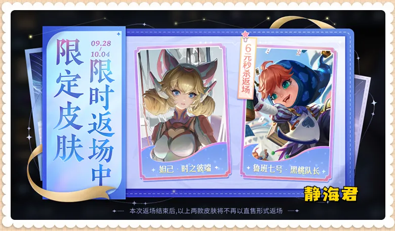 这两个秒杀皮加起来一共是120点券。 ⑵2款限定皮肤 李白的文创皮肤(谪仙醉月)终于来了,该皮肤的品格为史诗,标签是限定,从9月30日开始上架时间,到11月30日结束,该皮肤共有两种获取方式: