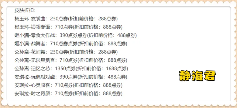 个人感觉,公孙离的影象之芯性价比最高(在皮肤销量排行榜的排名相对靠前),有必要的小同伴可以思量一下。 以上就是本次正式服更新的全部内容了,我是静海君,喜欢记得点个关注哦,Thanks(ω) |