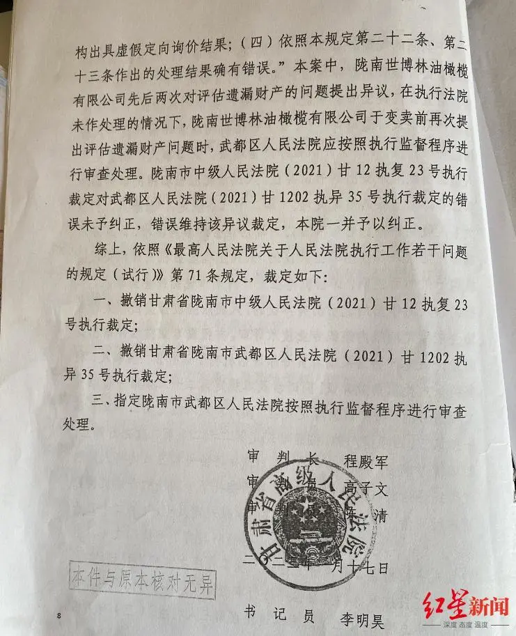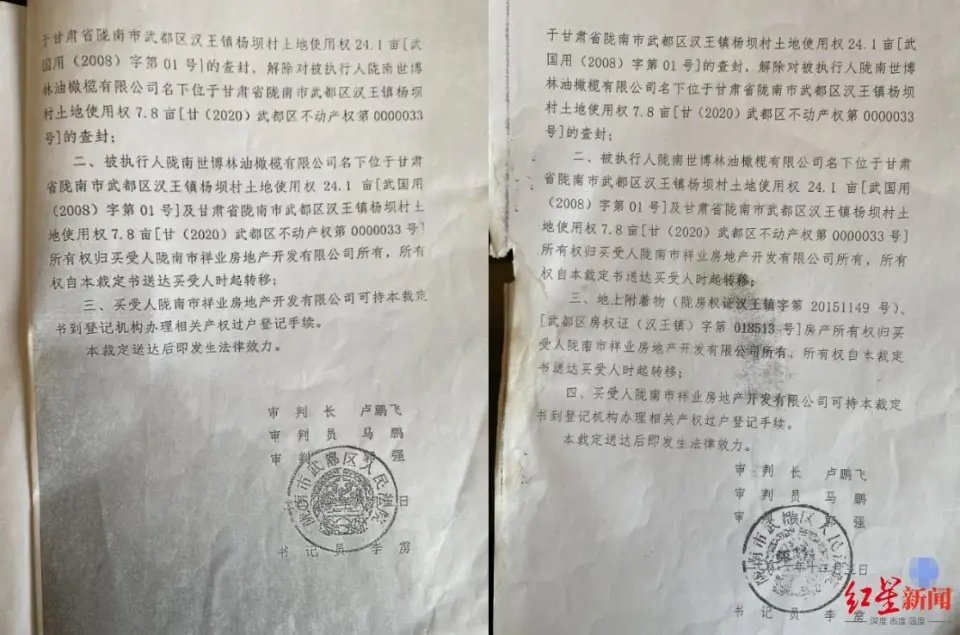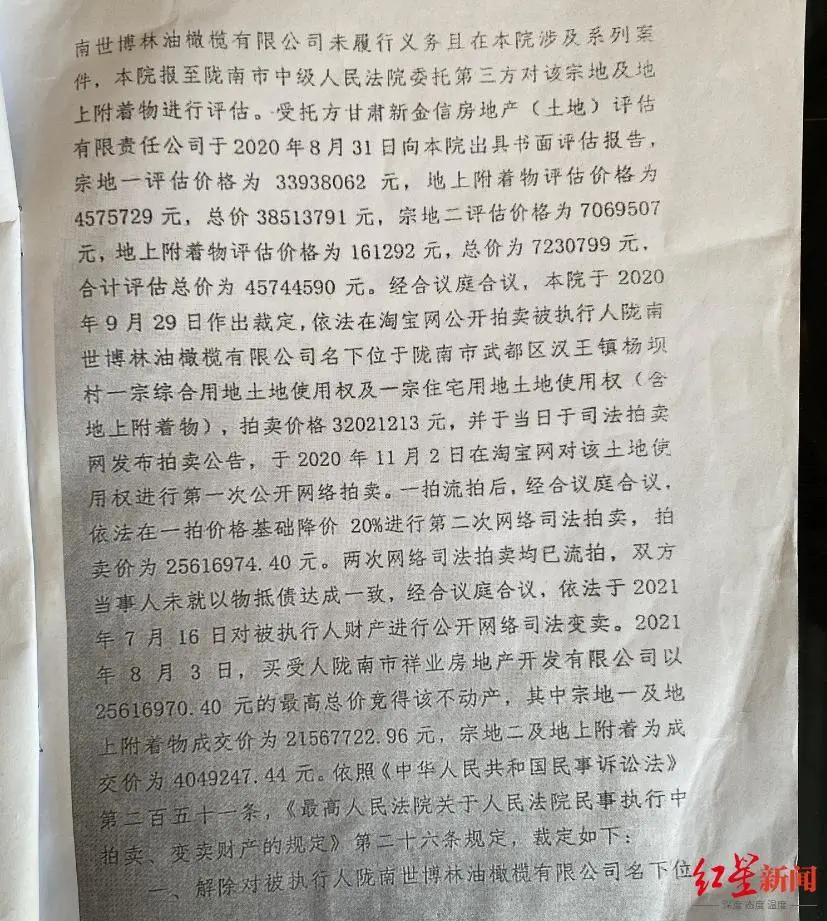 ▲世博林公司所在地 9月21日下战书,甘肃省陇南市武都区汉王镇杨坝村的一个厂房外,豆金荣指了指内里的厂房车间说:“那是我们的生产车间和办公室,内里的油橄榄生产装备和公司财物都被损毁了。” “厂房内的土地已被法院裁定给陇南市祥业房地产开辟有限公司,该公司在内里已建起两栋楼,此中一栋建到11层,另一栋建到了2层。我们申说后,现已被法院叫停。”豆金荣说。 带记者踏访现场的豆金荣是陇南世博林油橄榄有限公司厂长,公司董事长豆改林没来。豆金荣说:“这家企业是豆改林20多年的心血,他每次来都很难受,不忍心看到这一幕。” 但和已往比,豆改林好像正迎来一丝曙光:甘肃省高级人民法院打消了陇南市武都区法院、陇南市中院此前分别作出和维持的部分错误裁定,同时指定武都区法院按照实行监督步调举行审查处置处罚。 记者采访发现,只管原先土地上的在建项目已歇工,但依旧是一场较为漫长的拉锯战。这场拉锯战缘起于一场借贷—— -①- 生与死 “陇南市是我国油橄榄最佳适生区之一,基地面积、鲜果产量、初榨油产量和经济效益均居天下第一。”本年7月,《中国绿色时报》报道称,油橄榄已成陇南特色富民财产,群众稳固增收的“摇钱树”。 豆改林在当地曾被称为莳植和举行油橄榄加工的第一人。据豆改林先容,上世纪90年代初,他相应招呼,停掉砖厂改种油橄榄树。在地方当局支持下,莳植规模徐徐扩大。2002年起,他开始在陇南武都区城关镇构筑厂房,加工生产橄榄油。 随着生产规模扩大,2006年,豆改林将加工厂迁至汉王镇杨坝村建厂,这是一块总面积约32亩的土地,他同时购买了一些入口装备。 ▲豆改林在他的油橄榄林里 豆金荣提供的资料表现,陇南世博林油橄榄有限公司(下简称世博林公司)是一家从事油橄榄莳植、加工、研发和贩卖的财产化股份制民营企业。“我们接纳公司+基地+农户的运营模式。”豆改林说,现在公司有3000多亩油橄榄果园基地,年产油橄榄鲜果450多吨。 但由借贷引发的公司被查封,生产线停运,装备被搬离后,豆改林称,现在他已没有本身的加工基地,只好找其他企业代加工。 这源于一场借贷。 豆金荣说,为扩大生产,2017年3月8日公司向张晓梅、者力母子借款1000万元。4个月后,即2017年7月7日归还本金200万元,尚欠的800万元续签了一份借款协议。 张晓梅是当地一名企业家,其子者力此前是一名公职职员,现在已去职。 “每月利钱是20万元,到2019年我们共归还本息610万元。”豆金荣说,厥后,张晓梅将债权转移给其支属马金智。 2019年初起,世博林公司一连三个月还不上利钱后,申请人通过武都区法院出具民事调解书,因调解书中的还款诉求未能满意,进入司法裁定步调。同年10月15日,武都区法院裁定将世博林公司约32亩使用宗地在1000万元标的内,予以查封,以保障马金智的权益。 ▲如当代博林公司内的场景 -②- 是与非 “负债还钱,天经地义。但我没有欠马金智的钱,我也不熟悉他。”豆改林说。 但更大抵牾发生存着博林公司约32亩使用宗地的拍卖和实行中。豆改林称,拍卖前,即2018年,陇南市当局下属的富民公司委托中联资产评估团体(甘肃)公司评估世博林公司代价为1.03亿元,而2020年武都区法院委托甘肃新金信房地产评估公司(下称新金信公司)评估代价仅为4574万元,两者相差5807万元。 ▲武都区法院实行裁定书 地块两次流拍后,2021年8月,由原来的债权人者力控股的陇南市祥业房地产开辟有限公司(下称祥业公司)终极以约2562万元乐成竞得。 豆改林对新金信公司的评估代价提出贰言,该公司也就此举行相识释,但豆改林并不承认。而对豆改林所称的1.03亿元的评估价,者力也不承认,他告诉记者:“这宗土地流拍了两次,最后由我们买下。” 2021年8月25日,武都区法院作出(2021)甘1202执异35号《实行裁定书》表现,该院以为豆改林提出的贰言不创建,驳回其贰言申请。 随后,豆改林向陇南市中级人民法院申请复议,2021年11月4日,陇南市中院出具的(2021)甘12执复23号《实行裁定书》表现,豆改林的复议申请被驳回,陇南市中院维持武都区法院作出的上述贰言裁定。 豆改林照旧不平,他继续向甘肃省高级人民法院申说。2023年1月17日,甘肃省高院作出(2022)甘执监7号《实行裁定书》以为,“世博林公司先后两次对评估遗漏财产的题目提出贰言,在实行法院未作处置处罚的环境下,世博林公司于变卖前再次提出评估遗漏财产题目时,武都区人民法院应按照实行监督步调举行审查处置处罚。陇南市中级人民法院(2021)甘12执复23号实行裁定对武都区人民法院(2021)甘1202执异35号实行裁定的错误未予改正,错误维持该贰言裁定,本院一并予以改正。” ▲甘肃省高院实行裁定书 据此,甘肃省高级人民法院对陇南市中院和武都区法院的上述实行裁定均给予打消,同时指定武都区法院按照实行监督步调举行审查处置处罚。 2024年6月2日,武都区法院出具(2023)甘1202执监1号《实行裁定书》表现,其打消了自身之前作出的(2019)甘1202执3119号之二、之三、之四实行裁定书。 红星消息注意到,打消的这几份裁定书重要涉及世博林使用宗地其时拍卖的评估价和变卖价格。6月2日武都区法院出具的《实行裁定书》称,“新金信公司在评估时评估步调严峻违法,对其评估结果不予采纳”,理由是“评估陈诉上署名的黄某、张某元二位土地评估师未到现场勘查,未到场