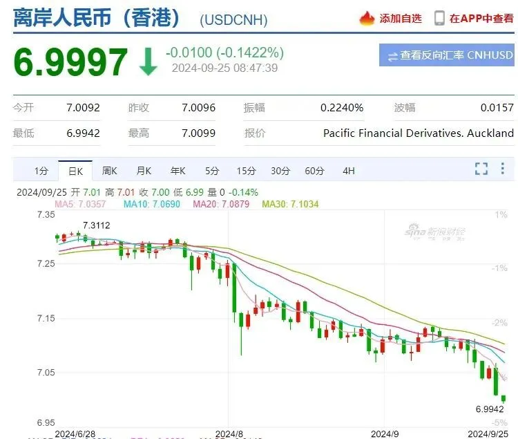 毫无疑问! 本日早上,人民币对美元的离岸汇率突破了7的关口,最新报价是6.9997元人民币兑换1美元。 这是16个月以来,人民币汇率重返7以内。 从本年7月初的7.31升值到现在的6.99,短短2个多月的时间里人民币升值了近3200个基点。 从昨天的一系列大利好,到本日的破7,国庆前,终于来了大红包,港股,大A,还有金融、地产股等等,都起来了。 所以,老乡,这个国庆出国旅游吗?能换许多多少外汇。 但是,各人不要太上头,人民币升值,对出口是倒霉的呀,短期升太多可能会有干涉!别的,大A是不是会捅刀子,还得留意,赚了的,不要上头,没赚的,不要乱冲! |