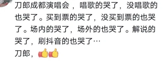 刀郎20年后为大家带来一场音乐盛宴,成都演唱会,热血沸腾,人山人海, 场内1.8万个座位挤得满满当当。听说,场外也有2万人,热闹非凡。 故意思的是,刀郎只穿着一件黑色T恤下搭休闲裤,没有半点形象可言。他个性十足,本身惬意就好,这也是刀郎与其他歌手与众差别的地方。 刀郎刚出道时身材很瘦小,又年轻。2024年的他已经年过半百了,身材发福,肚子圆圆的。不外,他不在意,不会刻意去减肥来迎合谁。反正,歌迷们也不介意肥胖的刀郎。 刀郎没有化装、没有伴舞、没有煽情。其他歌手开演唱会,风雅的妆容,衣服换了一套又一套,约请高朋等。相比起,刀郎的演唱会别有一番风味,没有富丽的舞台、灯光、服饰,让人感觉很接地气。 刀郎的声音沙哑,又带有沧桑。他一个人在台上唱了3个半小时,一共唱了39首歌、在线人数有5000多万,7亿多点赞。 2024 年 9 月 3 日,《纽约时报》报道了刀郎的线上音乐会《山歌响起的地方》,盛赞他:代表中国真正音乐人的最高水平。 刀郎这一场演唱会开通了线上打赏,设置最高打赏仅是10元。在网络上听说,一共收入2600万元, 刀郎全部捐给新疆守卫儿童成长项目。 刀郎年轻时一次去口试时,老板问:放着一两万的钱不挣,干嘛要做一个月一千块的粗活?刀郎这么答复说:我挣钱养音乐,而不是靠音乐挣钱。这句话听起来很有毛病,老板果断的不录用他。 值得一提的是,刀郎演唱会上的各种乐器。有古琴、二胡、箫、马头琴、唢呐、阮、板胡等多种民族乐器。演奏者也是高学历的科班出身,还有著名演奏家。由此可见,刀郎对音乐的要求很高,本身穿着朴素不要紧。 刀郎在演唱会上专门花6分钟的时间,先容乐队的每一位成员。让在场的歌迷们以及镜头前的观众看到他这个顶级乐队的面目面目,真是大开眼界。 在现场许多刀迷一起与台上的刀郎合唱,相互都很默契,现场的氛围炸裂了。 刀郎唱《喀什葛尔的胡杨》、《手内心的温柔》时,几度哽咽,台下观众也是泪流满面,一起呐喊:加油!刀郎感慨体现:年纪大了,感情管理着实太糟糕了。 《恋人》这首歌的音乐响起时,刀郎跳起了舞。固然谈不上专业的舞蹈,但黑白常可爱。 《2002年的第一场雪》、《激动的处罚》、《西域情歌》、《罗刹海市》都是刀郎的经典名曲。 有报道说:刀郎火了。从荒原大漠到繁华都市,从菜市场到剃头店,随处是刀郎粗犷的嗓音。 演唱会接近尾声时,刀郎特意唱起了一首《谢谢你》。很显着,他是为报答歌迷们。 有歌迷感叹:刀郎的这一场演唱会就像是一场感情的宣泄,每一个在场的人仿佛都把本身克制已久的感情,跟着这首歌一起释放了出来。现场的歌迷不但陪唱,还陪哭,似乎歌迷们与刀郎久别相逢。 究竟上,如果刀郎不是对音乐非常的器重,付出超乎其他人的毅力。要否则,他怎么大概20年后回到大众视野,还是那么惊叹呢! 以是刀郎这一次演唱会举行那么乐成并非是偶尔性,也不是所谓的运气加持,而是他自身对音乐的热爱与执着。刀郎在音乐方面投入了许多的心血,他与其他歌手的歌曲不一样的是,他的歌曲参加了儒释道。在他心目中,音乐是很纯粹的。 只管刀郎是草根出身,但他也是靠本身的真本领征服了歌迷们。最难得难得的是,在这个物欲横流的社会,刀郎竟然可以坚持走本身的路线。不会刻意迎合其他人,不会容易被别人带节奏,有本身独特见解。刀郎依附这一点,成为了现在的万众瞩目。 有劳绩的人,人生总是履历跌荡升沉。刀郎从高峰掉到谷底,又从谷底直播云宵。他的光辉其他科班出身,在乐坛顶级的歌手也无法企及。 |