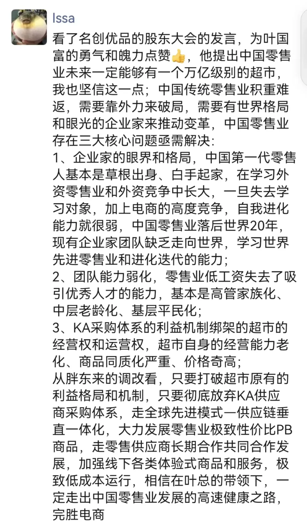 01 63亿,买下永辉超市 谁也不会想到,曾经谁人做“十元店”交易的叶老板有一天会买下永辉超市。 前两天,名创优品,就是许多人以为是日本品牌,实在是国牌的名创优品,忽然宣布: 花近63亿,从京东、洋行之王的手中,买下永辉超市29.4%股份。 这也导致永辉超市易主,名创优品成为第一大股东。 一片哗然! 对于此次出售大比例股权,永辉超市也同步举行了公告: 9月23日晚间,永辉超市股份有限公司公告,公司股东牛奶有限公司、北京京东世纪贸易有限公司和宿迁涵邦投资管理有限公司(系京东世贸的一致举措人)拟通过协议转让的方式向广东骏才国际商贸有限公司分别转让其所持有的永辉超市公司19.13亿股股份、3.67亿股股份和3.88亿股股份,分别占公司总股本的21.08%、4.05%和4.27%。 “大家都看不懂就对了,如果都看得懂我就没偶尔机了。” 9月23日晚上8点,名创优品首创人、主席兼首席实行官叶国富在朋侪圈留下了如许一句话。 说真话,我不知道有多少人看不懂叶老板的利用,我反正是没看懂。 而变乱回溯,7月30日叶国富的一则朋侪圈,就已经体现了端倪。 不管怎么样,名创敢拿出60多亿真金白银看好国内零售业,就值得称赞嘛。毕竟这是沉寂了数年后,实体零售范畴少有的一种正向信号! 然而对许多人来说,这是一个很大的不测,但资源市场,对此反应好像并不积极。 停止9月23日晚,名创优品美股大幅低开,最高曾跌幅扩大逾17%。 分析市场对这次名创收购永辉是持负面态度。 资源已经用脚投票了! 02 叶国富昏头了? 叶国富收购永辉的重要缘故原由之一照旧与胖东来有关。 听说,叶国富因为一份红薯条,成为胖东来的老实粉丝。 看到胖东来爆改永辉超市后,继而萌生了收购的想法。 在电话沟通会上,名创优品主席兼CEO叶国富体现,之以是投资永辉是因为中国线下超市面临20年一遇的结构性时机,即胖东来模式。 也就是这场会上,叶国富提了20多次胖东来! 7月30日,叶国富到河南郑州,看了胖东来帮永辉调改的第一家店,发现“胖东来版永辉”发生巨大改变,客流量、业务额翻倍增长,随后的8月他再度前往河南观察。“我就在想如果这个店是我的该多好。”叶国富体现。 他以为,不是线下零售不可了,而是传统零售和传统超市贸易模式有标题。而如今,以永辉为重要代表的一批国内超市掀起了一场厘革,这种厘革将重塑中国线下超市的格局,而作为胖东来手把手调教出来的永辉,有巨大的潜力在这场厘革中脱颖而出。 特别是胖东来在帮扶永辉调改的过程,永辉是多层级、大规模的团队亲身到场,逼真感受,加上胖东来的无私分享、大爱输出,包管了调改,也全面保障了永辉学习和吸收的效果。 “渴望大家给点耐心,我渴望大家相信我的眼光,我是一个不光在中国看,我在全球看零售业的,别的地方我会做错,但在零售这一块我绝对不会做错的。” 叶国富体现。 不过,永辉超市当前在胖东来的帮扶下,依然不能扭转公司业绩下滑的局面。 8月23日晚间,永辉超市发布2024年半年度陈诉体现,公司上半年实现业务收入377.79亿元,同比降落10.11%;净利润2.75亿元,同比降落26.34%;扣非净利润2986.25万元,同比降落69.94%。 永辉超市永久只能学到胖东来的皮毛,而学不到根本。为啥? 因为胖东来模式的焦点在于东来本人,他是真的把员工当人看,把顾客当人看,专心谋划企业的人民企业家,这种企业文化根植于首创人的认知,别人想抄都不一定抄得来。 举个简单的例子,在一样寻常企业,“关爱员工”就像是标语,大家都喊,但不是大家都信。 在胖东来不一样,员工貌似会发自内心的说出“我们老板对我们特别好”。好到什么水平呢?就连“不开心假”,每年都有十天。员工提交了,主管还不能不批,不批就违规。 在“内卷”、“价格战”、“降本增效””风潮愈演愈烈,“劣币驱逐良币”征象肆虐的当下,别的企业学都不敢学。 胖东来大概可以救济永辉超市的一家门店大概几家门店,但应该没有可能救济永辉超市的近千家门店。 叶国富花63亿就想买来胖东来模式,大概是一厢甘心的抱负。 永辉也是出了名的烂摊子,当初腾讯投了40几个亿如今浪费的还剩10个亿左右。 京东在2015年以43.1亿元的价格持有永辉超市10%的股权,其时双方渴望通过这一方式加强在供应链管理、O2O范畴的相助。 效果,相干范畴推进缓慢,相当于被坑了。如今京东选择退出,只留了2.94%的股份,分析其对与永辉的相助远景预期不佳,仅仅保存了一丝相助时机。 如今名创优品来接盘,昨晚美股名创优品股价大跌已经分析确市场的态度。 但叶老板也是见过大风大浪的,大概真有什么别人看不到的厘革在发生,被他捉住了。 03 正在疯狂扩张的名创优品 故事的主人公叶国富,1998年南下广东打工,从事五金贩卖工作。 2002年,叶国富与老婆杨云云在佛山开设了第一家扮装品店,不到一年时间,他们又相继开了3家扮装品店。 2004年,叶国富选择扮装操行业开始二次创业,2005年正式创建公司,将公司定名为“哎呀呀”。 哎呀呀其时针对的是13-26光阴收入在3000块以下的女性,很快就做到了天下3000家门店,年收入10亿元。还乐成得到了知名机构达晨创投的投资。按此计算,公司的利润估计也就是几千万。 其时也曾经计划去A股上市,从工商信息也可以看出,公司已经股改了,叫“广东哎呀呀饰品连锁股份有限公司”。可惜厥后未能乐成上市,哎呀呀也元气大伤。 厥后
