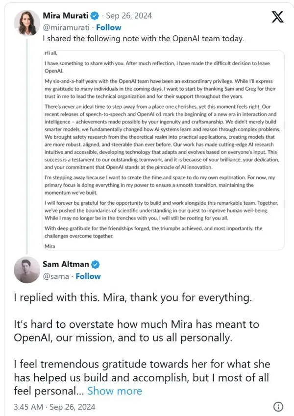 2024年9月26日,OpenAI再次发生巨大高层人事变动,多位高层相继公布离职,现在原始建立团队只剩下三人。 北京时间26日破晓3时34分,首席技能官(CTO)米拉·穆拉蒂(Mira Murati)率先在外交媒体上公布了这一消息。 米拉·穆拉蒂。 紧随厥后,首席研究官鲍勃·麦格(BobMcGrew)和研究副总裁巴雷特·佐夫(Barret Zoph)也相继离开,连续串的人事震荡在科技界引发了广泛关注和热议。 首席技能官离职后,两位核心骨干也相继离职 米拉·穆拉蒂在X平台(原推特)上发表了声明,公布她将离开OpenAI。 “经过深思熟虑,我做出了离开 OpenAI 的艰巨决定,”她在帖子中说。 “永远没有一个理想的时间从本身珍视的地方离开,但现在感觉正符合……我与OpenAI 团队一起度过的六年半韶光是一种非凡的荣幸。”穆拉蒂是OpenAI的告急向导人物之一,主导了许多关键项目。 就在穆拉蒂公布离职的数小时后,OpenAI的首席研究官鲍勃·麦格鲁和研究副总裁巴雷特·佐夫也公布离开公司。CEO山姆·奥特曼在一则公开帖子中证实了这一消息。他写道:“Mira、Bob和Barret是独立且友好地做出了离职的决定,但鉴于Mira的决定时机,我们以为有须要同时公布,以便我们可以或许共同为下一代向导层的顺遂交接做准备。” 鲍勃·麦格鲁在他的离职声明中表现,“现在是我该休息的时间了。已往八年在OpenAI的经历令人谦卑和敬畏。我在2017 年 1 月到场的小型非营利构造,已经成为天下上最告急的研究和摆设公司……我对OpenAI的向导层布满信心。”巴雷特·佐夫则表现,现在是他“探索OpenAI之外新时机的天然时机”。 汹涌科技注意到,米拉·穆拉蒂于2018年到场OpenAI,担任应用AI和合作伙伴关系副总裁,随后在2022年提拔为CTO。在她的向导下,OpenAI推出了环球风靡的AI聊天呆板人ChatGPT、图像天生模子DALL-E,以及为GitHub Copilot提供支持的代码天生体系Codex。她和麦格鲁、佐夫是近几月来最新离开OpenAI的高层。著名研究科学家安德烈·卡帕西于2月离开OpenAI,伊利亚·苏茨克弗和前安全负责人扬·莱克于5月公布离职,团结首创人约翰·舒尔曼上个月表现,他将离职到场竞争对手 Anthropic。 2015年资助建立OpenAI的 13 人以创造通用人工智能为使命(AGI,一种被以为可以或许做人类大脑所能做的任何事变的呆板)。现在,仅有 3 人还留在OpenAI。而留下的首创人之一、公司总裁格雷格·布罗克曼(Greg Brockman)也已将休假时间延伸至年底。 至此,在2015年建立 OpenAI 的 13 人中,只剩下 3 人。 离职缘故原由或与公司将转为传统营利性有关 面临高层离职,奥特曼敏捷公布了新的向导层任命。研究副总裁陈马克(Mark Chen)被提拔为高级研究副总裁,将与新任首席科学家雅库布·帕乔茨基(Jakub Pachocki)共同向导研究部分。曾任安全主管的马特·奈特(Matt Knight)将担任OpenAI 的首席信息安全官。首席产物官凯文·韦尔(Kevin Weil)和工程副总裁斯里尼瓦斯·纳拉亚南(Srinivas Narayanan)将继承向导应用团队,负责将公司的技能带给企业和消耗者客户。研究科学家乔什·阿希姆(Josh Achiam)将担任新的使命对齐负责人。奥特曼表现,他将“在整个公司内工作,确保我们把全部的部分和文化都做好,以便乐成实现我们的使命。” 奥特曼在公开信中表现:“已往一年多来,我的大部分时间都花在了公司的非技能部分;现在,我等待将更多时间投入到公司的技能和产物部分。”他还夸大,向导层的变动是公司发展中的天然过程,试图安抚员工和外界的担心。 “成为 OpenAI 的向导者非常泯灭精力,”奥特曼在他的帖子中说。“一方面,可以或许创建AGI,并成为将我们的先辈研究交到数亿人手中的最快成长的公司,这是特权。另一方面,向导一个团队完成这统统是无情的——他们已经逾越了公司的职责范围。” 这一系列高层人事变动发生在OpenAI年度开发者大会(DevDay)之前,也正值OpenAI筹划从非营利机构转向营利性实体的关键时期。 《纽约时报》援引两位知恋人士消息,OpenAI的高管们正在渐渐离开这家初创企业是由于CEO奥特曼及其他高管致力于将OpenAI转变为传统的营利性公司。现在,OpenAI由一个非营利构造的董事会控制,该构造是奥特曼及其团结首创人在2015年底创建的,负责监督该公司的技能发展。 根据多家媒体报道,OpenAI正在寻求一轮新融资,估值可能超过1500亿美元。微软、英伟达、苹果和Thrive Capital等均在商谈投资变乱。根据彭博社等报道,该轮融资规模可能高达65 亿美元。而奥特曼筹划将初次得到OpenAI占比约7%的股权。 OpenAI 急需这笔资金。据The Information报道,该公司已在模子练习上泯灭了约 70 亿美元,在职员配备上泯灭了 15 亿美元。据称,ChatGPT 单独的运行本钱一度天天高达 70 万美元,奥特曼曾表现,练习公司曾经的旗舰模子GPT-4 的本钱超过 1 亿美元。 TechCrunch报道称,“在新一轮融资的配景下,关于公司方向的分歧可能是压垮骆驼的末了一根稻草。”在OpenAI 将举行的年度开发者大会上,外界或将可以或许得知更多信息。 |