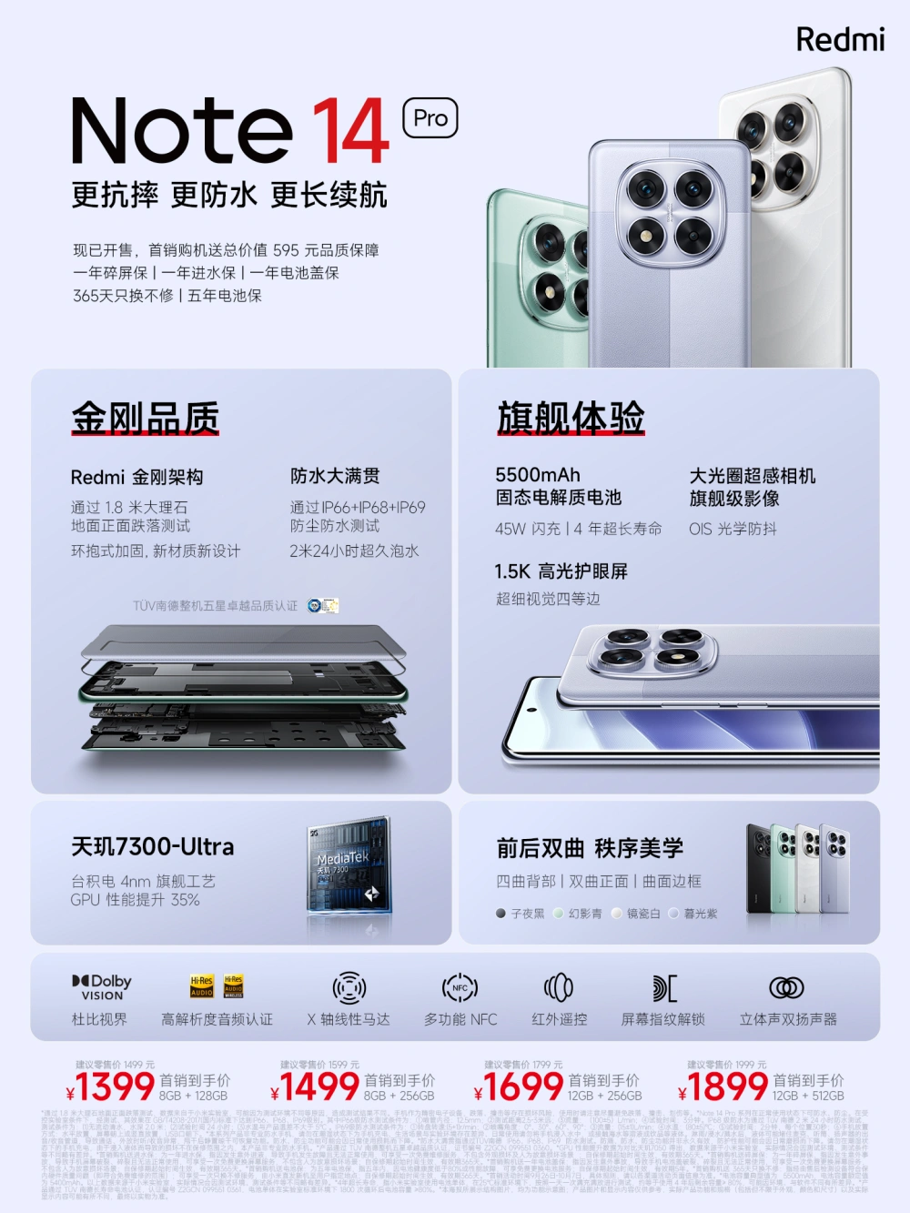 9月26日,Redmi在北京举行了Redmi Note 14系列新品发布会,作为Note系列的十年之作,Redmi可以说对它倾注了大量的心血,说它是当下Redmi Note系列以致同价位中性价比最高的产物也不为过。 (图片泉源:小米官方) 雷科技受邀到场Redmi Note 14系列新品发布会并报道,接下来就跟着小雷一同看看这款产物到底怎样吧。 外貌大升级,Note系列的最优雅之作?大概早些年各人对于Redmi Note系列的印象是性价比高,但外貌设计不停有些“直男”和“自制”。而从客岁的Note 13系列开始,Redmi就增强了Note 系列的外貌设计。因此在全新的Note 14系列上,我们见到了极具特色的设计以及媲美旗舰的机身质感。 (图片泉源:小米官方) Note 14系列接纳了镜头中置的设计,为了提拔团体的高级感,Redmi还在外圈接纳了一圈精雕纹理设计。机身背部也接纳了双曲面设计,让整机的握持手感大大提拔。 在配色方面,Redmi Note 14系列提供星沙青、镜瓷白以及子夜黑三种配色。 除了设计和配色方面的改动,Redmi Note 14系列还在机身架构方面举行了升级,此中Note 14 Pro+接纳了全新的金刚架构,机身双面均搭载了耐摔性更强的康宁大猩猩玻璃,再搭配无极避震设计,在抗摔性能方面相比上代提拔了100%,是同档产物中耐摔性最强的产物之一。 (图片泉源:小米官方) 大概各人都没有想到,Redmi居然还为其配备了IP66 & IP68 & IP69 满级防水,再加上首销器件赠送的一年电池盖保+一年碎屏保+一年进水保+五年电池保+ 365 天只换不修服务,可以说Redmi Note 14系列又大大低落了用户的利用资源。 性能仍旧顶尖,最强Note到临在硬件设置方面,Redmi Note 14 Pro+环球首发了第三代骁龙7s处置惩罚器,其接纳台积电4nm 制程工艺制成,旗舰同款4*A720 + 4*A520 CPU架构,对比第二代骁龙7s,安兔兔跑分提拔25%,是一款性价比和性能都非常出色的处置惩罚器。 (图片泉源:小米官方) 得益于这颗全新的处置惩罚器,Redmi为Note 14 Pro+配备了一套豪华的影像设置:主摄为光影猎人800,拥有1/1.55英寸的超大底以及同档有数的13.2EV 原生超高动态范围。别的60mm的长焦镜头也能资助用户实现更多角度的构图伎俩。这套组合也让小雷有些不测,谁能想到现在的Redmi Note系列也用上高规格的长焦镜头了呢? (图片泉源:小米官方) 别的,Redmi Note 14 Pro+还拥有一块6.67英寸1.5K高光护眼屏,支持120Hz 革新率、最高3000nits的峰值亮度、20000 级主动亮度调节、小米青山护眼方案和原色屏等一系列特性,也因此它通过了“视觉康健友爱度S++ 认证”及“TV莱茵三重护眼认证”。 续航方面也相称值得一提,Redmi Note 14 Pro+搭载了一块6200mAh的超大容量电池,也是Redmi首款搭载固态电解质技能的机型,共同2.8V 增压芯片,可实现低温长续航,共同90W的有线闪充技能,也能快速回一波血。 (图片泉源:小米官方) 至于Note 14 Pro和Note 14则分别搭载了天玑7300 Ultra和天玑7025 Ultra处置惩罚器,均实现了性能和能耗之间的均衡。其他方面的设置介于文章篇幅,各人可观看下方的详细的设置图。 (图片泉源:小米官方) (图片泉源:小米官方) 总结:Redmi的又一位“黑马”选手代价方面,Redmi Note 14系列的详细代价如下: Redmi Note 14: 6+128G版本:1099元; 8+128G版本:1199元; 8+256G版本:1399元; 12+256G版本:1599元。 Redmi Note 14 Pro: 8+128G版本:1399元; 8+256G版本:1499元; 12+256G版本:1699元; 12+512G版本:1899元。 Redmi Note 14 Pro+: 12+256G版本:1899元; 12+512G版本:2099元; 16+512G版本:2299元。 (图片泉源:小米官方) 总得来说,Redmi Note 14系列的定价可以说黑白常之本心,尤其是定位最高的Note 14 Pro+,2000元左右的代价就能买到如此设置的产物,这在两年前是想都不敢想的。Note 14则仍旧负担起了让更多用户都能用上好用的智能手机的重担,同样是一款出色的产物。我们也非常等待,在性能越来越强的将来,Redmi Note系列还能给我们带来多少惊喜。 |
