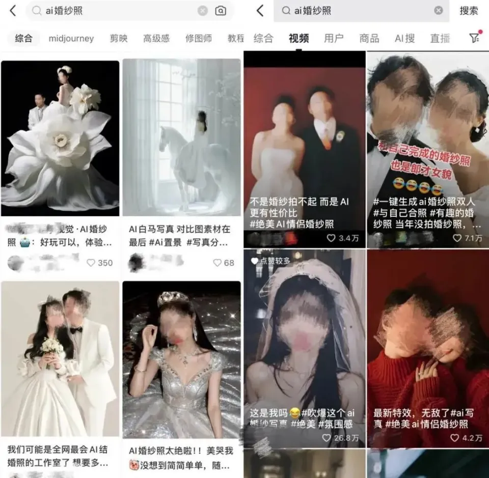 谁还去影楼拍婚纱照? 听筒Tech(tingtongtech)原创 文 | 小 听 编| 饶 言 随着国庆黄金假期的到来,一年一度的“全民完婚季”又将拉开序幕。 准备婚服、婚车,宴请宾客和各种仪式流程,准新娘和新郎们忙得不可开交。一套精致的婚纱照,也是新人们的完婚必备。 为什么肯定要拍婚纱照? “婚纱照不但仅是一个情势,还蕴含对优美生存的向往”、“记载会让追念变得丰富”、“照片的意义就是把刹时酿成永恒”......不少网友如许表现。 但动辄拍摄流程上月、费用上万的婚纱照,却让这些年轻人不堪重负。 “拍一套婚纱照,不但须要耗费大量的时间,更重要的是,代价也不菲,稍微有质感的婚纱照,都要上万(元)起。”正在准备婚礼的田密斯如许对《听筒Tech(ID:Tingtongtech)》感慨,“还没结上婚,婚纱照就花了预算的大半。” 但近来,田密斯在琢磨新的婚纱照拍摄方式。不须要服装,不须要妆照,更不须要去现场,在电脑或手机上打开软件,点击鼠标,未发生的事,未去过的地方,未穿过的衣服,就被留在照片上。 这便是时下席卷年轻人的“AI图片处理”功能。随着AI技能的快速迭代,不少软件的AI图片处理功能日益强盛。 AI功能生成的婚纱照,险些可以或许以假乱真,不少个性且精致的殊效,更是逾越实际,完善契合当代年轻人的个性需求。 “有些软件制作出来的结果,线下照相馆完全无法实现,但却恰好是我想要的。”在田密斯看来,AI照相的功能,更能满意本身的需求,“制作一张‘无中生有’的婚纱照,不但只须要少少的费用,有些以致免费,更不须要耗费大量的时间。” 随着AI技能的发展,市面上诸多应用推出了AI功能,通过AI技能为顾客“改头换面”,制作风雅、完善的照片,而这些照片,只须要付出几元或几十元即可获得,有些以致是免费。 AI功能的出现,也让线下照相馆陷入争议,斲丧者尚有须要耗费不菲的代价,去照相馆里拍摄婚纱照吗? -01-用AI实现婚纱照自由 用AI拍婚纱照,成为时下最潮流的方式。 在小红书,搜“AI婚纱照”,相干的条记有上万;在抖音,“AI婚纱照”话题播放量超过4.5亿次。 田密斯便是在交际平台打仗到AI婚纱照的,在看到那些AI制作出来的精致婚纱照后,她迅速心动,“谁不知道AI婚纱照,我都会伤心的。” 田密斯是一祖传媒公司员工,早在2023年就打仗到了AI图片生成软件,对AI软件生成的照片赞不绝口。 不外,刚开始的时间,她并没有考虑用AI来生完婚纱照,“有家婚纱馆的旅拍,宣传得特别诱人,再加上我也恰好想去旅个游,便选择了旅拍婚纱照。” 但遗憾的是,旅拍出来的婚纱照却让田密斯一言难尽,“天气不太好,拍出来的结果远不如预期,本身还累得半死。” 在刷到交际平台晒出的AI婚纱照后,田密斯决定用AI软件来救济本身的婚纱照。 田密斯用的软件是某头部视频制作APP,生成步调非常简单。打开APP点击“剪同款”,搜刮栏输入“AI婚纱照”,选择一个喜好的模版,到场本身的照片后,等待生成,便可以获取差异的婚纱照结果,“满意的生存,不满意可重新生成。” “谁能想到,我耗费近万元的旅拍婚纱照,终极是靠AI免费救济的。”利用AI,田密斯生成了诸多精致的婚纱照,差异风格,差异殊效,差异场景,“更不消说实现妆照和服装自由了。” 图:交际平台晒出的AI婚纱照 来源:小红书(左)、抖音(右)《听筒Tech》截图 林老师同样用AI生成了本身的婚纱照,他采取的是时下正热的某AI图文生成工具。 林老师是大厂步伐员,作为一名技能流,一贯喜好捣腾时下盛行的软件。在准备完婚的时间,他本着研究技能,又想省钱、省时的目标,学会了用AI工具制作婚纱照。 在林老师看来,AI软件是“傻瓜式操纵”,打开软件,输入关键词“美丽的新娘、帅气的新郎”,以及特定的场景词、风格和照片参数,就可以主动等待生成。 生成之后,选择喜好的风格,更换成本身的照片即可,“完全不须要浪费大量的时间和款项。” -02-用AI随处可见的“AI拍照馆” 备受年轻人追捧的AI功能,迅速吸引了商家的注意,“AI拍照”在市场迅速鼓起。 大量的图片编辑软件便是其中的范例。 “但凡叫得上名字的图片软件,大多都具备AI功能。”自从利用过AI功能生完婚纱照后,田密斯便热衷于该功能,她对市面上图片编辑软件的AI功能如数家珍。 “不外,遗憾的是,这些软件推出的免费模板有限,有些想要的结果还不能实现。”田密斯透露,如果要实现更精致的婚纱照,花钱是必不可少的,“为了实现想要的结果,我也在一些AI软件上充了值。” 和上述斲丧者同样想法的年轻人不在少数,不外,他们并不抗拒在这些软件上花钱。在他们看来,花少少的钱,却可以实现婚纱照自由,远比传统婚纱照动辄上万的婚纱照划算。 AI婚纱照相馆以致开到了线下。 在交际平台,涌现了越来越多的线下AI婚纱拍照工作室。 一家谋划AI拍照的工作室,从本年开始在某交际平台推广本身的线下工作室,并上架了差异风格的“AI婚纱照”套餐,代价不到百元。 在条记中,该店肆老板给本身打的标签就是“AI拍照师”,其工作室主推一个“线上制作照片,无需线下拍摄”、“省钱省时间”。 据该网友透露,常常刷到有不少网友“花了几千拍出的婚纱照踩雷”、“邻近婚期来不及拍婚纱照”、“小预算但想要婚纱照大片”的吐槽,在他看来,在AI照相馆,这些问题都能获得办理。 AI婚纱拍照也开到了平台。 在淘宝和大众点评,有不少关键词为“AI”