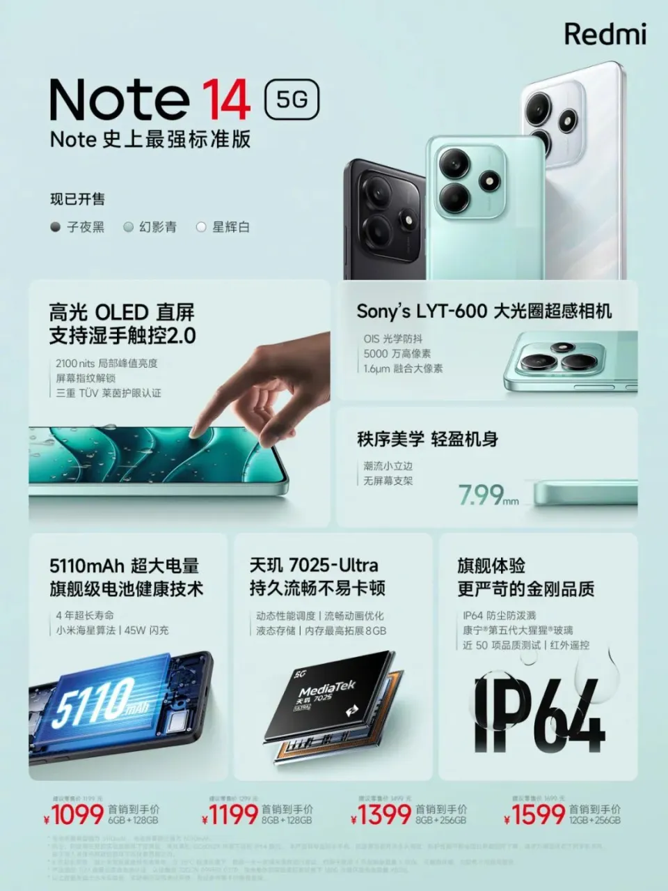 9月26日晚,Redmi Note 14系列正式发布。该系列共推出Note 14 5G、Note 14 Pro、Note 14 Pro+三款机型,建议零售价1199元起,首销得手价1099元起。 Redmi Note 14 5G推出星辉白、幻影青、子夜黑三款配色,设置方面搭载天玑7025-Ultra芯片,同时接纳5110mAh电池和45W有线充电;搭载2400*1080 120Hz OLED直屏,支持2160Hz瞬时触控采样率、湿手触控2.0、三重TV莱茵护眼认证、屏幕指纹解锁等功能和特性;配备索尼LYT-600主摄传感器,支持OIS光学防抖;整机厚度为7.99mm,重量约190g。 ●6GB+128GB首销1099元 ●8GB+128GB首销1199元 ●8GB+256GB首销1399元 ●12GB+256GB首销1599元 Redmi Note 14 Pro共推出暮光紫、镜瓷白、幻影青、子夜黑四款配色,并初次接纳曲面屏操持。设置方面,新机接纳天玑7300-Ultra芯片,并接纳5500mAh电池和45W有线充电;接纳6.67英寸1.5K高光护眼屏,视觉四等边操持,120Hz革新率,并支持2560Hz瞬时触控采样率、3000nits局部峰值亮度、屏幕指纹解锁、三重TV莱茵护眼认证等功能和特性;搭载索尼LYT-600主摄传感器、800万像素超广角、200万像素微距三摄模组,支持胶片滤镜、万物追焦2.0等功能;整机厚度为8.24/8.46mm,重量约190g。 其他方面,Redmi Note 14 Pro接纳Redmi金刚架构、X轴线性马达、IP68防尘防水,并通过TV南德2米24小时防水测试。 ●8GB+128GB首销1399元 ●8GB+256GB首销1499元 ●12GB+256GB首销1699元 ●12GB+512GB首销1899元 Redmi Note 14 Pro+共推出星沙青、镜瓷白、子夜黑三款配色,摄像头模组操持和Pro版本有所差异;设置方面,新机环球首发第三代骁龙7s芯片,支持《王者光彩》120FPS模式,并搭配可提升数据和GPS信号的汹涌T1增强芯片;内置6200mAh硅碳电池,支持90W有线充电;1.5K OLED曲面屏,120Hz革新率,并支持2560Hz瞬时触控采样率、3000nits局部峰值亮度、小米青山护眼、屏幕指纹解锁、三重TV莱茵护眼认证等功能和特性;后置光影猎人800主摄、800万像素超广角、5000万像素JN1人像长焦;整机厚度为8.66mm,重量约210.8g。 其他方面,Redmi Note 14 Pro+接纳Redmi金刚架构、X轴线性马达,通过南德IP66/IP68/IP69测试和南德2米24小时防水测试。 ●12+256GB:首销1899元 ●12+512GB:首销2099元 ●16+512GB:首销2299元 |