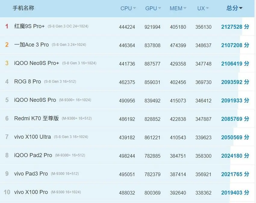 进入10月份,我们一起来看看最新的安卓手机性能排行榜(数据泉源:安兔兔),本排行榜基于CPU、GPU、内存(RAM)以及用户体验(UX)的综合评分,根本能看出来纯粹的性能维度,当前安卓阵营中的性能强者。 NO.1:红魔9S Pro+ 10月份排行榜中,红魔9S Pro+ 以总分2127528分的优异结果摘得桂冠。这款手机搭载了高通骁龙8 Gen3 OC 24+1024的顶级处理处罚器组合,不光在CPU和GPU上表现精彩,分别得到了444224分和921994分的高分,其内存性能和用户体验也同样令人瞩目,分别到达了405180分和356130分。红魔9S Pro+ 的强势表现,无疑为游戏手机和性能爱好者树立了新的标杆。 N0.2:一加 Ace3 Pro 第二名,一加 Ace3 Pro,这款手机同样搭载了高通骁龙8 Gen3处理处罚器,但设置略有差别,为24+1024版本。一加 Ace3 Pro 在CPU上得到了446364分的高分,略胜红魔9S Pro+ 一筹,但在GPU和内存方面则稍显逊色,分别得到了837808分和474399分。不外,其用户体验得分依然保持在较高水平,到达了348637分,总分2107208分,稳居排行榜第二。 NO.3:iQOO Neo9S Pro+ iQOO Neo9S Pro+ 同样不错,以总分2106419分位列第三。这款手机在CPU、GPU、内存和用户体验方面均表现精彩,尤其是GPU得分高达887577分,表现出其强大的图形处理处罚能力。别的,iQOO Neo9S Pro+ 在内存和用户体验方面也取得了不俗的结果,分别为429358分和347748分。 其他机型 除了前三名之外,ROG 8 Pro、iQOO Neo9S Pro、Redmi K70至尊版、vivo X100 Ultra、iQOO Pad 2 Pro、vivo Pad 3 Pro 以及 vivo X100 Pro 等机型也都在本次排行榜中显现出了强劲的力气,均得到了前10名的水平,就用户体验来说,这10款呆板在性能差异上也并不显着。 用户假如要选购呆板,可以多关注这10款机型,假如打游戏尽量选择评分高的呆板,假如关注影像、代价等其他参数,考虑其他机型,也是不错的,究竟一样平常使用,这10款机型均能带来非常好的表现。 (9041063) |