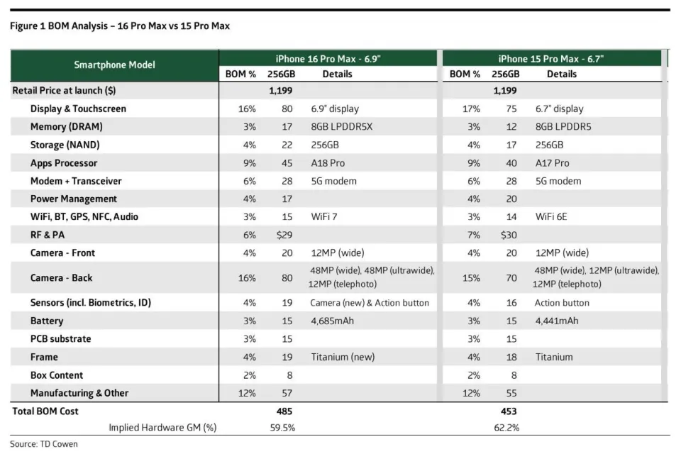 IT之家 10 月 2 日消息,市场观察机构 TD Cowen 最新公布的观察体现,制造一部 256GB 的 iPhone 16 Pro Max 手机,包罗零部件、产物组装以及包装等在内,整个物料资本为 485 美元(IT之家备注:当前约 3400 元人民币)。 相比之下,iPhone 15 Pro Max 的质料清单(BOM)为 453 美元,因此iPhone 16ProMax资本高32 美元,高 7%。 在 iPhone 16 Pro Max,最昂贵的组件是体现屏和后置相机模块,各为 80 美元,占总资本的 16%: