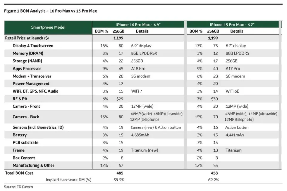 据市场调研机构TD Cowen最新观察表现,一部iPhone 16 Pro Max 256GB版本的团体物料资本为485美元,约合人民币3404元(包罗零部件、产品组装以及包装),而iPhone 15 Pro Max的物料清单(BOM)为453美元。 在iPhone 16 Pro Max的BOM清单上,最贵的零部件是屏幕和后置相机模块,都为80美元,占总价的16.5%。而相机也是相比上代涨价最多的零部件,为10美元。因为全球内存和固态硬盘涨价,以是内存和固态相比上代也上涨了5美元。相机按键+Action Button的组合,资本也比上代高了3美元。 非Pro机型的资本也有上涨,iPhone 16 BOM高达416美元,而iPhone 15只有395美元。 在iPhone 16的BOM清单上,屏幕最贵,为65美元,占总价的15.6%。资本涨幅最大的为内存,从iPhone 15的9美元上涨到17美元。 网友:固然iPhone本年资本涨了,但是售价仍旧保持不变,一时不知道是苹果本心发现了还是利润留的实在富足,反正一句话就能表达:Only Apple can do 克日,三星S25系列已成功入网,看来间隔S25系列的发布会已经不远了。 而据认证表现,型号为SM-S9380的三星S25 Ultra为卫星移动终端,而型号为SM-S9310和SM-S9360的S25和S25+都仅为5G数字移动电话机。 充电部分还是老样子,S25Ultra和S25+支持45W充电,不外充电规格变为15V3A,不是之前的11V 4.1A了,电池容量分别为5000mAh和4900mAh,S25支持25W,电池容量为4000mAh,三台手机均不附赠充电器。 厚度方面,S25系列全系-0.4mm,S25为7.2mm,S25+为7.3mm,S25Ultra为8.2mm。 三星S25 Ultra将搭载骁龙8 Elite for Galaxy,大核主频高达4.47GHz。屏幕方面,S25Ultra将搭载6.86寸 2K OLED屏幕,玻璃纯平无弧度,黑边进一步缩小,边框也变窄,以是宽度也有小幅缩减。 往期视频推荐 |