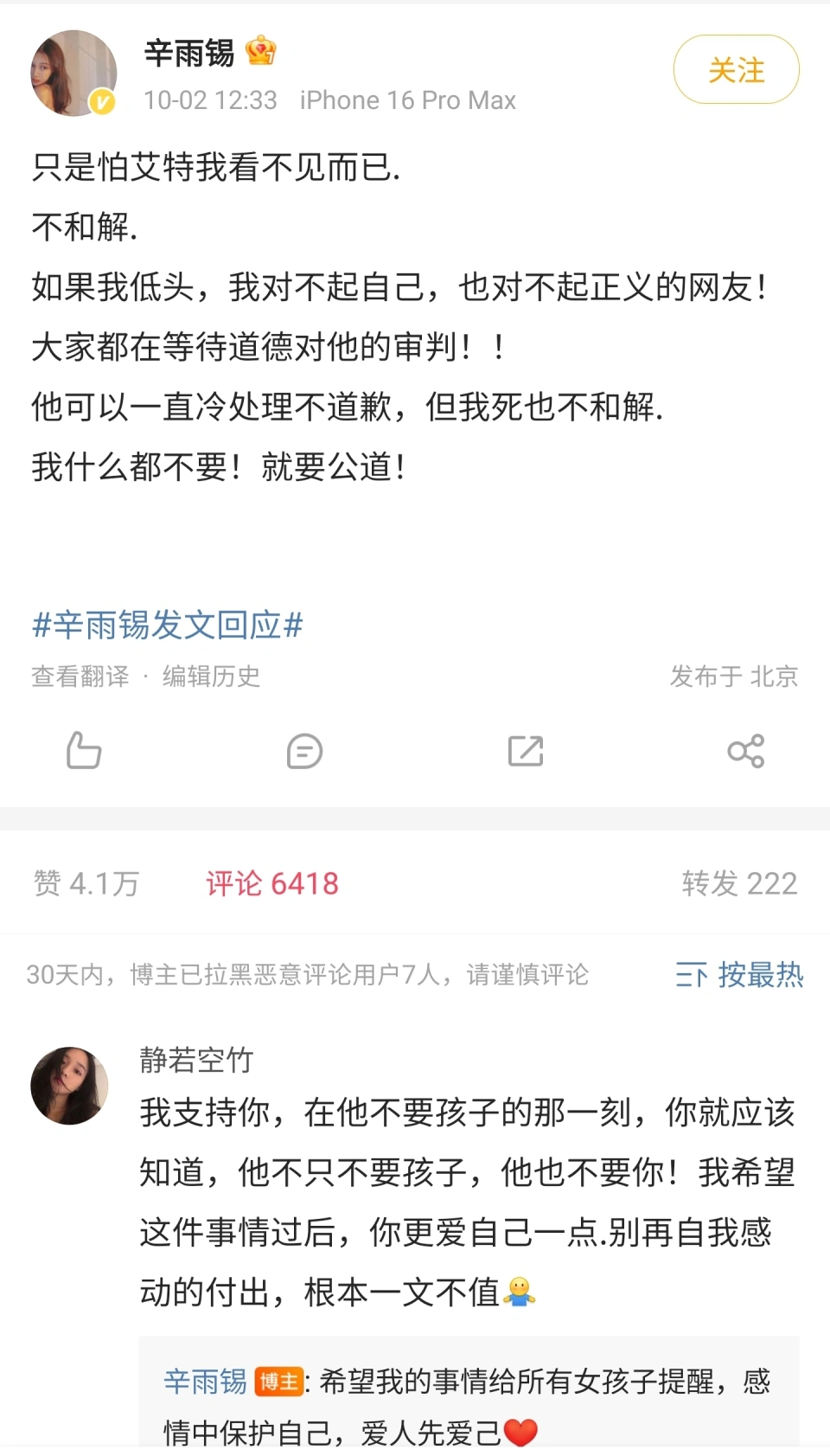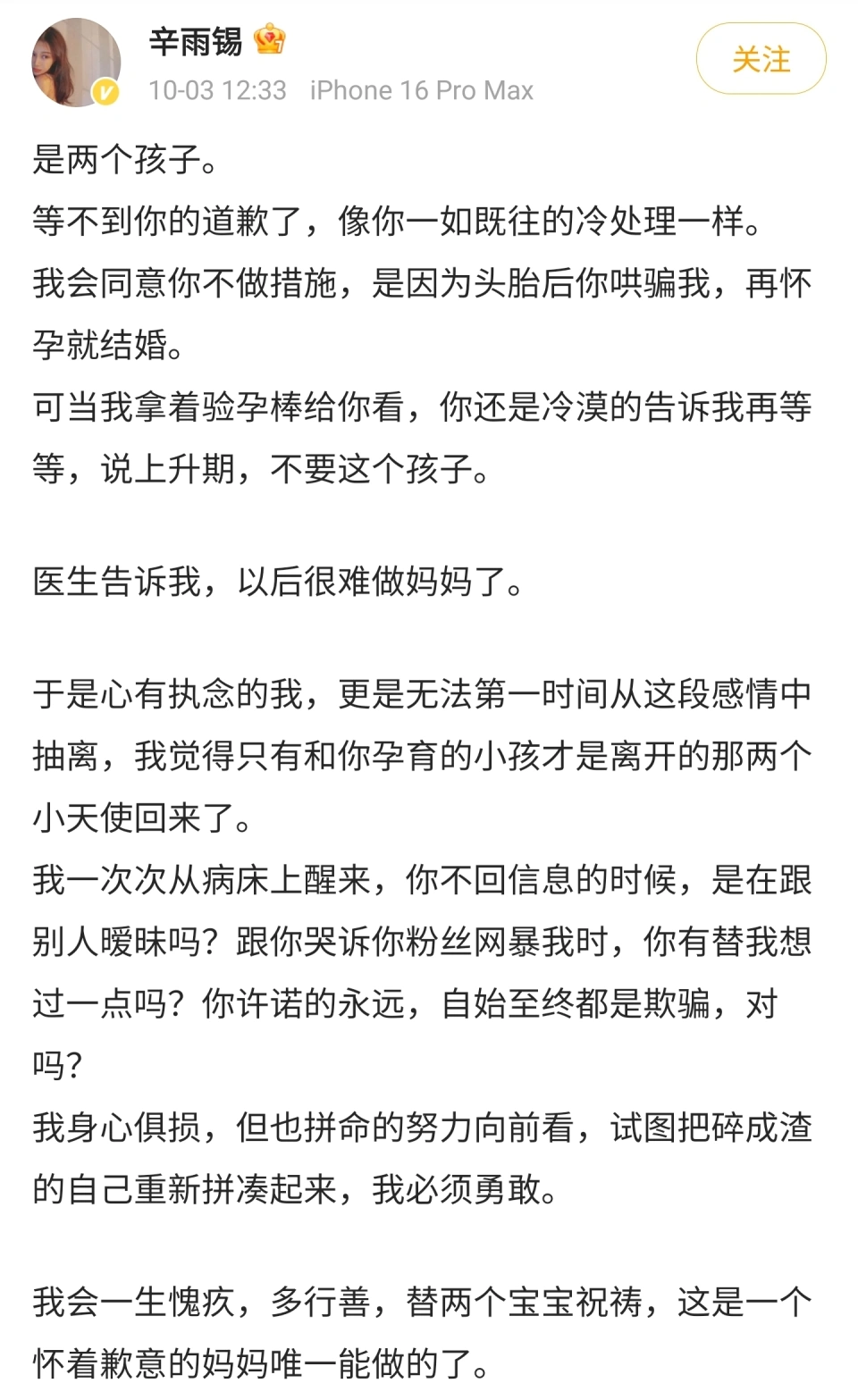 这娱乐圈的瓜,真是一波未平一波又起,一波比一波没底线啊。 10月3日,德云社那位“霄”字辈的当红艺人秦霄贤再上热搜,不外和作品没什么关系,而是被那位大胆站出来的女星辛雨锡,揭开了末了一道“遮羞布”。 德云社贵公子秦霄贤和辛雨锡的这剧情,简直比相声还曲折古怪! 女明星辛雨锡在个人账号上公开表现,本身曾为秦霄贤流掉了两个孩子,这不但仅是身段上的伤痛,更是心灵上无法愈合的裂痕。 在她看来每一次的流产,都是对生命的不尊重,更是对女性情绪的极大伤害。 本身很大概已经没办法再次怀孕。 故意思的是,第一次怀孕,就是秦霄贤没有做安全步伐。 其时两人没有选择要孩子。 而后,当再次发生关系的时间,男方依然想不做安全步伐,而且“哄”着女方说,假如再次怀孕的话,那两人就“完婚”。 可让人唏嘘的是,辛雨锡在第二次怀孕后。 满心等待着秦霄贤达兑现“再次怀孕就完婚”的承诺。 效果却等来了一句冷冰冰的“再等等”。 那一刻,她的心估计比手术室里的温度还要低吧。 而秦霄贤的冷漠处置处罚,不但是对辛雨锡的暴虐,更是对孩子情绪的漠视。 以是辛雨锡不吝通过曝光本身的隐私,为的就是揭露秦霄贤的“真面目”。 话说,我个人以为,秦霄贤这方面做得不好,辛雨锡这方面,着实也有问题。 发生关系的时间,不做好安全步伐掩护本身,渴望着男方末了“娶”本身。 这本身就够离谱了。 背面知道本身再流产就不好怀孕了,她居然还乖乖再次把孩子拿掉。 你说她是不是傻? 同样是女明星,人家张碧晨怀孕了华晨宇的孩子以后。 硬是瞒着各人把孩子生下来了。 华晨宇不想承认也得硬着头当爸爸。 辛雨锡也是女明星,人气不如张碧晨,想偷偷把孩子生下来更容易。 她到底是怎么想的,被秦霄贤忽悠成如许…… 说到这个“忽悠”,我就不得不提提咱们德云社的“宗师”郭德纲老师了。 俗话说得好,“学艺先学德”,郭德纲在相声剧场里,可是忽悠了不少本身的“铁杆粉丝”。 可德云社这“德”字招牌,迩来似乎有点风雨飘摇啊。 他总是在台上讲着家风严谨、教育有方,可现实呢? 徒弟们一个接一个地由于私生存问题被推到风口浪尖,这真的只是巧合吗? 从秦霄贤到张九南,以致是本身的儿子郭麒麟。 这一桩桩一件件,哪一件不是让人大跌眼镜? 娱乐圈里,其他公司要是碰到如许的环境,估计早就头疼不已了,可德云社呢?似乎总能以一种“迷之自大”的姿态,继承他们的相声古迹。 不外话说返来,辛雨锡的大胆发声,照旧值得我们点赞的。 她用本身的履历,给全部女性提了个醒:在爱情里,千万不要盲目断送本身,更不要轻信那些不负责任的承诺。 末了,渴望德云社能够正视这些问题吧。 除了增强艺人的品行教育,不要让“德”字招牌蒙羞。 更要做的,照旧正面回应问题,来一个“办理方案”。 封杀一个秦霄贤,对于德云社来说,总好过全员的口碑崩塌,你说呢? |