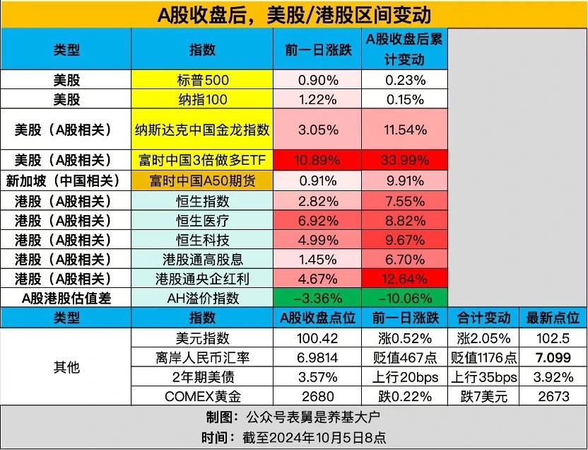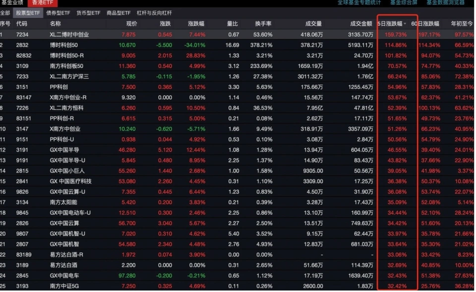 财联社10月5讯(记者 闫军)买不到A股,跟踪A股指数的港股ETF成为最强平替。 整个假期,港股ETF成为资金游乐场,有跟踪科创板的港股ETF盘中一度飙升至234%,高涨幅同时潜伏着高风险,溢价消失的回落,让但斌都提醒“暴涨之后的暴跌”。 3只港股ETF单周涨幅翻倍 港股仅在10月1日休市一天,延续最强反弹。不少指数仅用5个交易日就收复年内失地,以医药板块为例,恒生香港上市生物科技指数,近5日涨幅24.9%,年内收益率转正至5.78%,恒生医疗保健同期收益率23.66%,年内收益率为2.98%。普涨行情之下,港股各大指数年内收益率险些均收正。 此前存在感不高的港股ETF在国庆假期期间狠狠刷了一波存在感。 2日上午,南边东英科创板50指数ETF暴涨234.3%,基金公司盘中告急发布风险提示,存在二级市场大幅溢价等交易风险,收市前涨幅回落至29%。当天仍有博时科创50ETF、XL二博时中创业ETF等基金收盘涨幅到达106.19%、60.22%。 到了3日,港股略有回调,ETF稍显岑寂,多只ETF有所回调。到了4日港股再度强势上涨,半导体板块发作,博时科创50-RETF、GX中国半导ETF等ETF涨幅分别到达28.83%、12.44%。 从近5日涨跌幅来看,跟踪A股指数的ETF涨幅居前。此中,XL二博时中创业ETF、博时科创50ETF、博时科创50-RETF在近5个交易日内涨幅翻倍,分别到达159.73%、114.86%以及101、82%的涨幅。此外,尚有包罗南边科创板50ETF、XL二南边沪深三ETF、PP科创ETF等8只ETF涨幅超过50%。 和本地ETF差别,港股ETF类型更多,有杠杆、反向等多种产物。以XL二博时中创业ETF为例,全称博时中国创业板指数每日杠杆(2X),据博时国际先容,这是产物是香港首只中国创业板杠杆产物。该产物旨在接纳以掉期为基础的合成模拟战略,也就是买入这只产物,可以实现追踪目标指数每日表现的正向2倍收益。 对于该产物大涨的缘故原由,博时国际点评指出,宏观利好政策不断是主因。继央行开启降息降准后,政治局集会公布将加大财政调治力度,同时夸大要促进地产“止跌回稳”;随后中国人民银行发布公告,公布批量下调首套、二套房的存贷款房贷利率,同时上海、广州、深圳等一线都会放松限购政策。 上述组合政策明显改善了投资者市场感情,较大水平地进步了投资者的风险偏好,而政策对于耐心资源的鼓励有助于推动长线资金进入新兴产业及高新技能板块。根据近期券商汇总的高频数据表现,半导体、消费电子等终端需求边际改善,供给格局较好的制造业、新质生产力相干的科技板块亦实现了已往一连两个季度净利润环比正增长。 博时国际还以为,随着三季报披露的到来,业绩的修复叠加投资者偏好的提拔,有望推动长期处于估值底部的创业板及科创板实现估值修复,发起关注。 ETF大涨,一方面资金一连买入,另一方面净值也在提拔。相干ETF规模也屡创新高。10月2日,南边东英恒生科技指数ETF资产管理规模突破400亿港元;4日,中原基金香港称,旗下中原恒指ESGETF规模突破100亿。 不外,有业内人士以为,在A股未开盘环境下,个别跟踪A股的港股ETF涨幅已经涨幅过高,投资者必要留意溢价、感情降温等风险。 中国资产正在被爆买 一涨解千愁。美联储降息以来,海外资金回流港股显着,随着国内超预期的货币政策,更是掀起A股、港股大崭∏常国庆假期,港股仅休市一天,整个假期,港股吸引了环球投资者眼光。只管有一天回调,很快收回跌幅。 停止10月4日收盘,在A股休市期间,环球市场变更来看,中国资产正在被一连爆买。对比来看,美股中标普500指数和纳指100指数区间涨幅分别为0.23%、0.15%,而纳斯达克中国金龙指数区间涨幅11.54%;富时中国3倍做多ETF则大涨近34%;港股方面,恒指指数涨幅7.55%,央企红利资产涨幅居前,港股通央企红利大涨12.64%。 海外投资机构也紧盯中国资产,整个假期,内外资机构电话集会、研报、交易台信息不断涌现。 野村证券在10月2日的研报中指出,此次政策鼓励相称成功,并以为接下来政府肯定有一系列财政措施和其他支持性政策。不外野村也提醒,个人投资者,尤其是那些太年轻而没有履历过之前痛楚兴衰的投资者,都急于开户,担心错过似乎一生惆怅的反弹。投资者在享受了最初的狂欢之后,大概必要关注最倒霉的环境。 不外,更多外资机构给出相对乐观的观点,大摩短期观点指出,对中国的市场感情在已往一周发生了变革,仓位也有了边际调解,但仍旧有进一步调解的空间。近期的零售投资者重要是通过ETF得到广泛的Beta敞口的情势出现,而不是单一股票。CTA在已往两周购买了估计超过150亿美元的中国股票。同时,大摩指出,对看涨期权的需求创下汗青新高。 不外值得留意的是,对冲基金也在购买中国股票,但是大部分需求来自亚太地区账户,美国账户仍旧或多或少处于观望状态。 美银证券交易台在答复客户的8个标题中给出对近期A股、港股等看法。起首,关于中国资产是否低配上,美银证券以为,已往两周,长期投资者净买入了34亿,这与此前疫情之后反弹时买入金额类似,但是时间快得多。在没有得到共同基金9月、10月持股数据之前,很难量化仓位,但是从交易流量来看,当前设置中国资产的仓位已经相称满了。 对于是否在当下购买A股还是港股时,美银证券以为,港股当前前瞻市盈率已经接近10倍,受动量驱动反弹超预期,但风险回报并不是很有吸引力;如果对市场加入者动物精神的出现以及2014至2015牛市相似性判断正确的话,A股的估值大概会比H股大