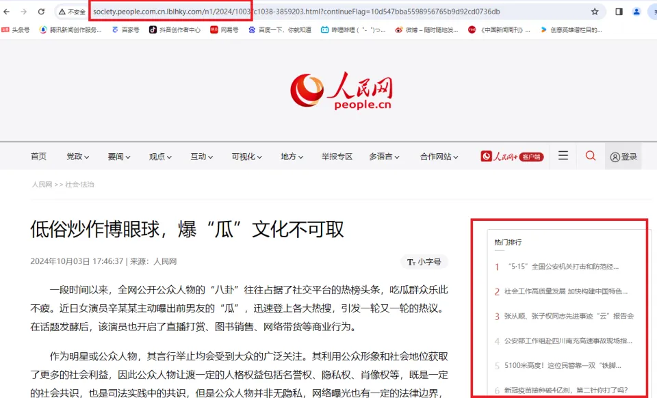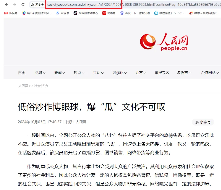 自从9月26日德云社秦霄贤前女友辛雨锡曝光秦霄贤多次劈叉上了热搜之后,这件事就开始了渐渐发酵的过程。 固然辛雨锡和秦霄贤脱粉的大粉一连曝光了不少事情,包罗辛雨锡为秦霄贤两次有身两次堕胎如许的“猛料”,但这件事不绝没有彻底爆发。 10月3日和4日,随着一篇文章的发酵,这件事闹大了。 一、人民网评辛雨锡? 从10月3日晚间开始,秦霄贤的粉丝和德云系自媒体就在网上到处散播一张截图和一个链接,点击链接进去可以发现这是一篇文章《低俗炒作博眼球,爆“瓜”文化不可取》,发布时间是2024年10月3日,发布平台是人民网社会·法治频道,责编是郝孟佳和梁秋坪。 这篇文章对女演员辛某某曝光男友“瓜”的运动举行了点评,纵观全文主题,重要是在品评辛某某同时下令掩护公众人物的隐私。 看起来这篇文章像是在力挺秦霄贤和品评辛雨锡,因此该文被秦霄贤粉丝和德云系自媒体广泛转发。 但是,也有不少网友以为,这篇文章真实性存疑,并不愿定真是人民网所发。 二、疑点重重 通过对比人民网社会·法治频道的其他文章,发现《低俗炒作博眼球,爆“瓜”文化不可取》存在多个疑点。 1、官网搜索不到 进入人民网官方网站,在社会·法治频道搜索框中输入文章标题“低俗炒作博眼球,爆“瓜”文化不可取”。 不仅精准搜索搜不到这篇文章,含糊搜索也搜不到,这就奇怪了,既然是人民网的文章,为什么在人民网网站却搜不到? 2、IP所在存疑 《低俗炒作博眼球,爆“瓜”文化不可取》这篇文章的链接里关于平台的域名是如许的:http://society.people.com.cn.lblhky.com/ 我们随便点开一篇人民网社会·法治频道的其他文章,发现链接里关于平台的域名是如许的:http://society.people.com.cn/ 很显着,《低俗炒作博眼球,爆“瓜”文化不可取》那篇文章的链接里好像多了一些东西,自然会导致一些网友产生质疑。 3、其他链接时间存疑 在《低俗炒作博眼球,爆“瓜”文化不可取》这篇文章右边有一栏热门排行,正常情况下那里应该是同一网站近期最热文章。 故意思的是,《低俗炒作博眼球,爆“瓜”文化不可取》这篇文章右边出现的热门文章全都是2021年5月份发布的。 我们再看人民网社会·法治频道的其他文章,你会发现文章右边热门排行里的文章都是2024年9月和10月发布的。 这就故意思了,作为人民网如许权势巨子和严肃的网站,怎么会在《低俗炒作博眼球,爆“瓜”文化不可取》旁边保举2021年5月份的文章呢?这同样是一个容易让人产生质疑的点。 4、责编郝孟佳是教诲频道记者 通过搜索《低俗炒作博眼球,爆“瓜”文化不可取》文章的责编“郝孟佳”,我们可以发现她确实是人民网的记者,但她一样寻常报道的都是教诲消息。 也就是说,郝孟佳作为人民网教诲频道的记者却成了一篇社会·法治频道点评公众人物隐私文章的责任编辑。 根据网络搜索结果,人民网记者郝孟佳在2024年9月尾10月初还在报玄门育类消息,岂非她仅仅几天时间就突然调动工作了? 以上种种疑点都让广大网友产生了猜疑,到底秦霄贤粉丝转发的《低俗炒作博眼球,爆“瓜”文化不可取》是不是真的呢? 三、辛雨锡报警 就在广大网友还在争论文章真实性的时间,辛雨锡发布了最新动态,她公开斥责了秦霄贤粉丝,同时责怪秦霄贤粉丝无视法律伪造政府网站消息,已经触碰法律红线,她第一时间选择了报警。 辛雨锡还发布了她前去公安构造报警的视频,不得不说,辛雨锡确实够智慧也够猛,一旦《低俗炒作博眼球,爆“瓜”文化不可取》这篇文章被警方认定造假,纵然和秦霄贤本人没有关系,但也同样会将这件事进一步发酵,让秦霄贤方面更加难以摒挡。 当然,在警方观察结果出来之前,固然《低俗炒作博眼球,爆“瓜”文化不可取》这篇文章确实存在一些疑点,但还是希望广大网友理智吃瓜不要人云亦云。 最后,借《低俗炒作博眼球,爆“瓜”文化不可取》这篇文章的结语作为本文结语: 网络空间不是法外之地。 |