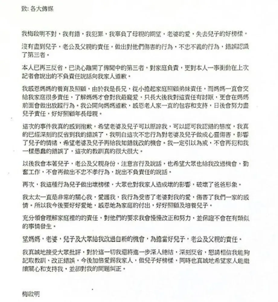 梅启明曾表现,对老婆提出仳离感觉无所谓,并夸大自己对老婆没有亏欠,不停有寄钱给老婆,尚有大量的票据可以作证。媒体形容,从他的态度可以看出,他对这段婚姻没有眷恋,当女方提出仳离时,他绝不夷由同意了。