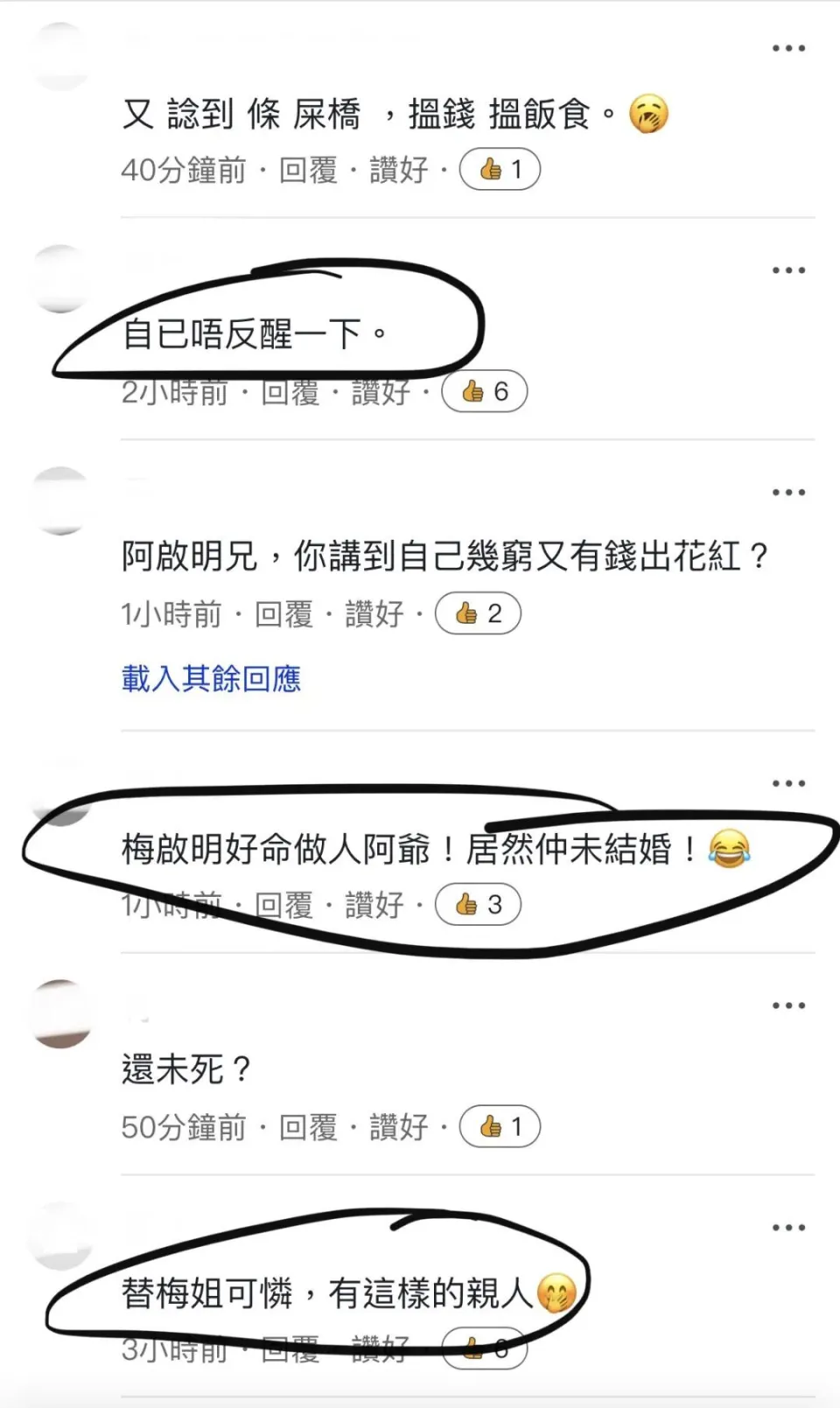 尚有网友指出:“又想到鬼点子来赢使用饭,自己也不反省一下。”“说自己那么穷,哪来的钱出花红悬赏寻人?”“都可以做爷爷了,居然还没结婚,真替梅艳芳可怜,有这样的亲人。”